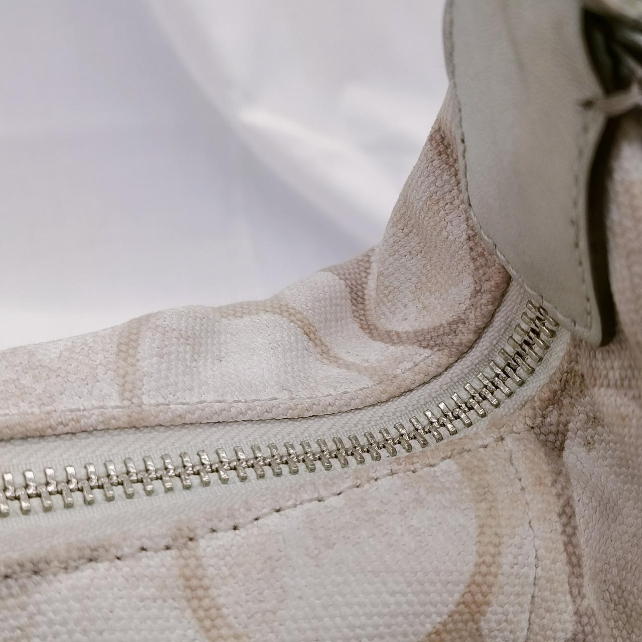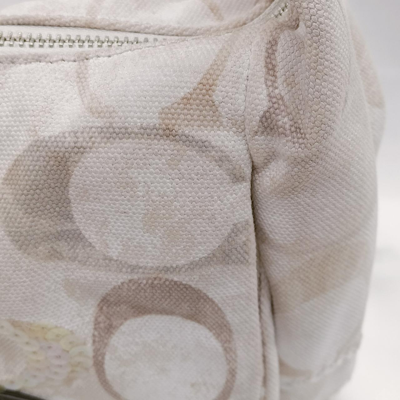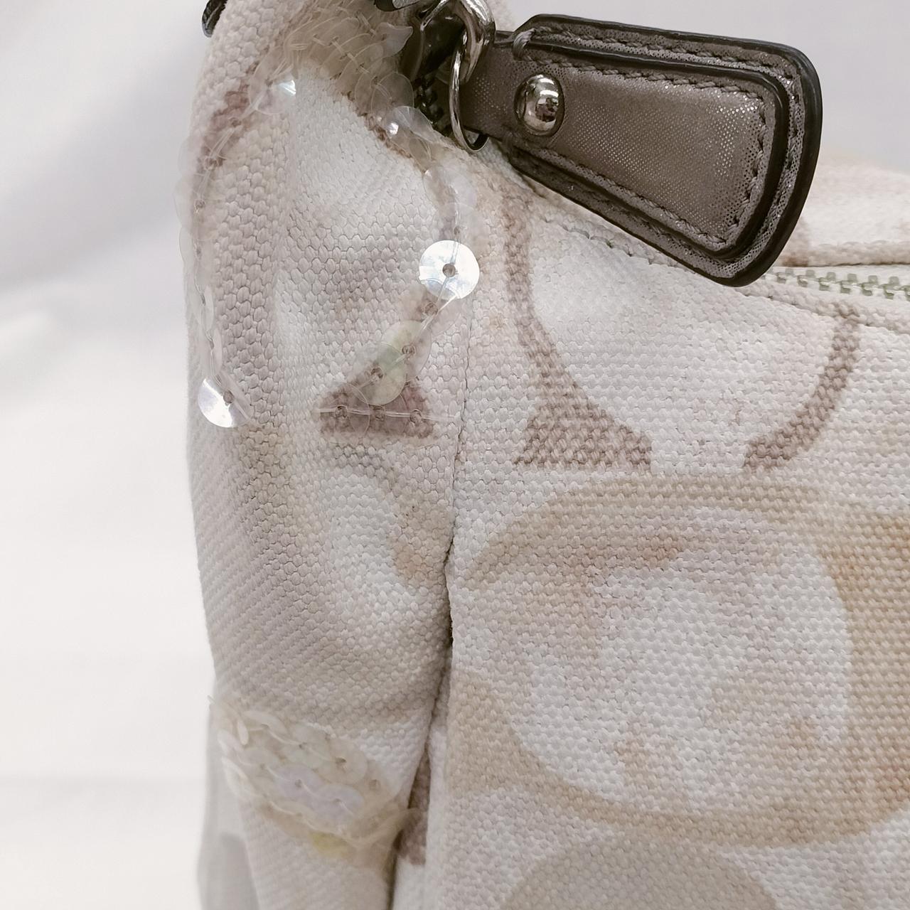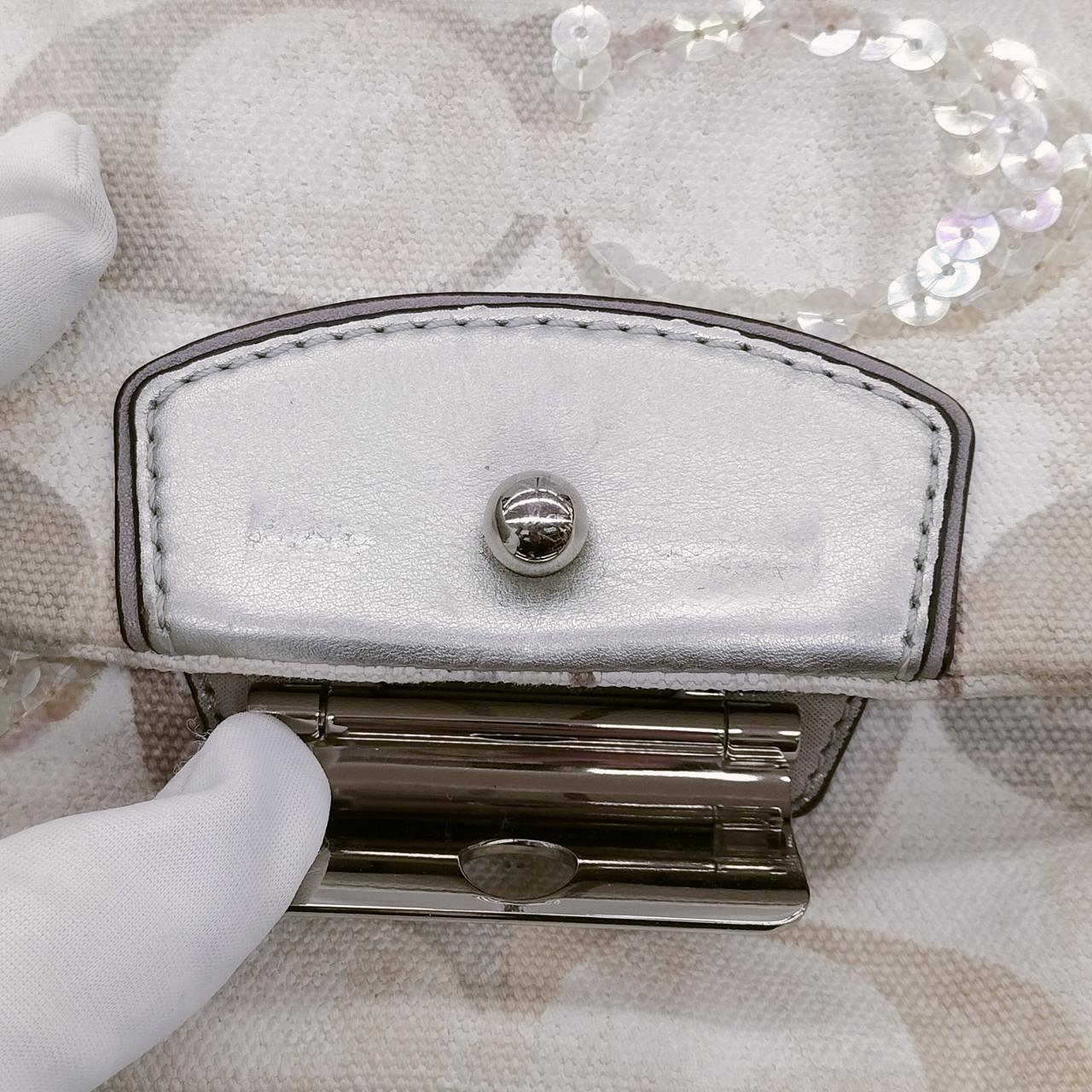 COACHのハンドバッグです。コンパクトながら、普段使いのお財布、化粧ポーチ、スマートフォン等もスッポリ収まります!ロゴマークにところどころビジューが入っているのでお洒落です!