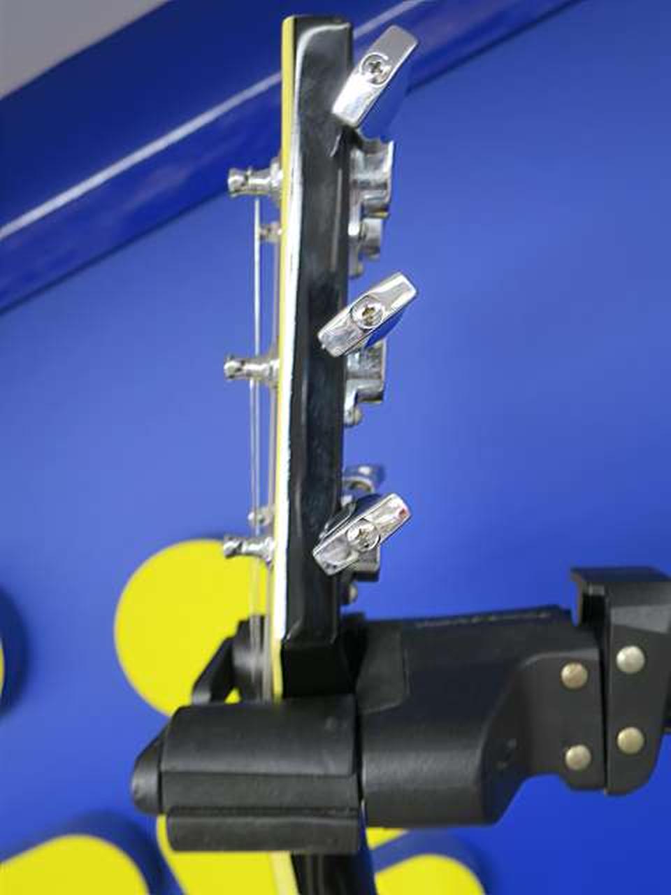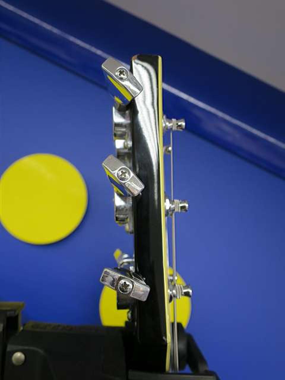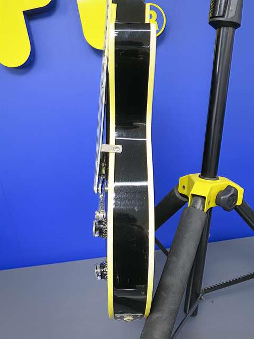 ボディにはマホガニ、指板にはローズ、レスポールカスタムをベースにミラーピックガードなどジョンサイクス氏らしい仕様となっています |