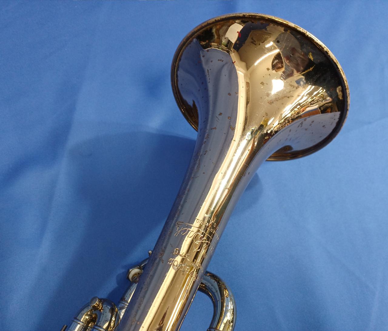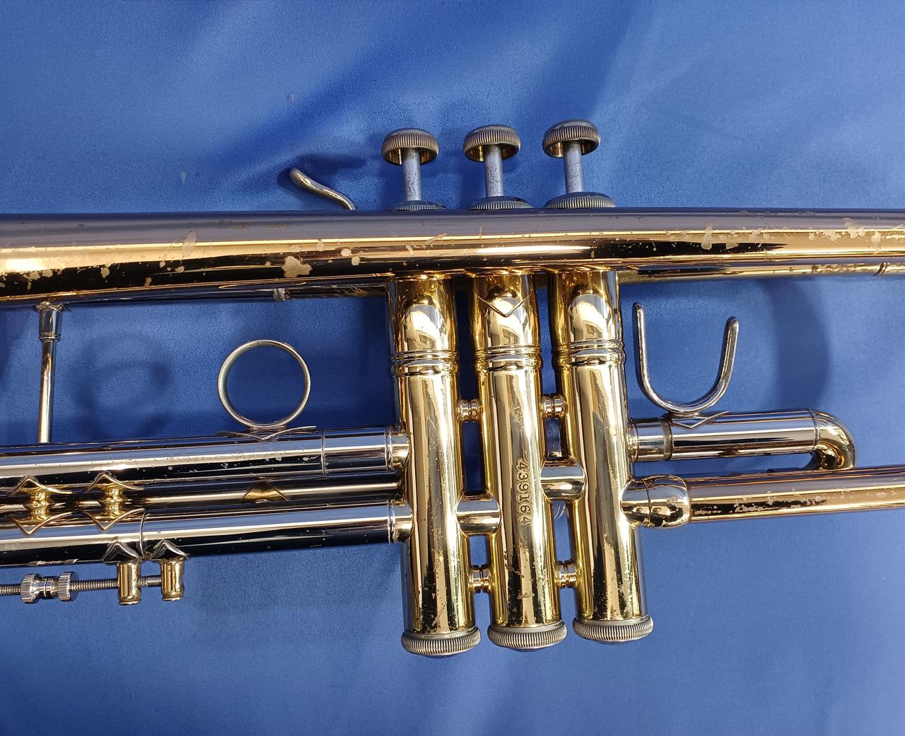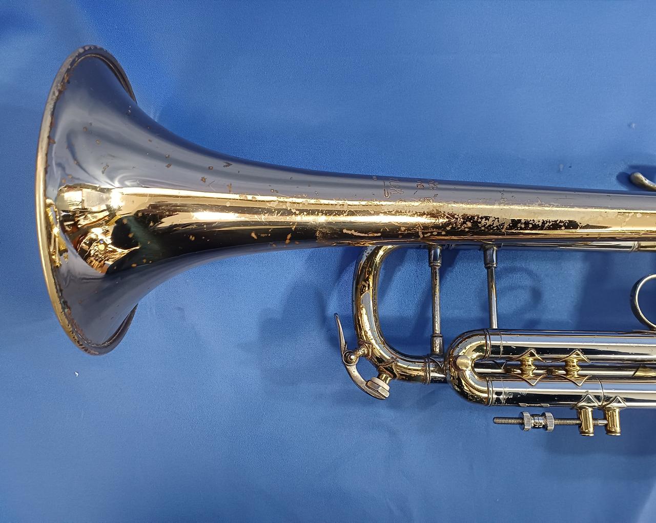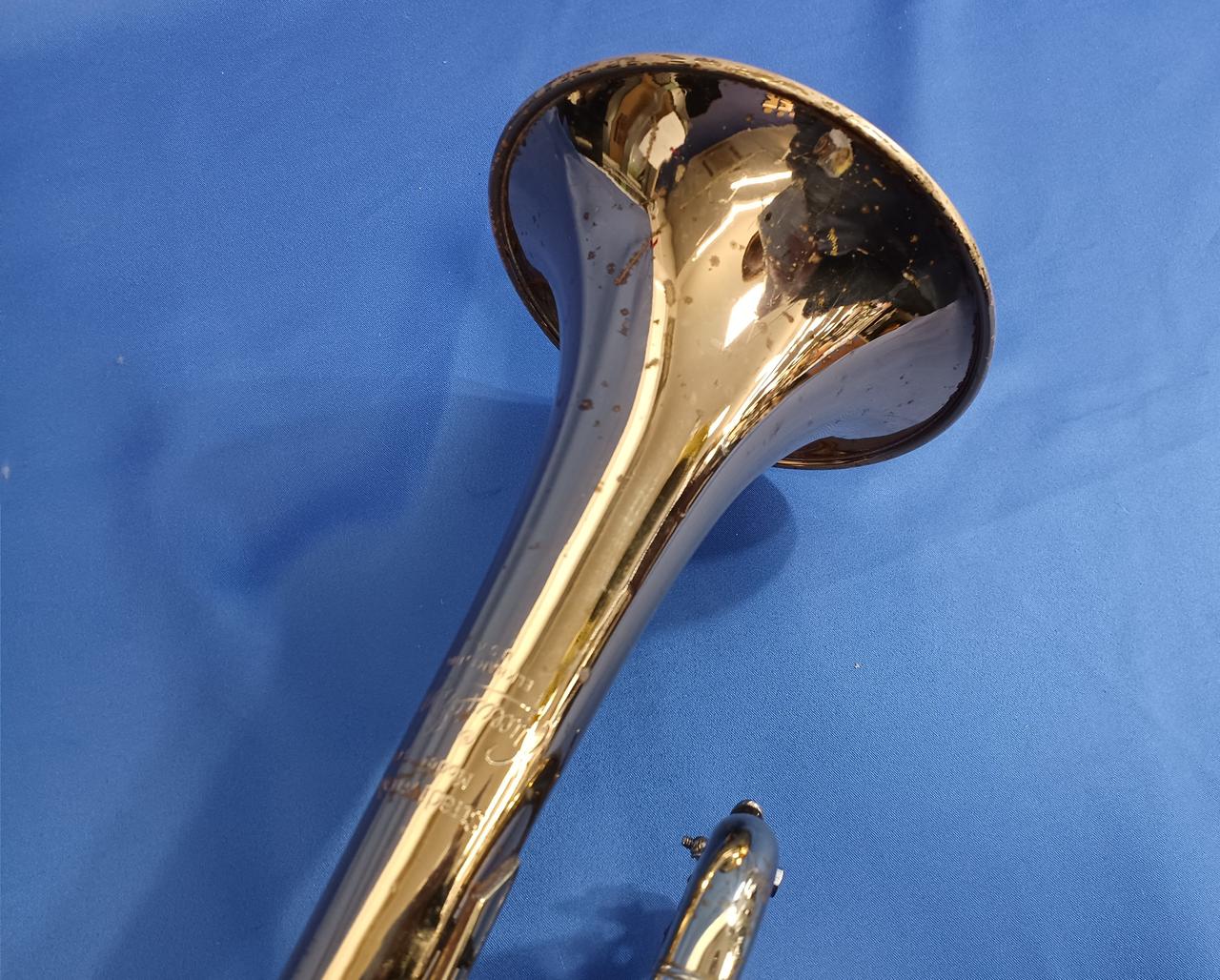 キズ:全体的に傷や汚れなどのダメージがあります。マウスピースもメッキ剥がれあり。ケース中身はBACHの記載ですが、外側にSelmerの記載があります。 |