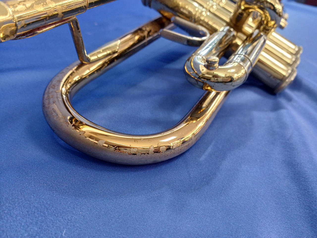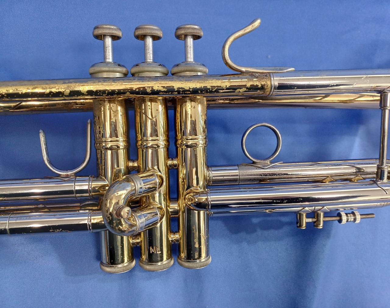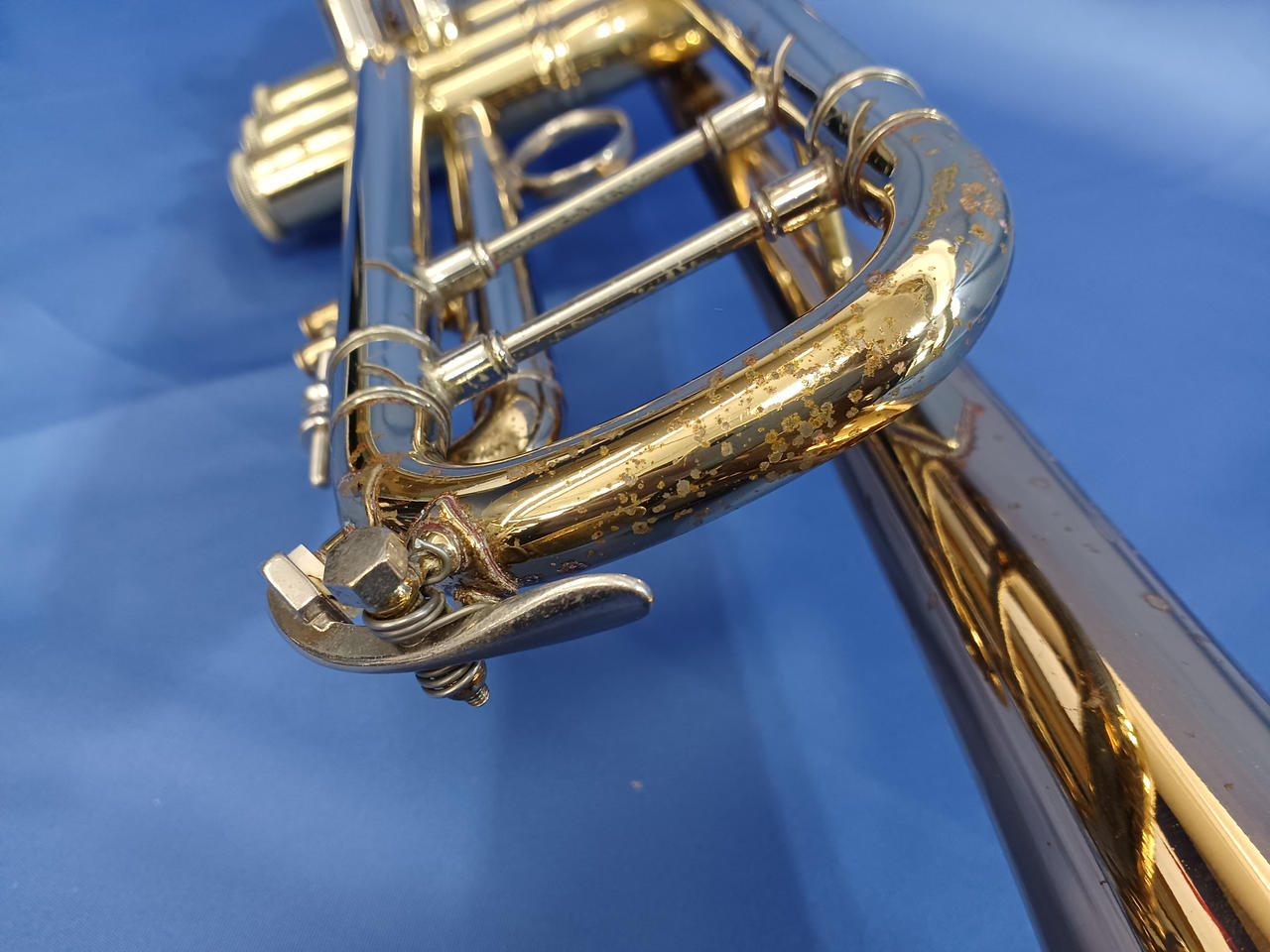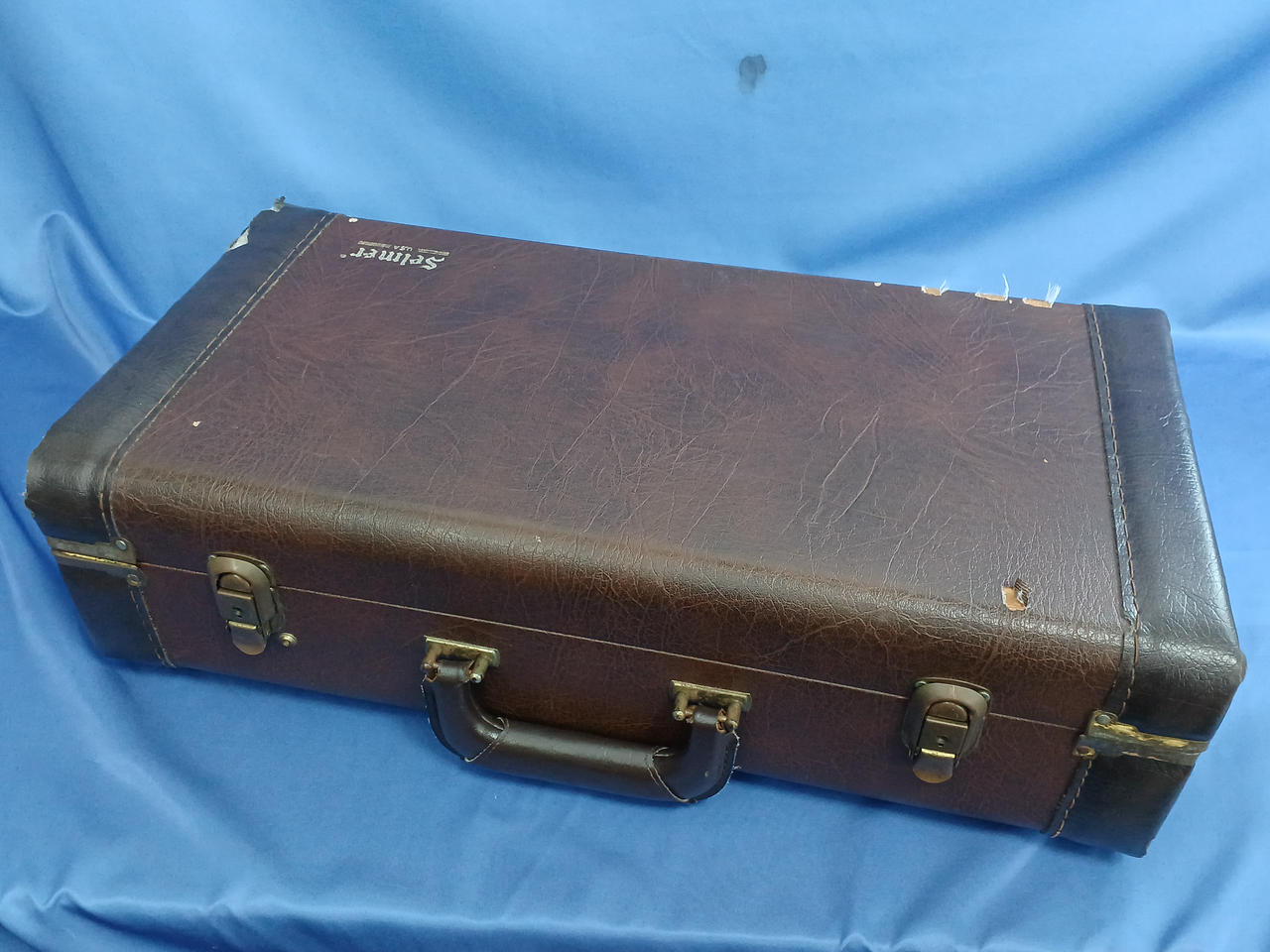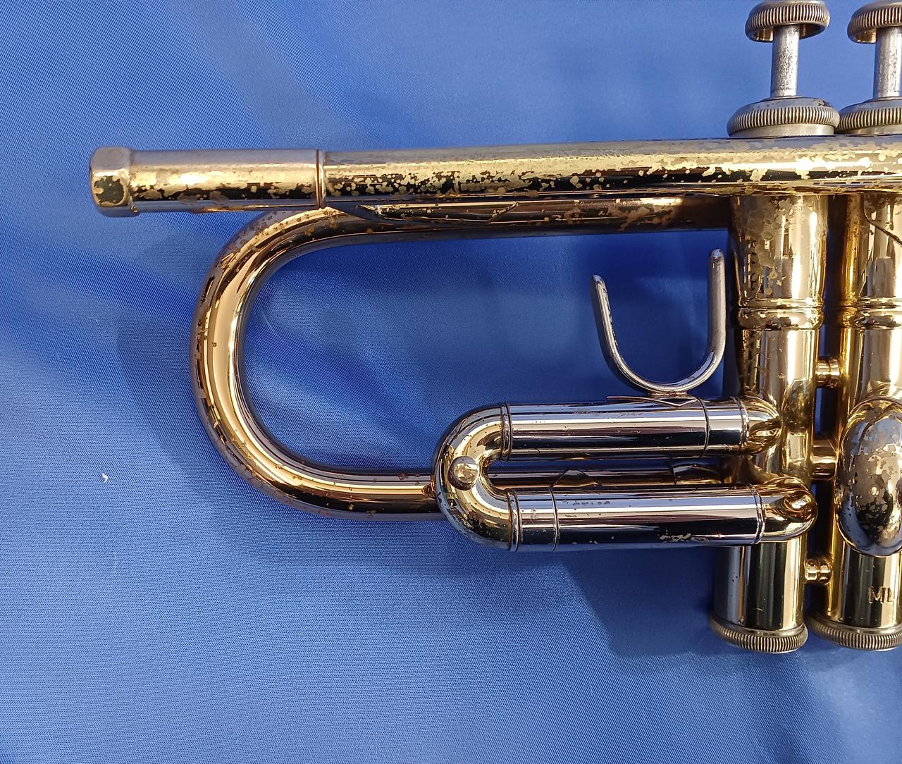 キズ:全体的に傷や汚れなどのダメージがあります。マウスピースもメッキ剥がれあり。ケース中身はBACHの記載ですが、外側にSelmerの記載があります。 |