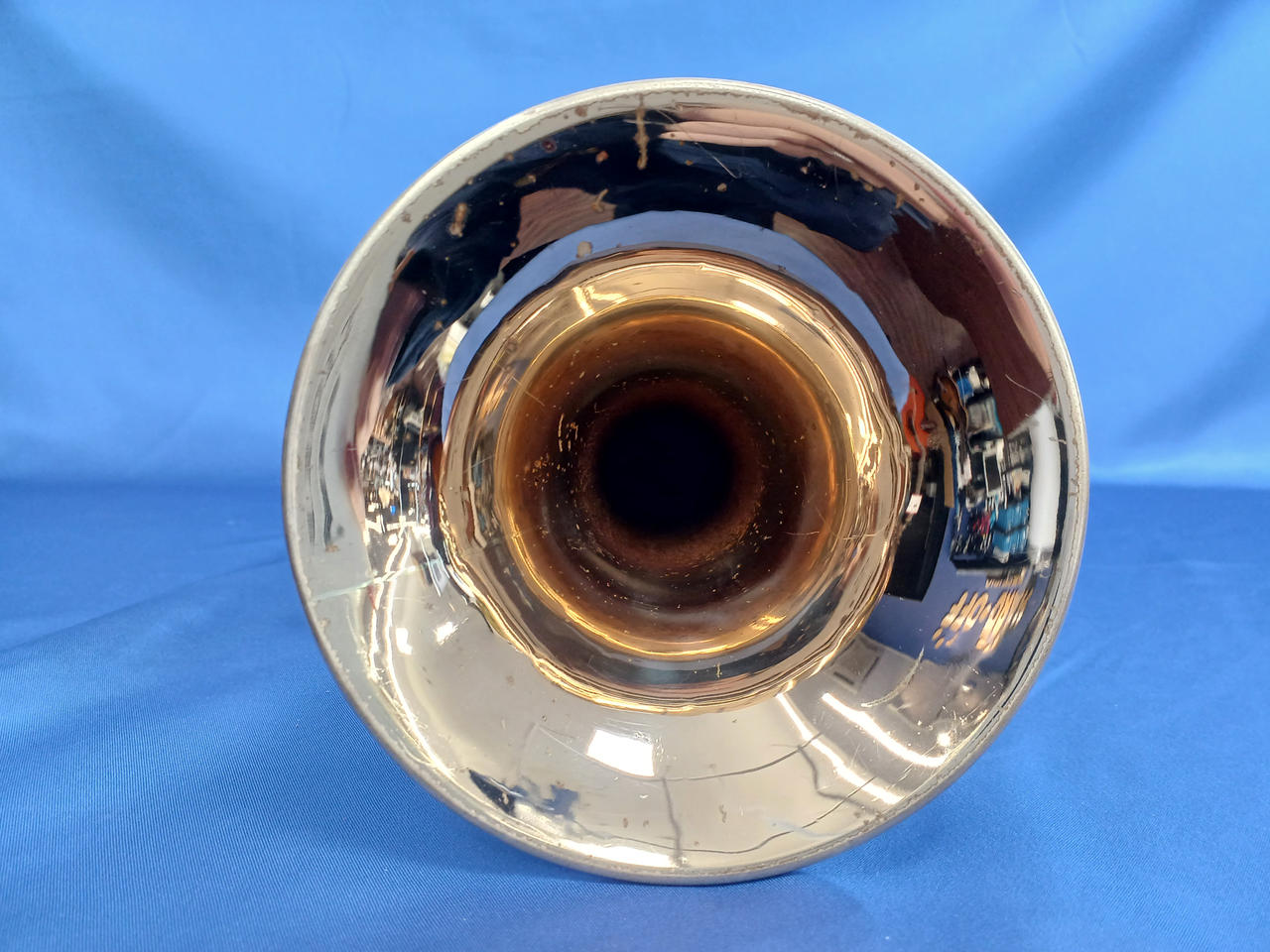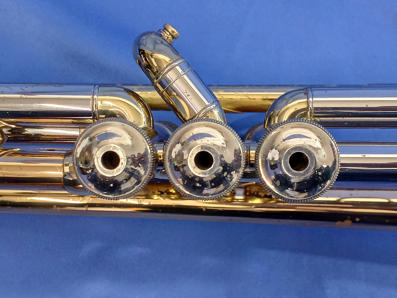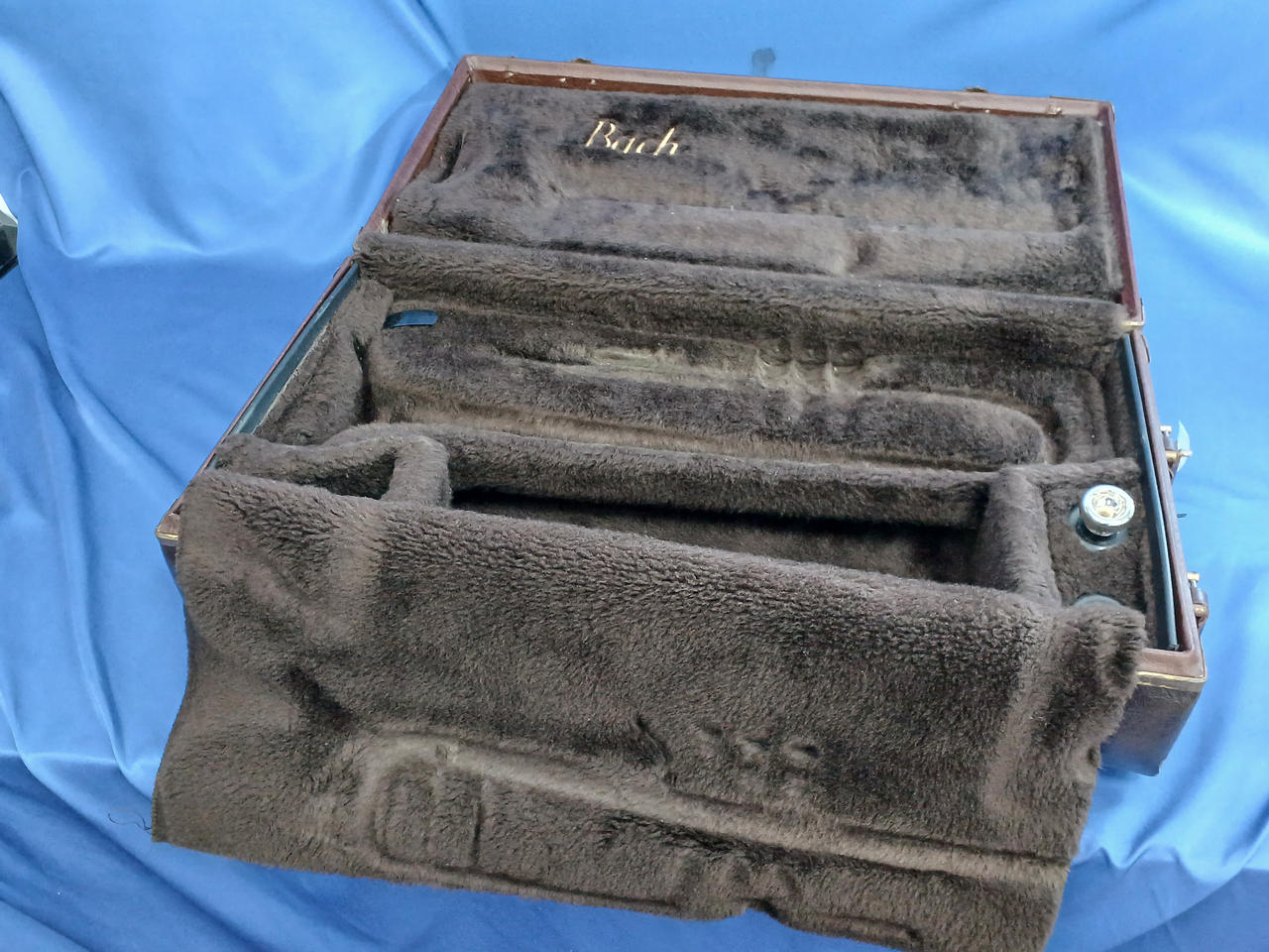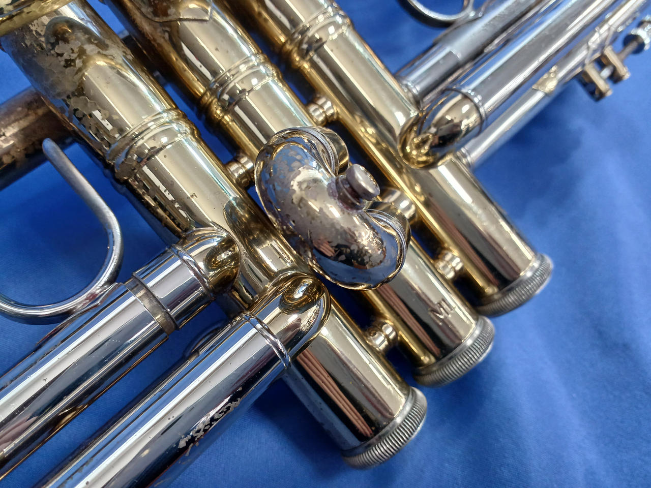 キズ:全体的に傷や汚れなどのダメージがあります。マウスピースもメッキ剥がれあり。ケース中身はBACHの記載ですが、外側にSelmerの記載があります。 |