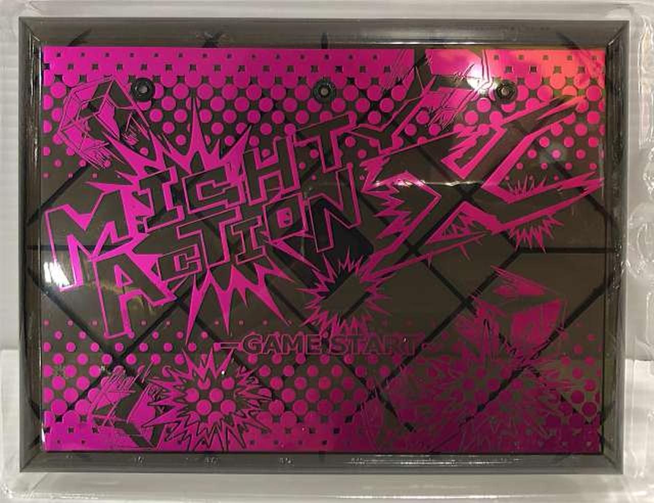 エグゼイドの変身時に浮かび上がる劇中ゲーム「マイティアクションX」のグラフィックをモチーフにしたデザインの特製台座が付属。 |