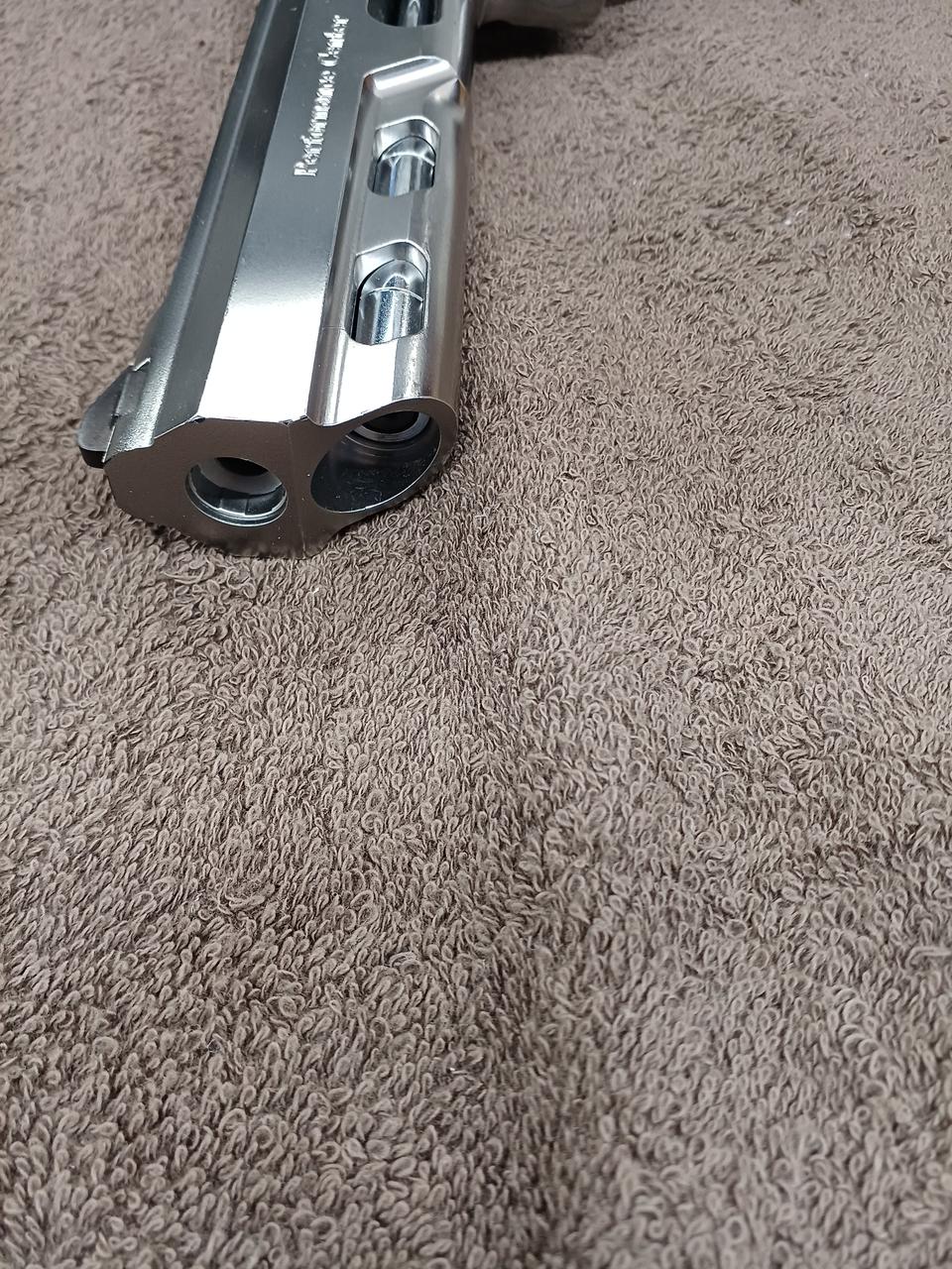 反動を抑えるためのウエイト入りバレルを備えた競技用エアーソフトガンです。