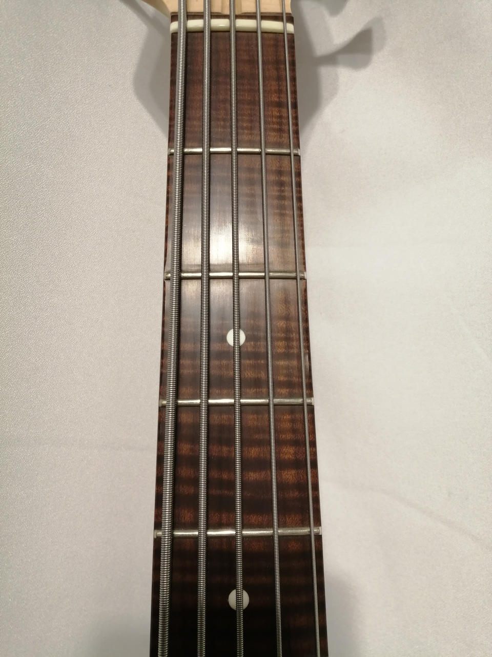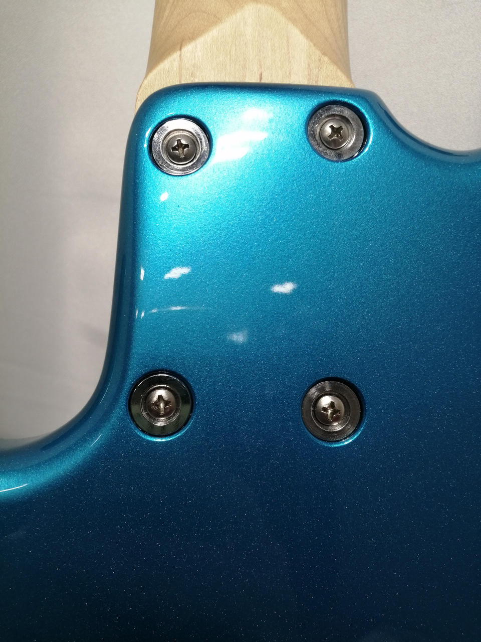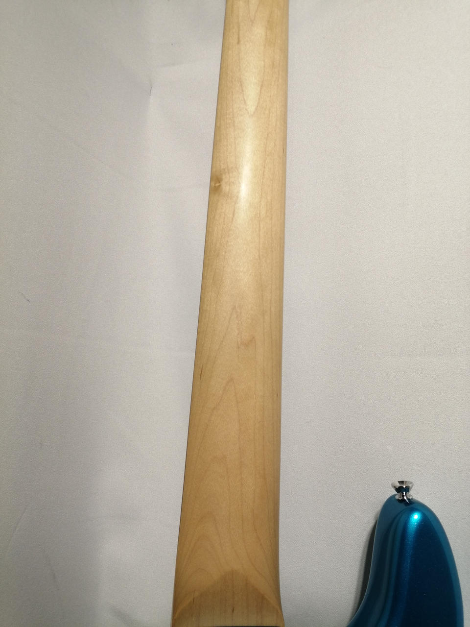 アルダーボディにメイプルワンピースネック、オーダーオプションとなるローステッドフレイムメイプル指板。 |