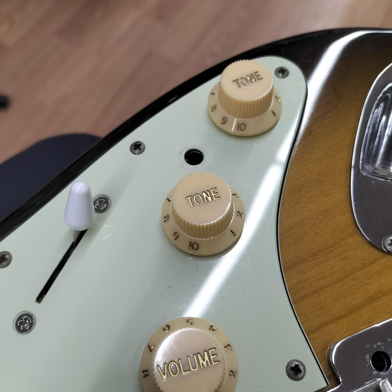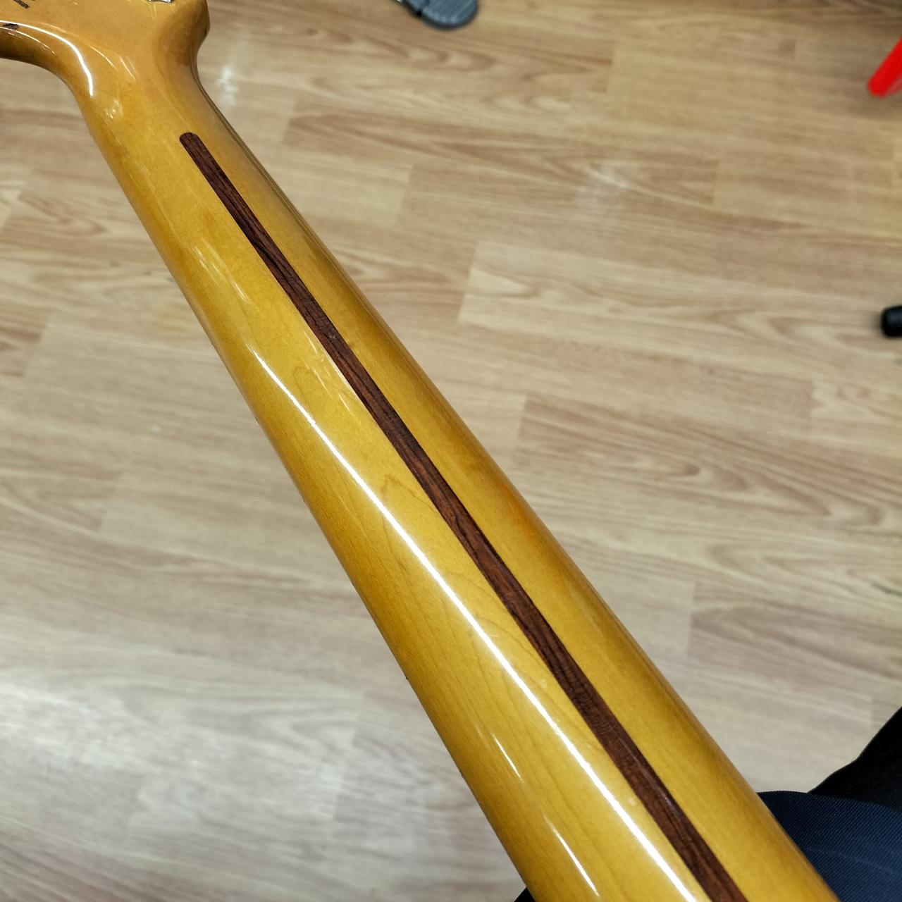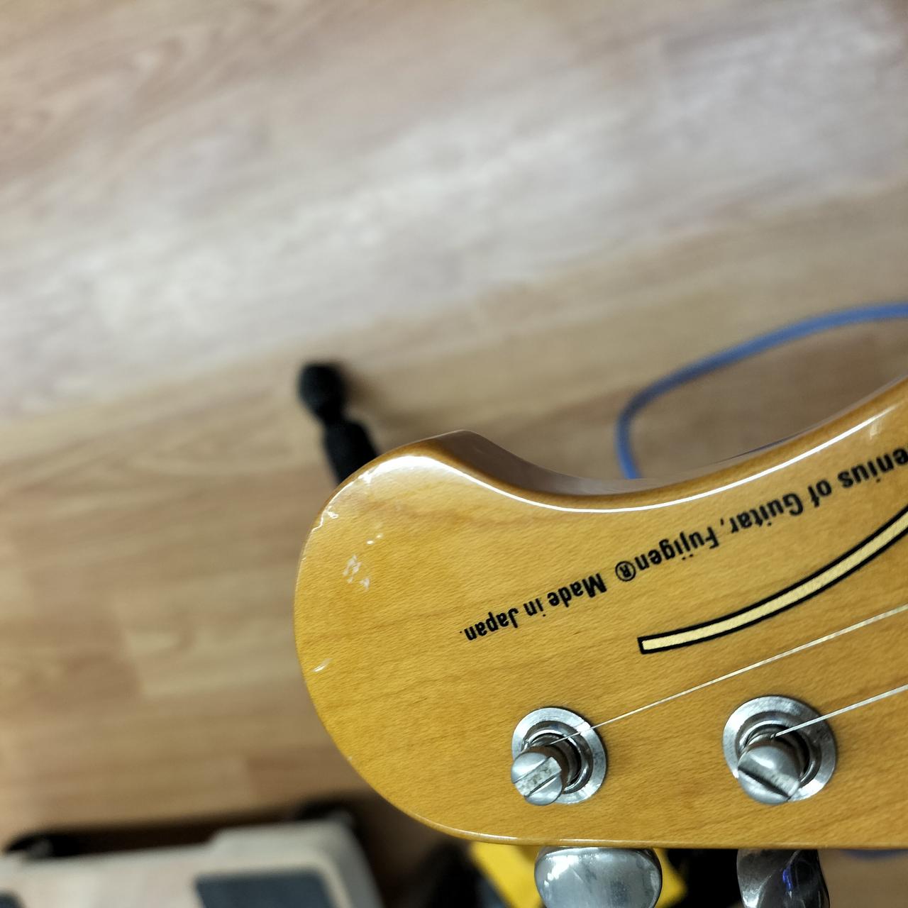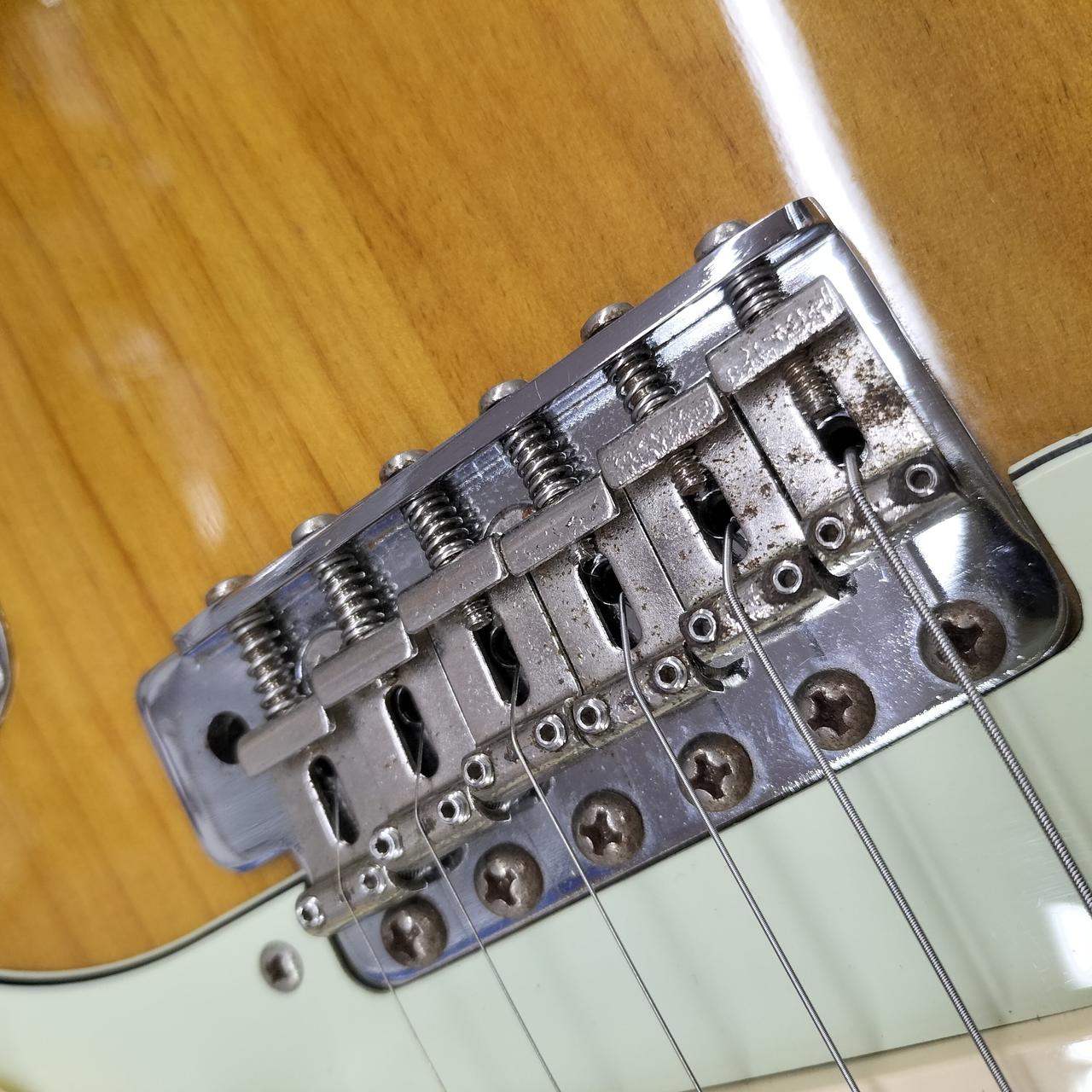 全体的に打痕あり。5.6弦のサドルのイモネジ穴がつぶれているため弦高調整できません。ピックガードにコントロール用の穴があります。おそらくPU交換されてます。蝋引きワイヤーで品質の良いものに見えます。 |