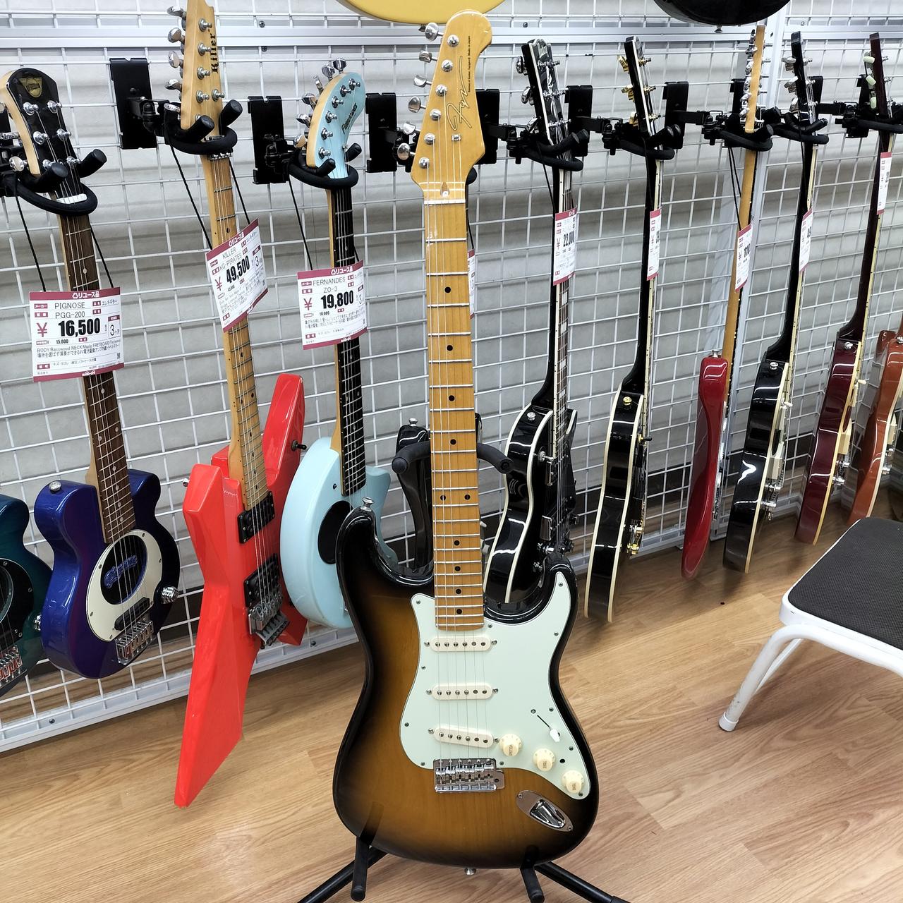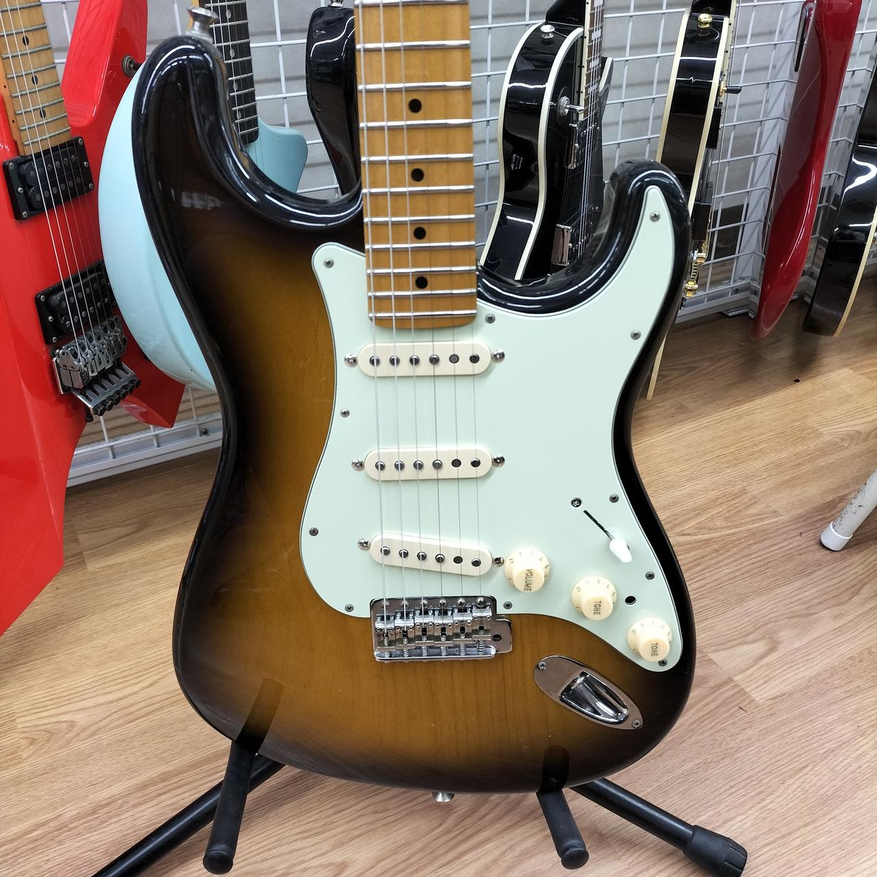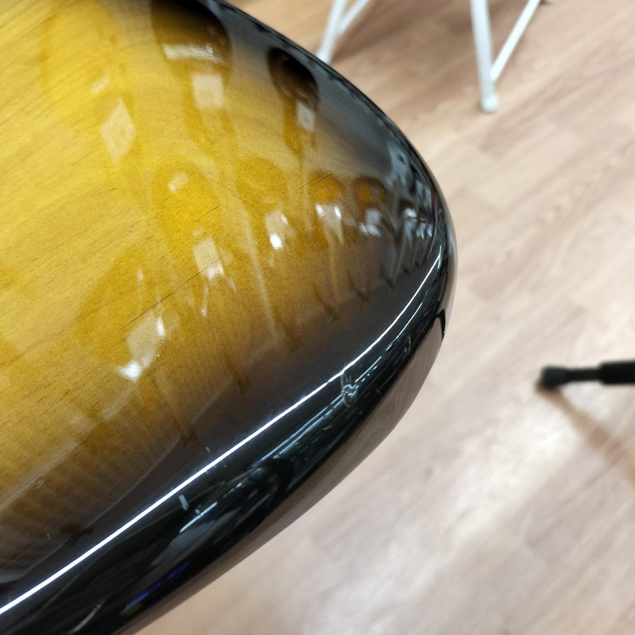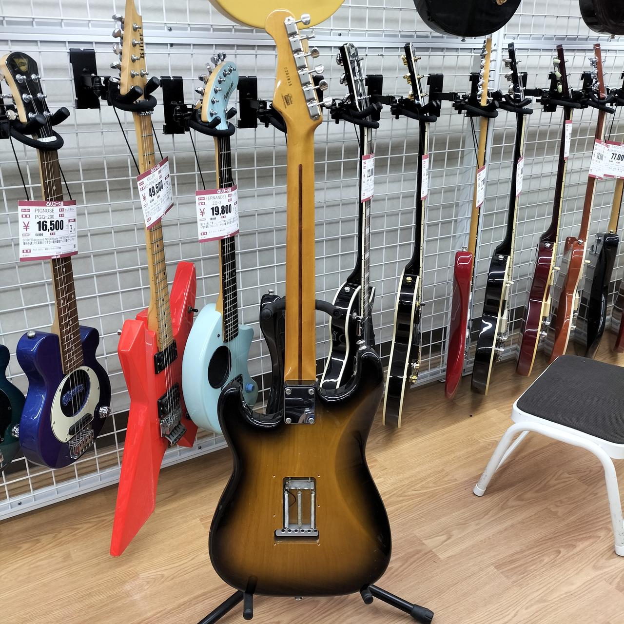 全体的に打痕あり。5.6弦のサドルのイモネジ穴がつぶれているため弦高調整できません。ピックガードにコントロール用の穴があります。おそらくPU交換されてます。蝋引きワイヤーで品質の良いものに見えます。 |