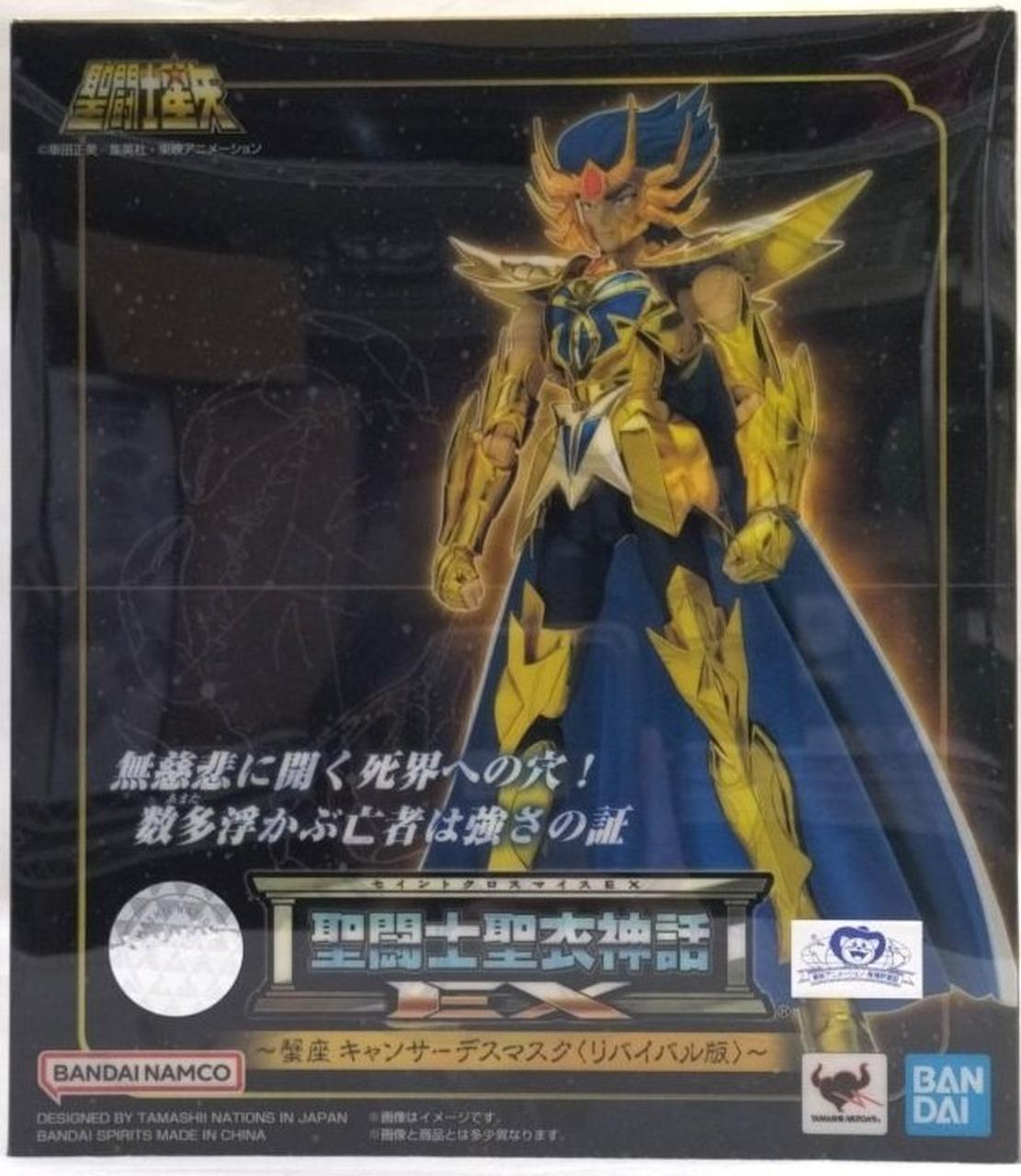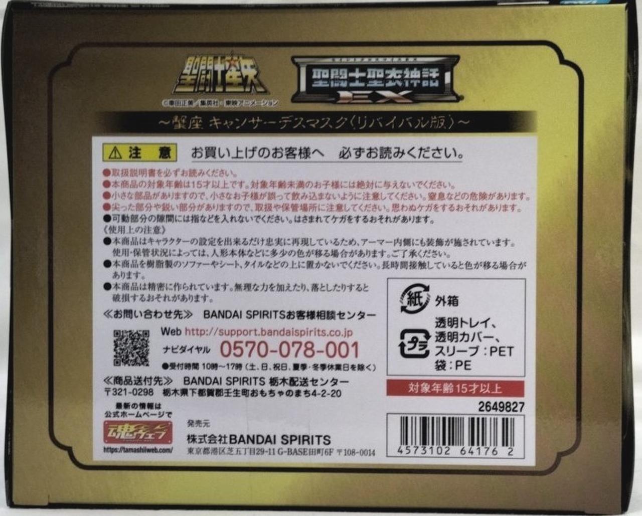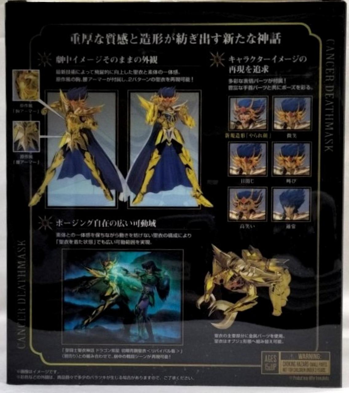 表情パーツはデスマスクの悪さを秘めた笑みや高笑い顔などに加え、新規ボーナスパーツとして、劇中の印象的な散り際を再現可能なやられ顔が付属!EXシリーズのリバイバル版でおなじみの「聖衣分解装着図」も付属。 |