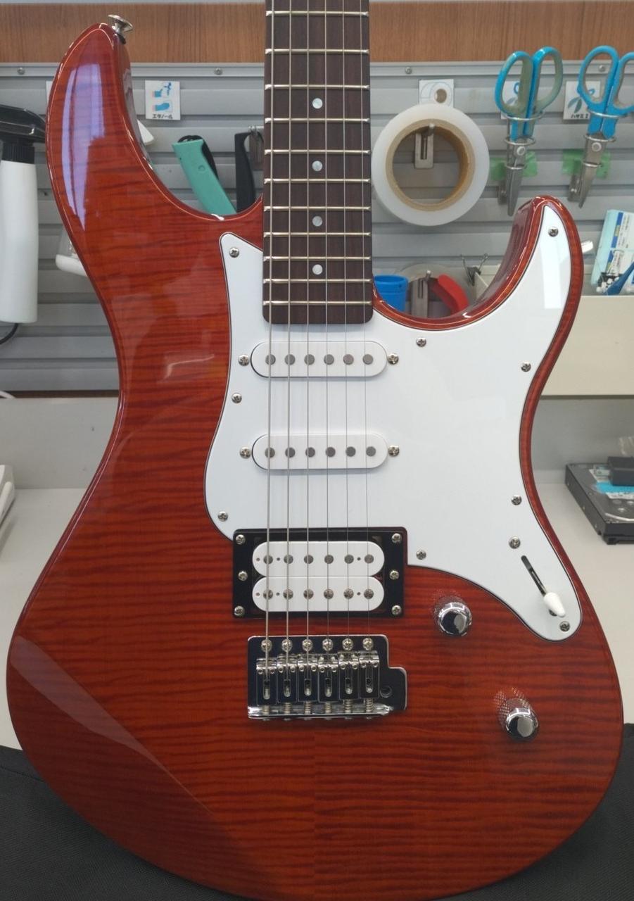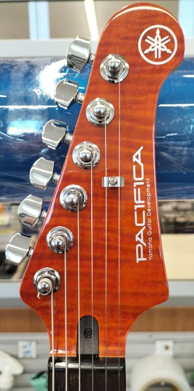 PACIFICA112Vをベースに、ボディトップとヘッドストックに美しいフレイムメイプルを配した個性的で高級感あふれるモデルです。リアのハムバッキングピックアップにコイルタップ機能を搭載。 |