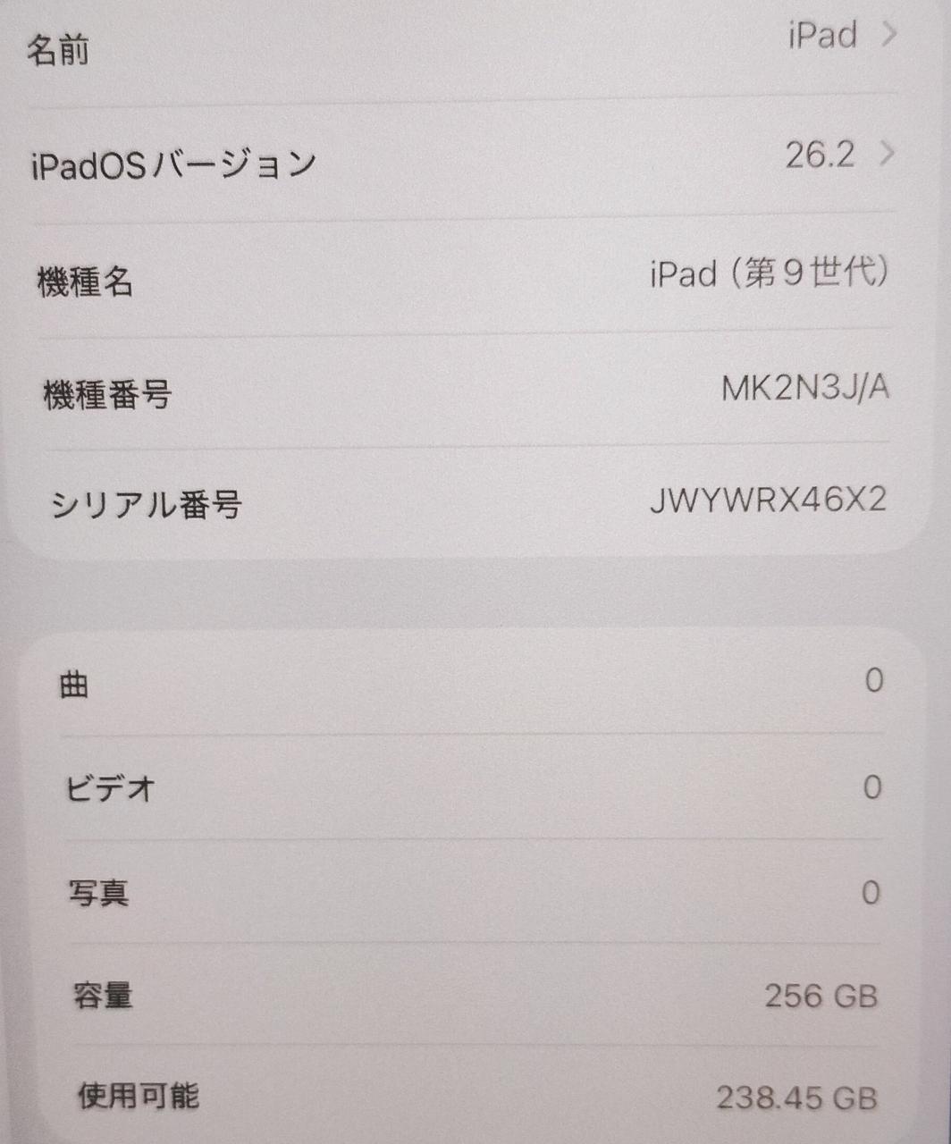 iPadOS:26.2、CPU:Apple A13、Wi-Fiモデル、Bluetooth4.2対応 |