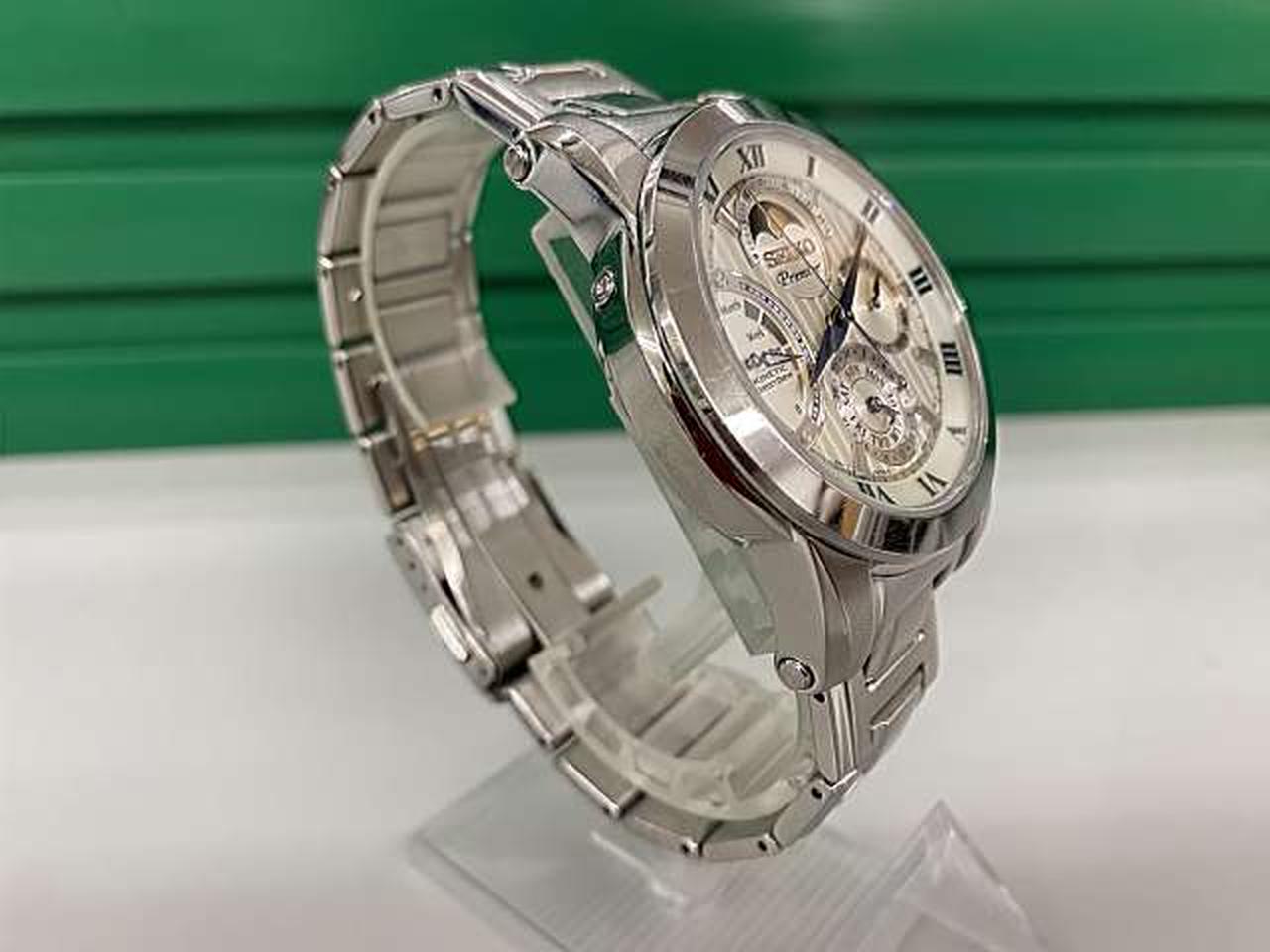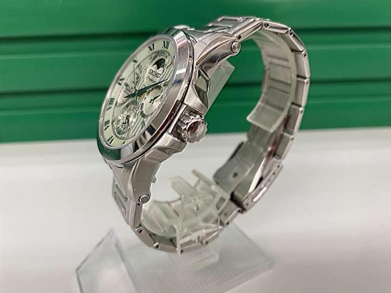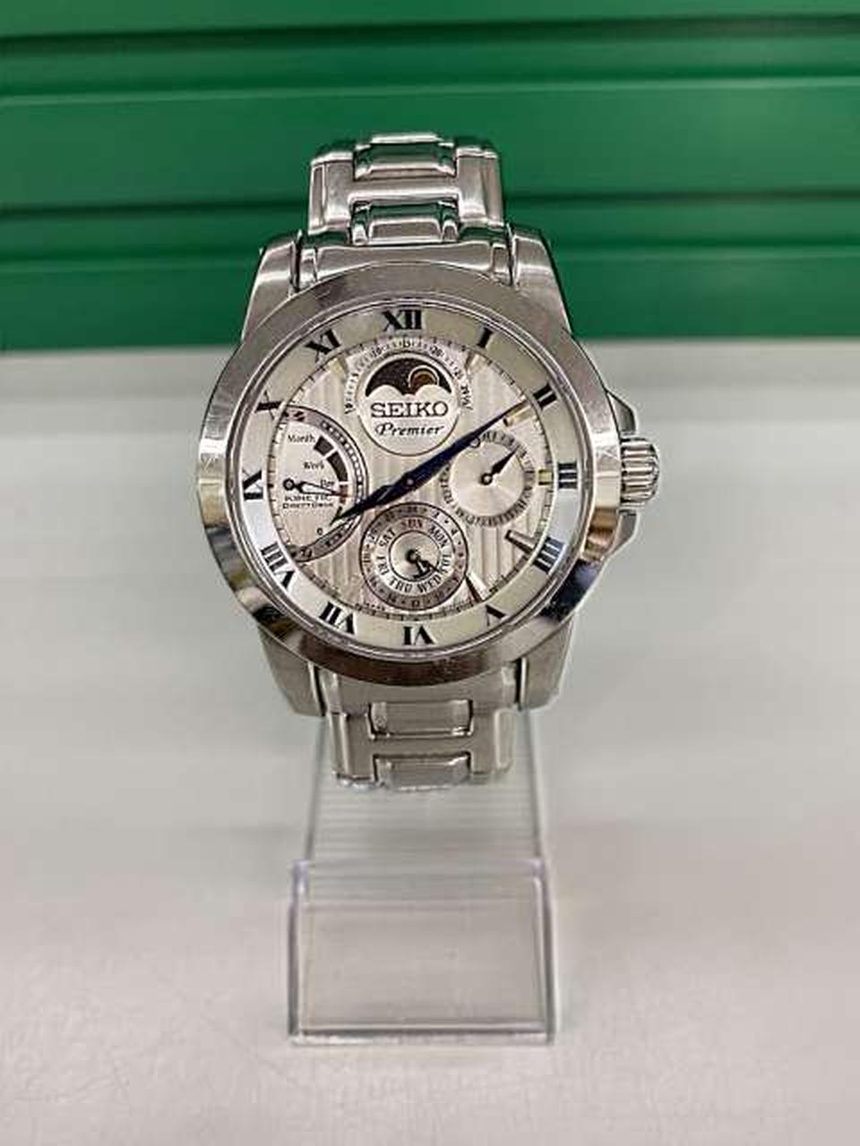 キネティック技術(オートクォーツ)を採用しており、着用時の腕の振りで発電し、トリプルカレンダー(曜日・日付・月)とムーンフェイズ機能を備えた上位モデルのメンズ腕時計です。 |