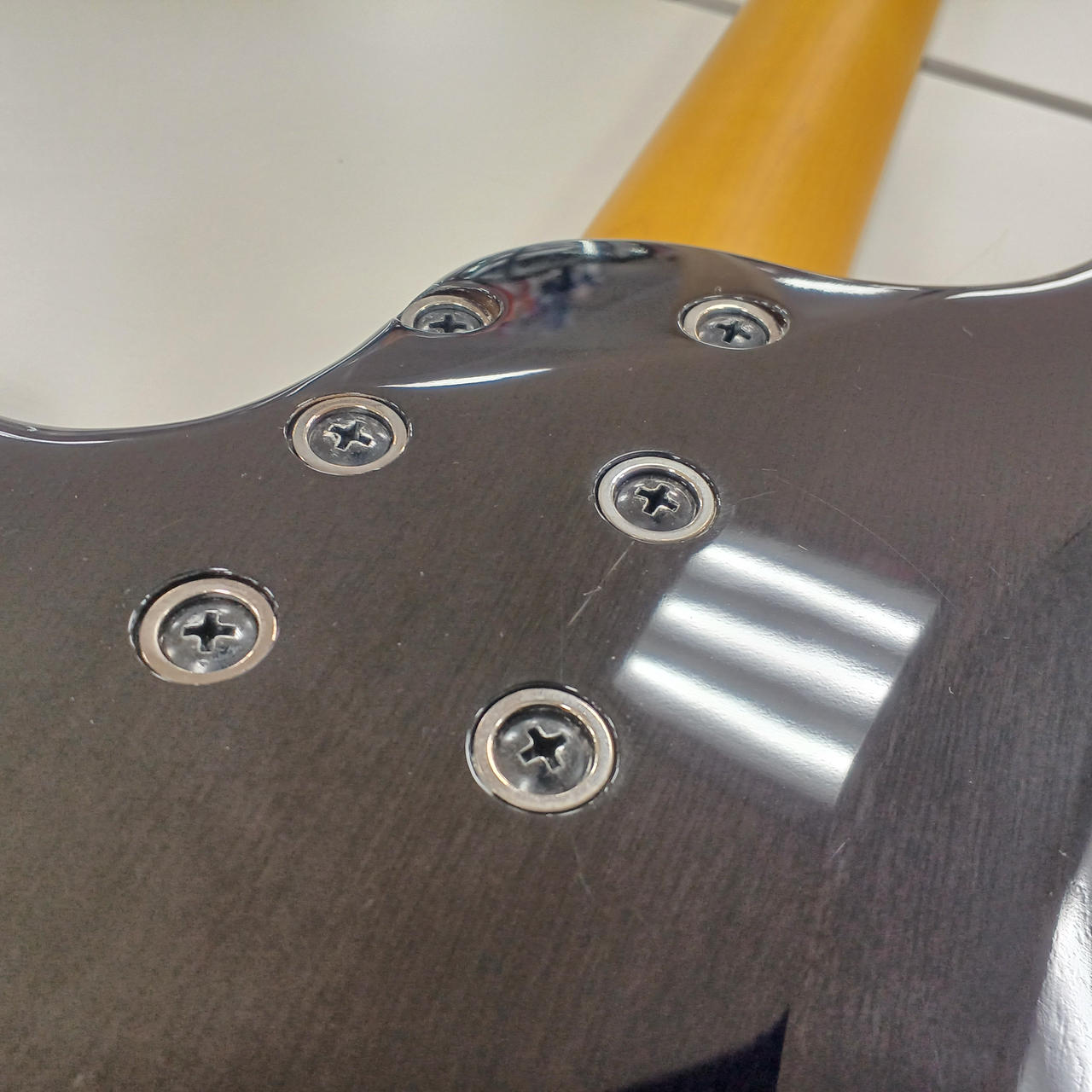 ネック:やや順反り、トラスロッド:右締め気味、弦高(6弦約2.5mm/1弦約2.0mm) |