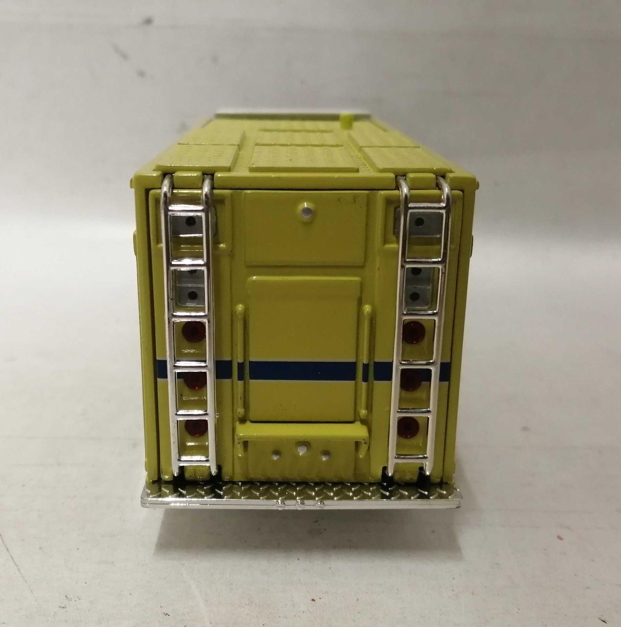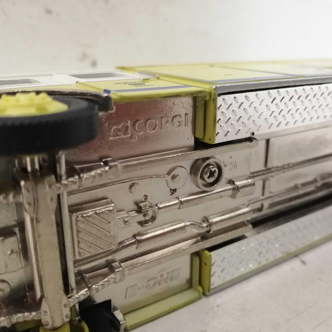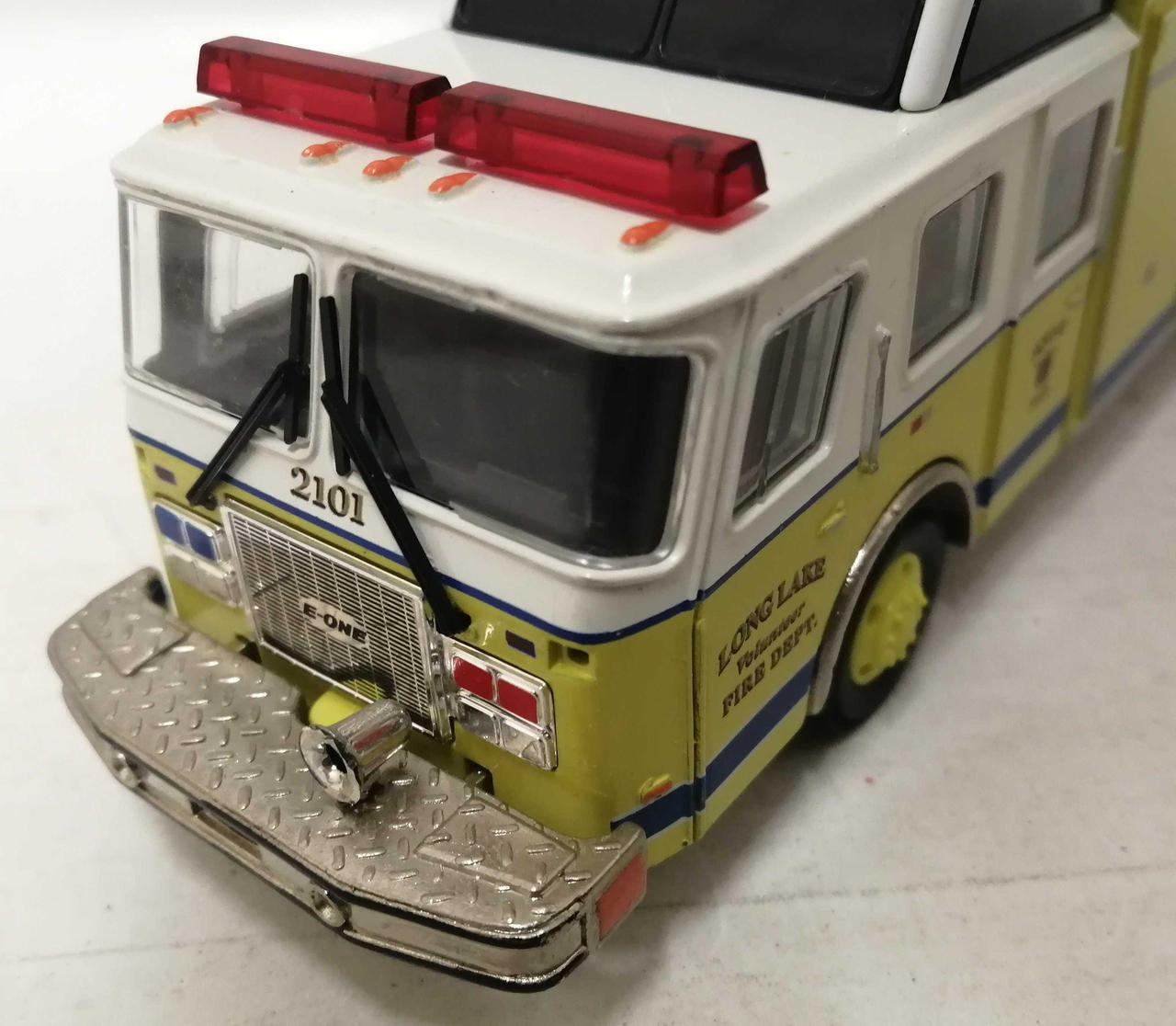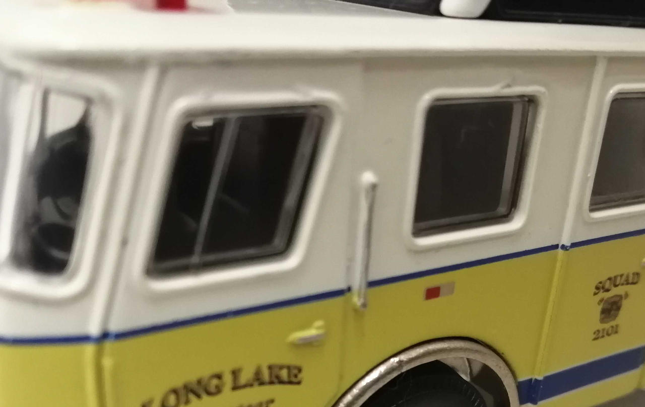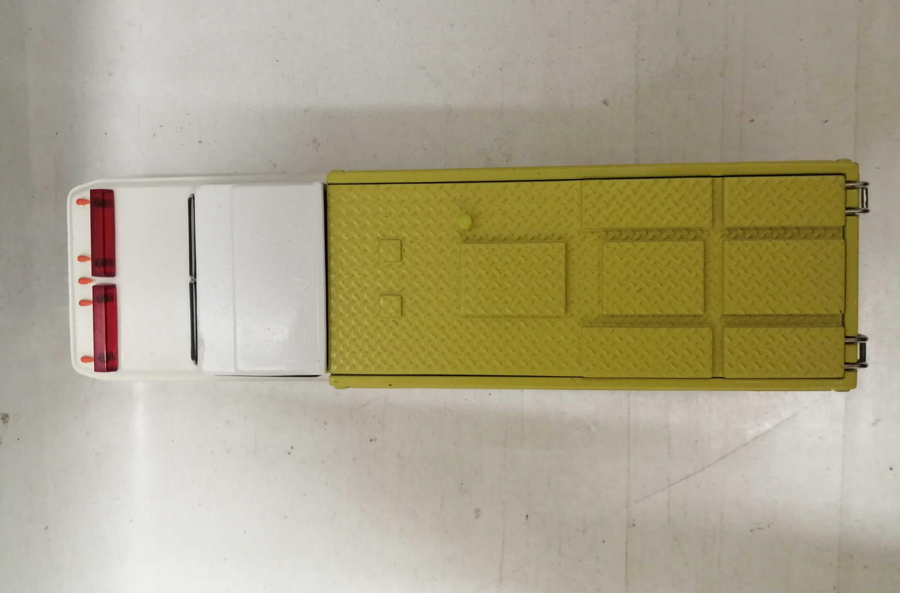 車体前方の白い部分に塗装のムラや浮きが見られます。銀色の金属の部分にくすみが見られます。窓に擦れが多く見られます。 |