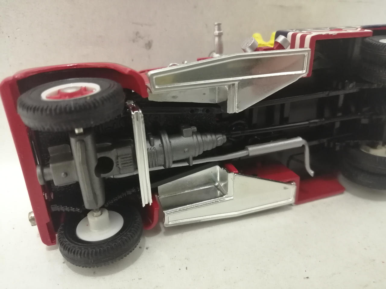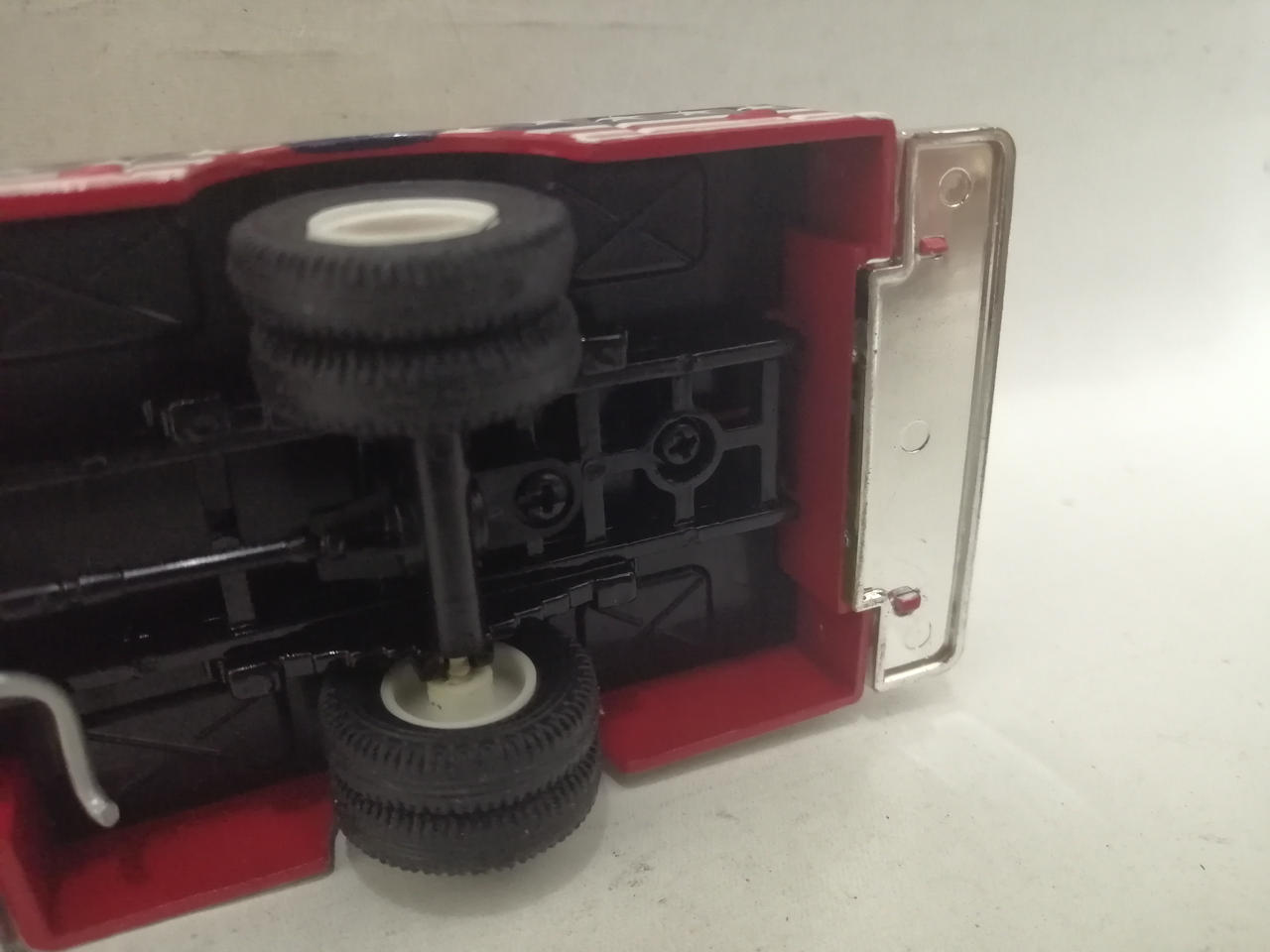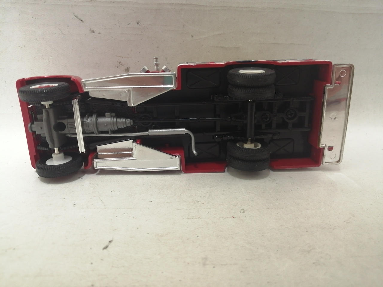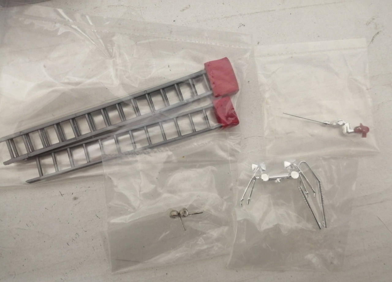 車体の銀色の部分にくすみが見られます。細かな塗装のムラや擦れが見られます。袋に入っている部品はほとんど未使用のものと思われます。 |