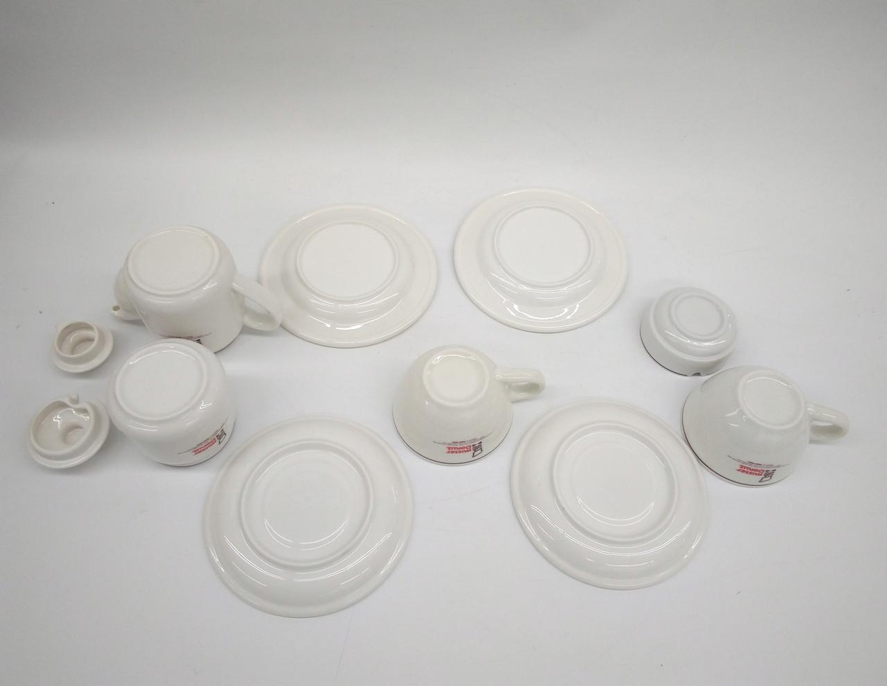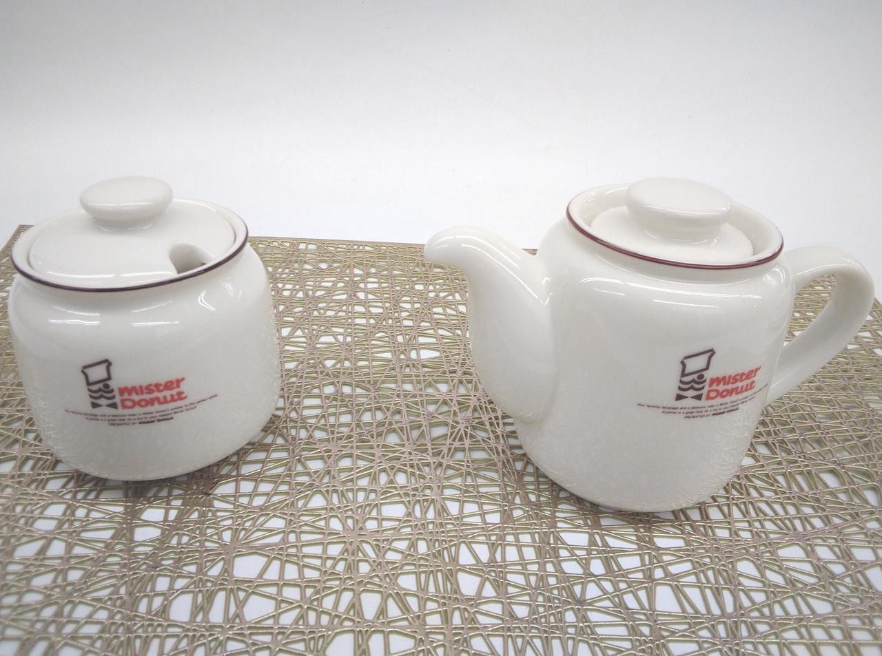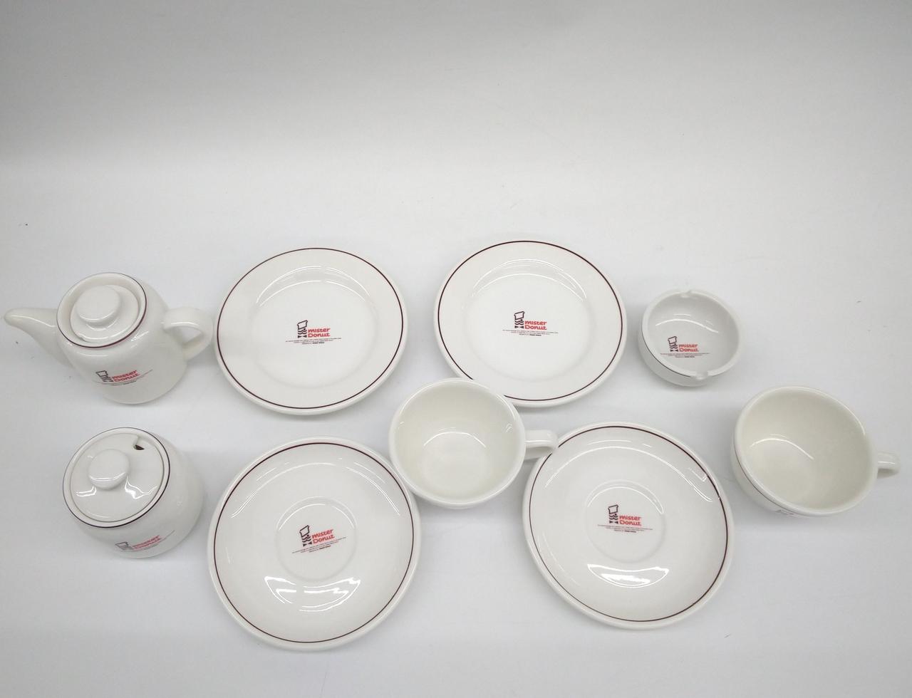 ミスタードーナツの可愛いロゴとレトロなカップ&ソーサー、プレート各2 . ティーポット、シュガーポット、灰皿のセットになります。