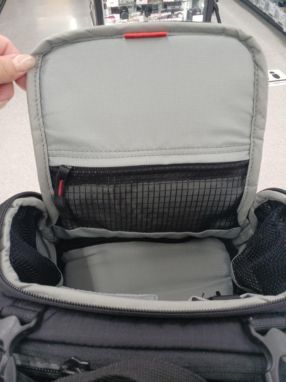 上段には身の回りのアイテム下段には身の回りのアイテム、下段はカメラや交換レンズが入る仕切つきの収納スペース |