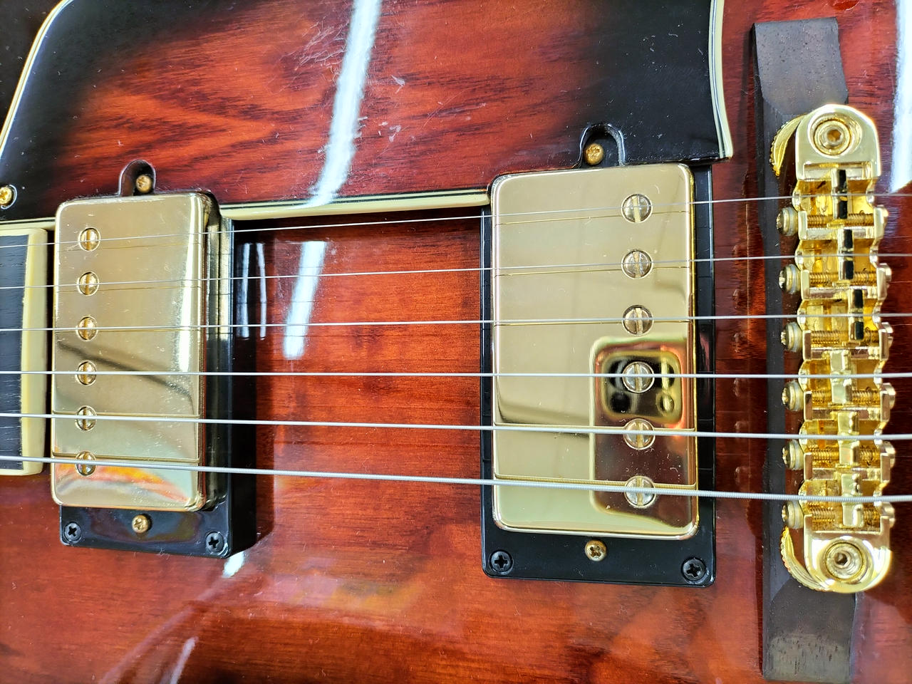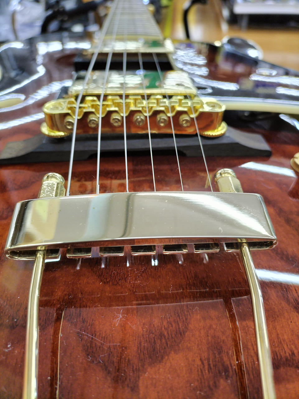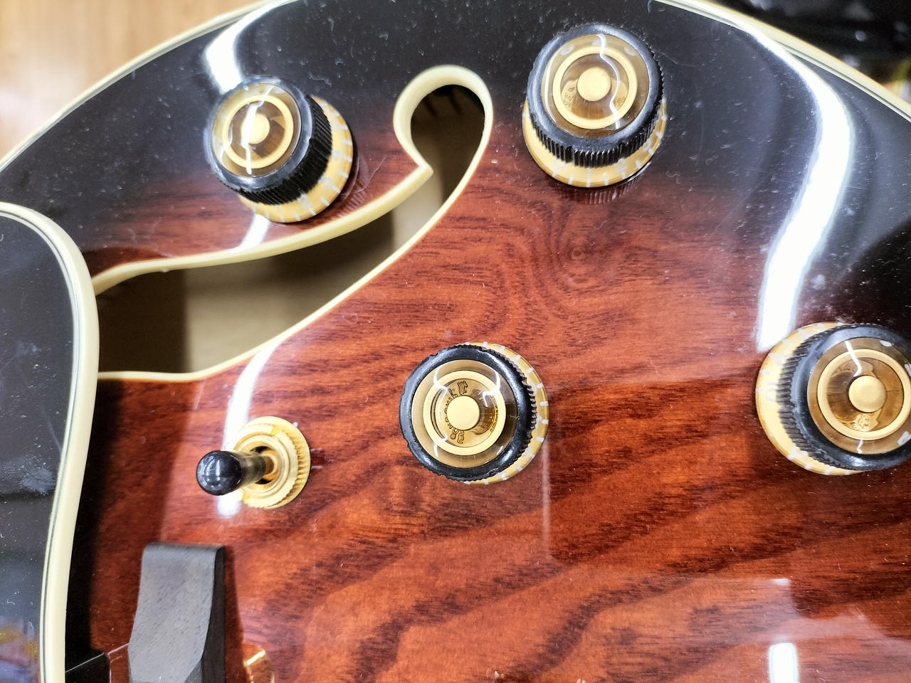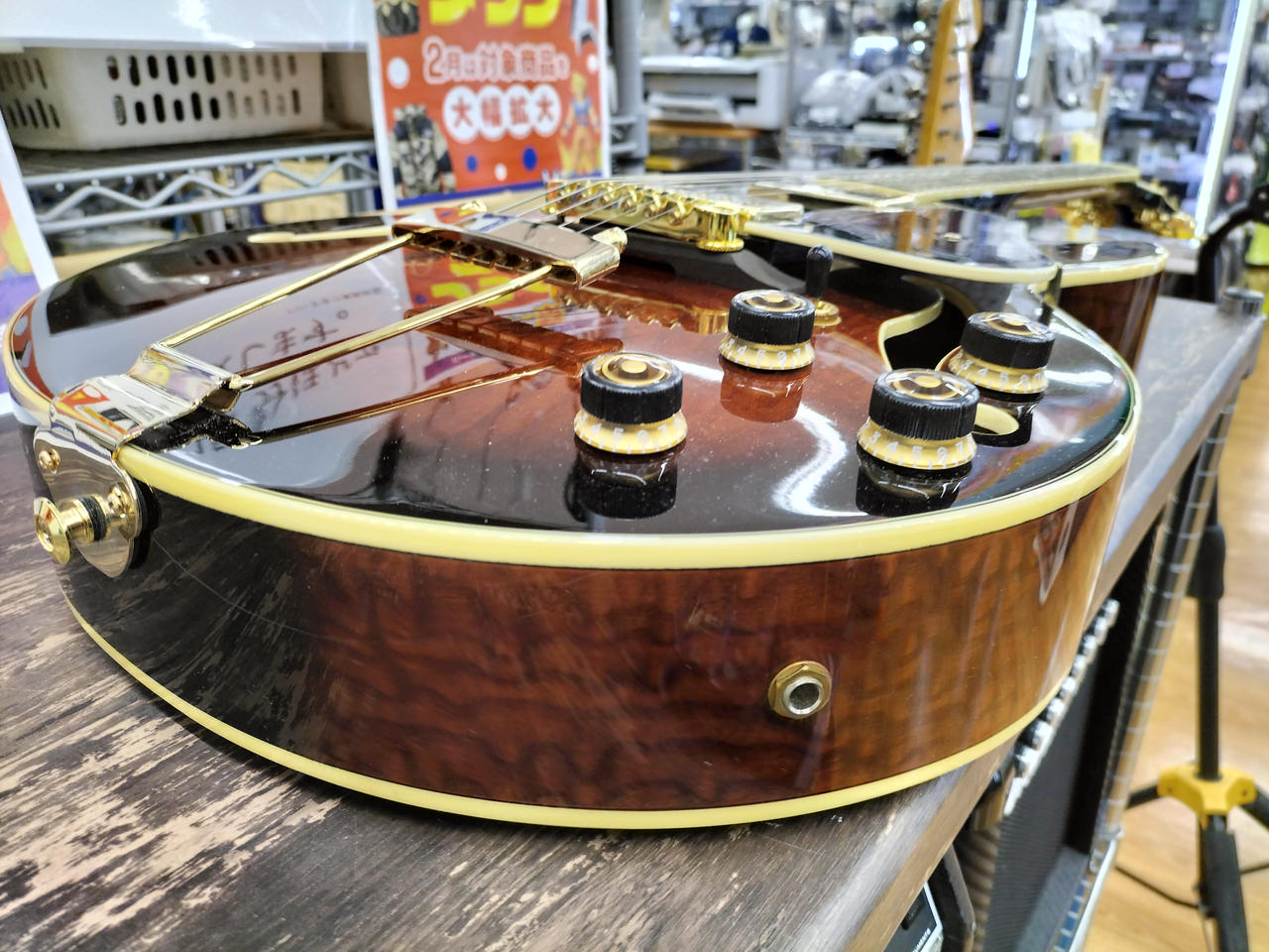 ちょっと小さめのフルアコボディ、ボディはキルテッドアッシュを採用し独特の杢目がオーソドックスなスタイル |