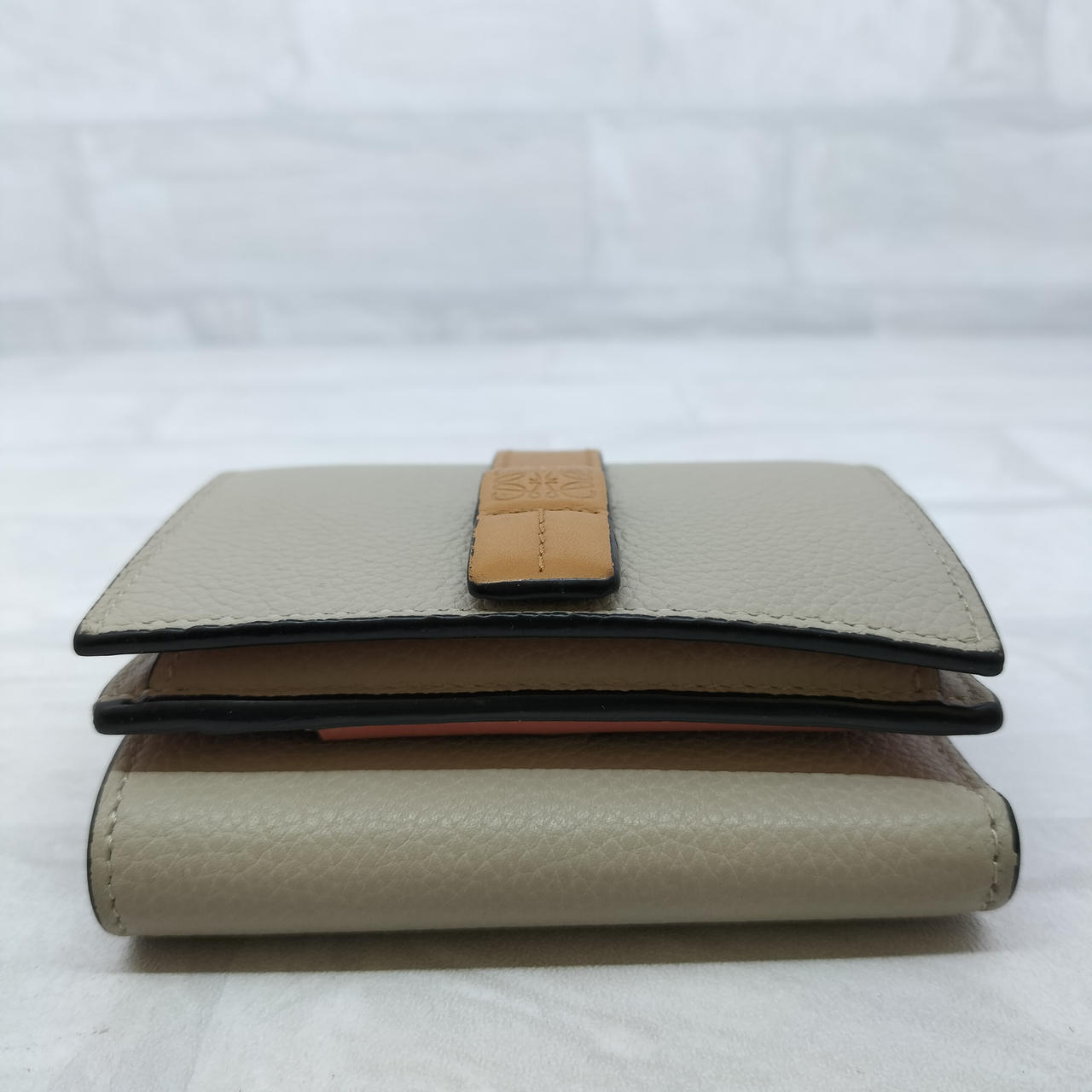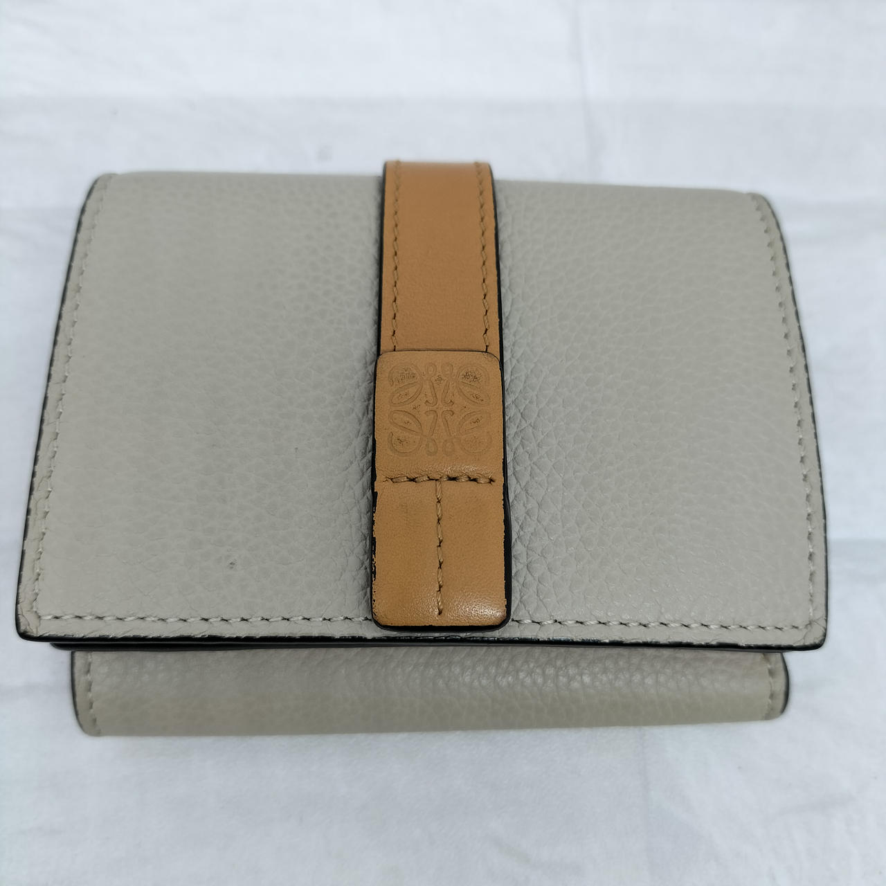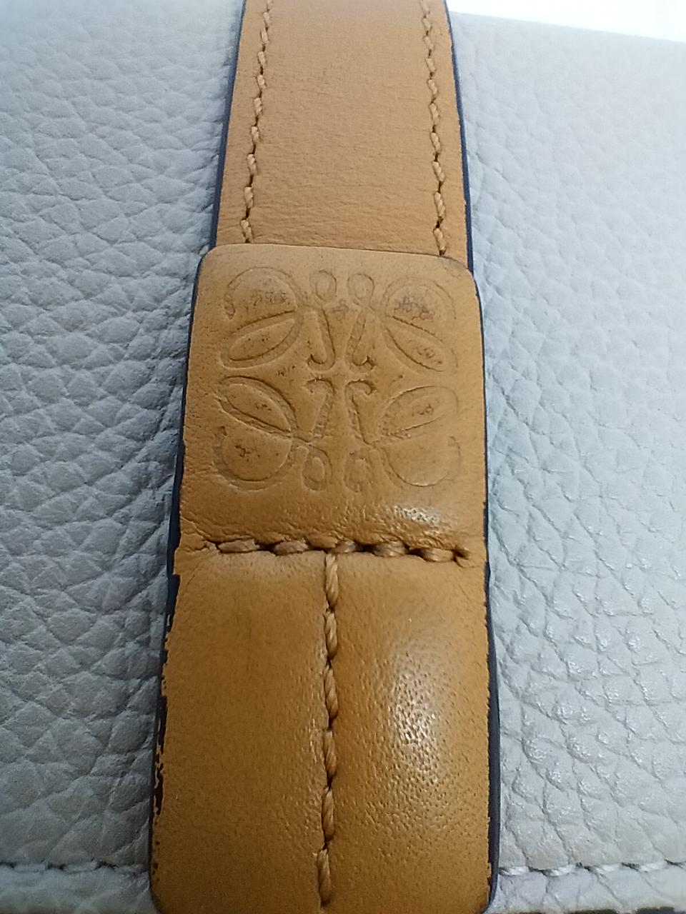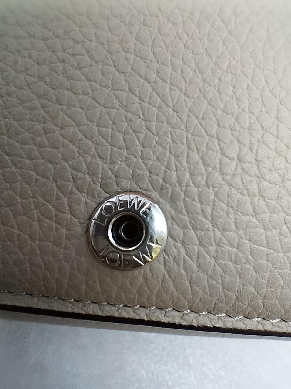 ロエベのアナグラムがエンボス加工されたストラップを組み合わせた、型押しカーフレザーにライニングカラーを組み合わせた「トライフォールド ウォレット」コンパクトなスナップ式三つ折り財布です。
