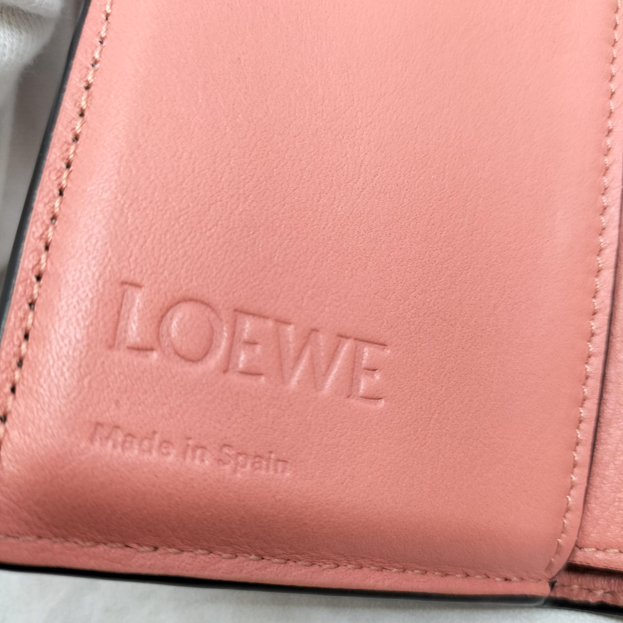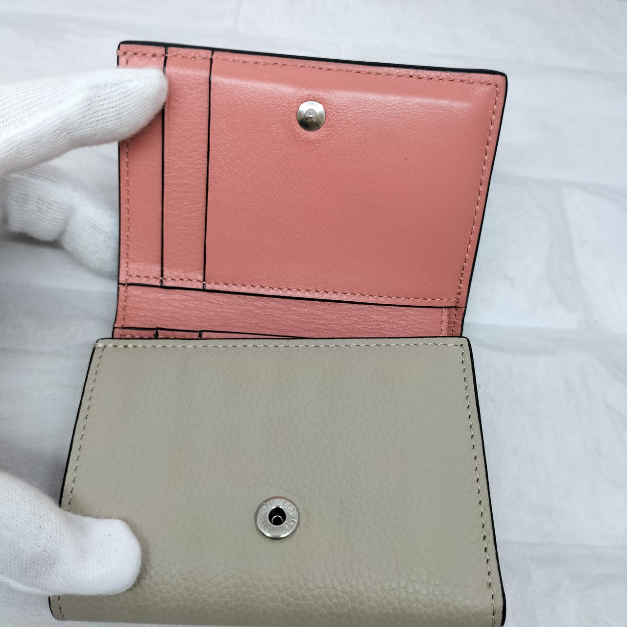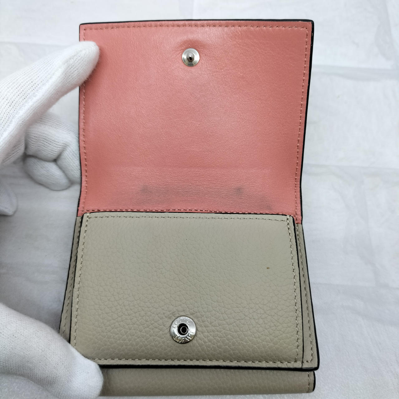 ロエベのアナグラムがエンボス加工されたストラップを組み合わせた、型押しカーフレザーにライニングカラーを組み合わせた「トライフォールド ウォレット」コンパクトなスナップ式三つ折り財布です。
