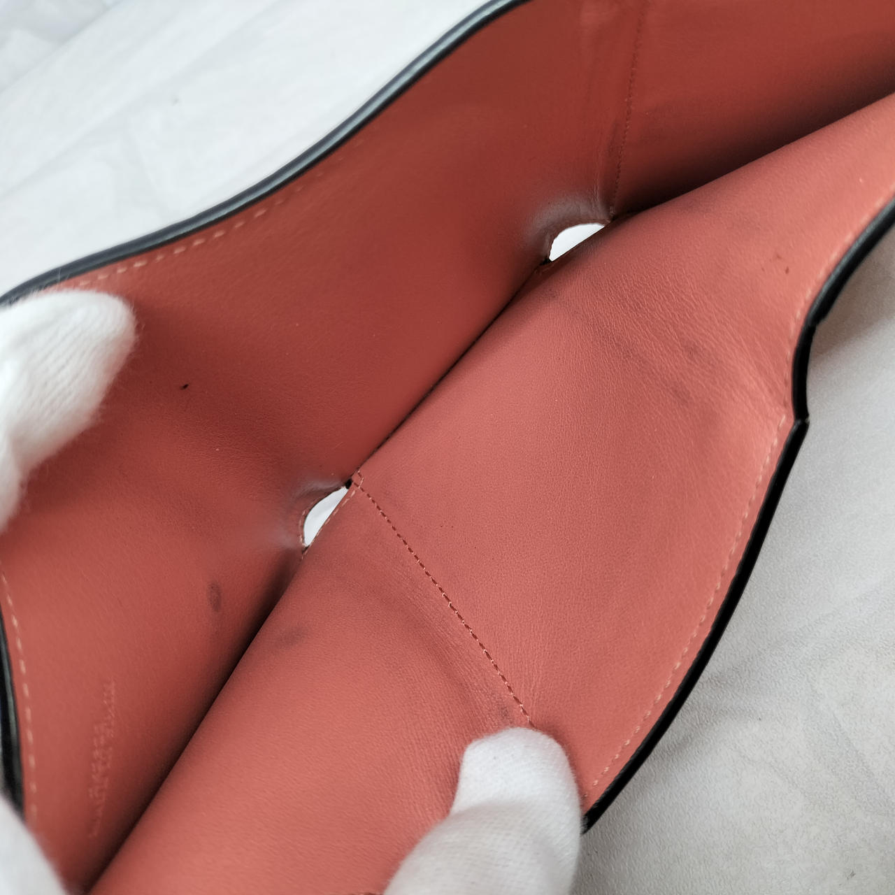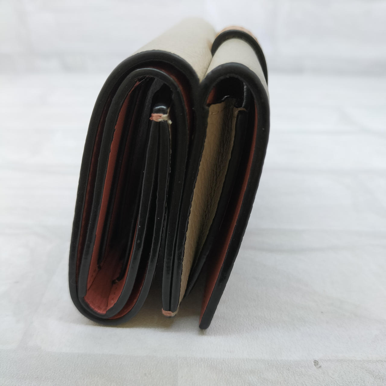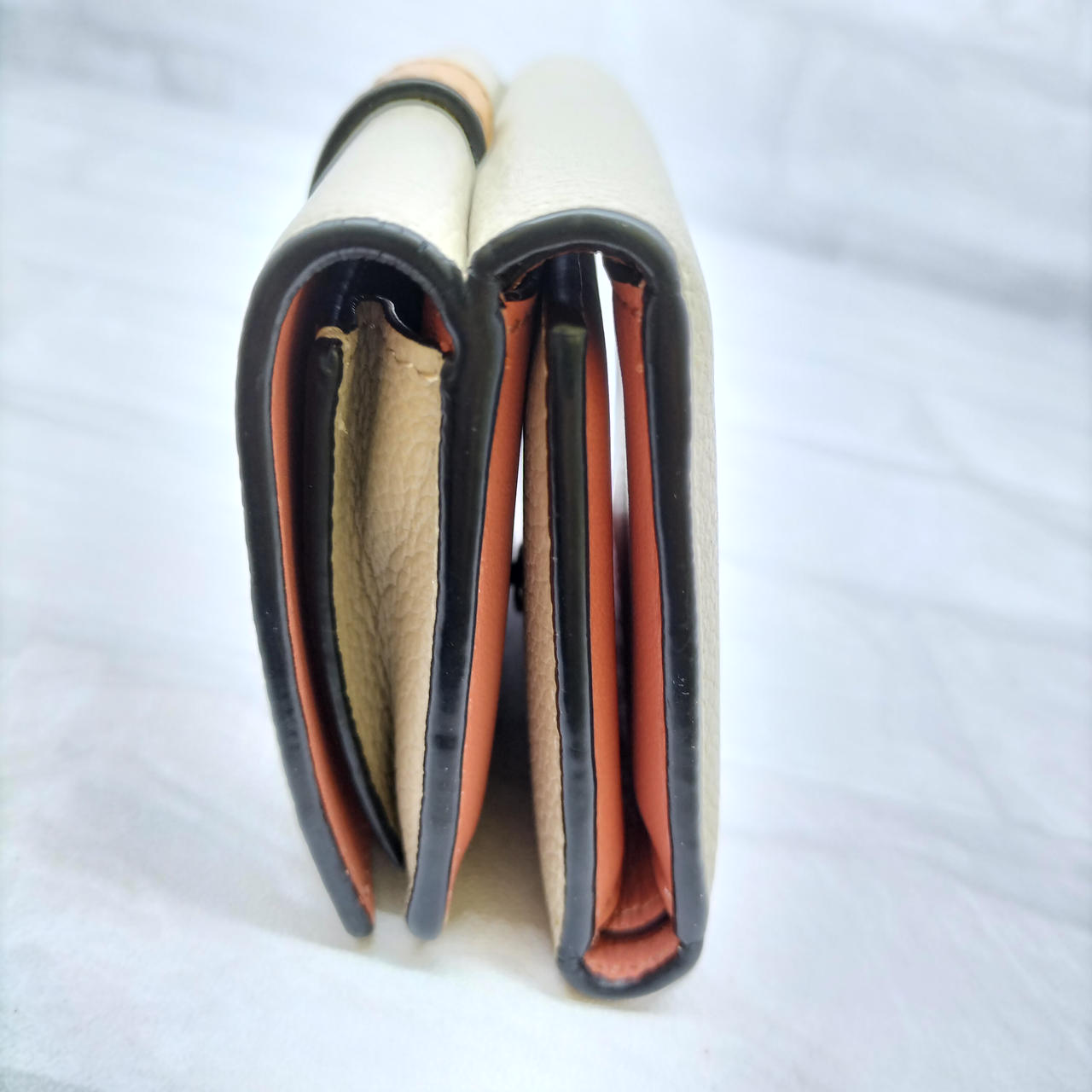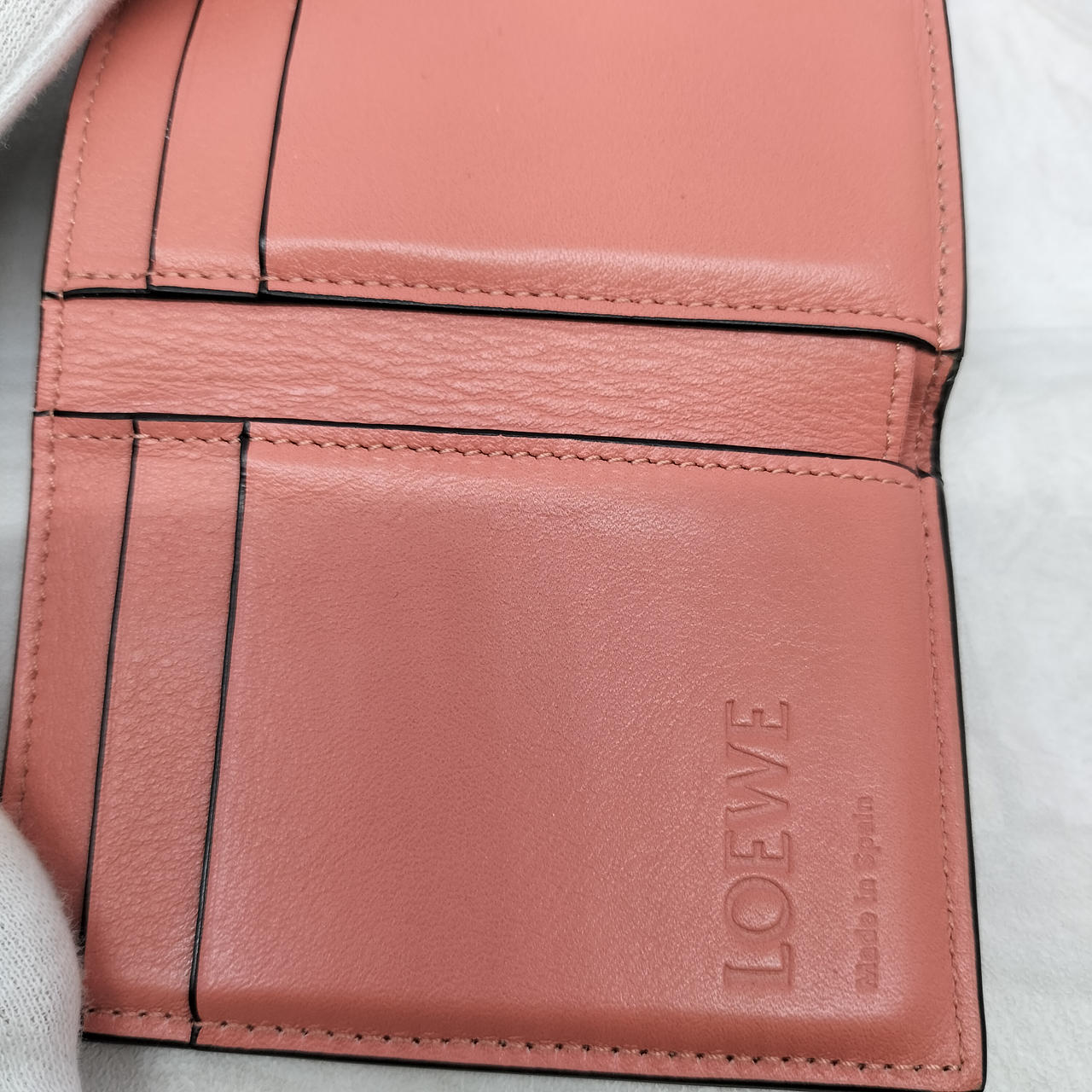 ロエベのアナグラムがエンボス加工されたストラップを組み合わせた、型押しカーフレザーにライニングカラーを組み合わせた「トライフォールド ウォレット」コンパクトなスナップ式三つ折り財布です。