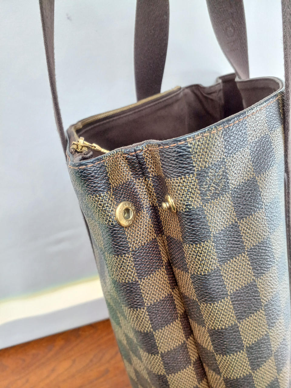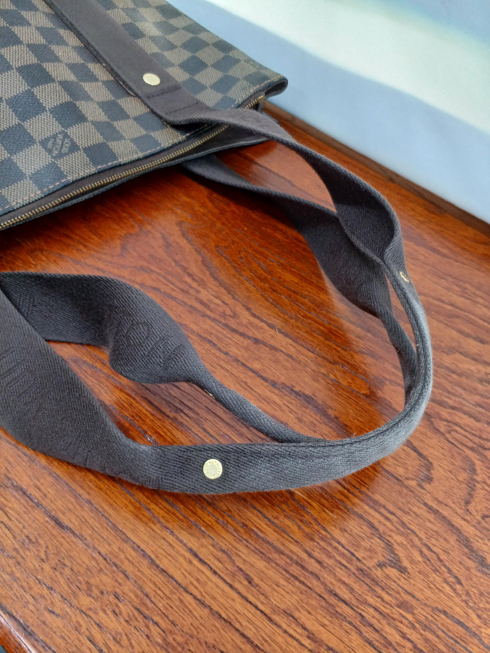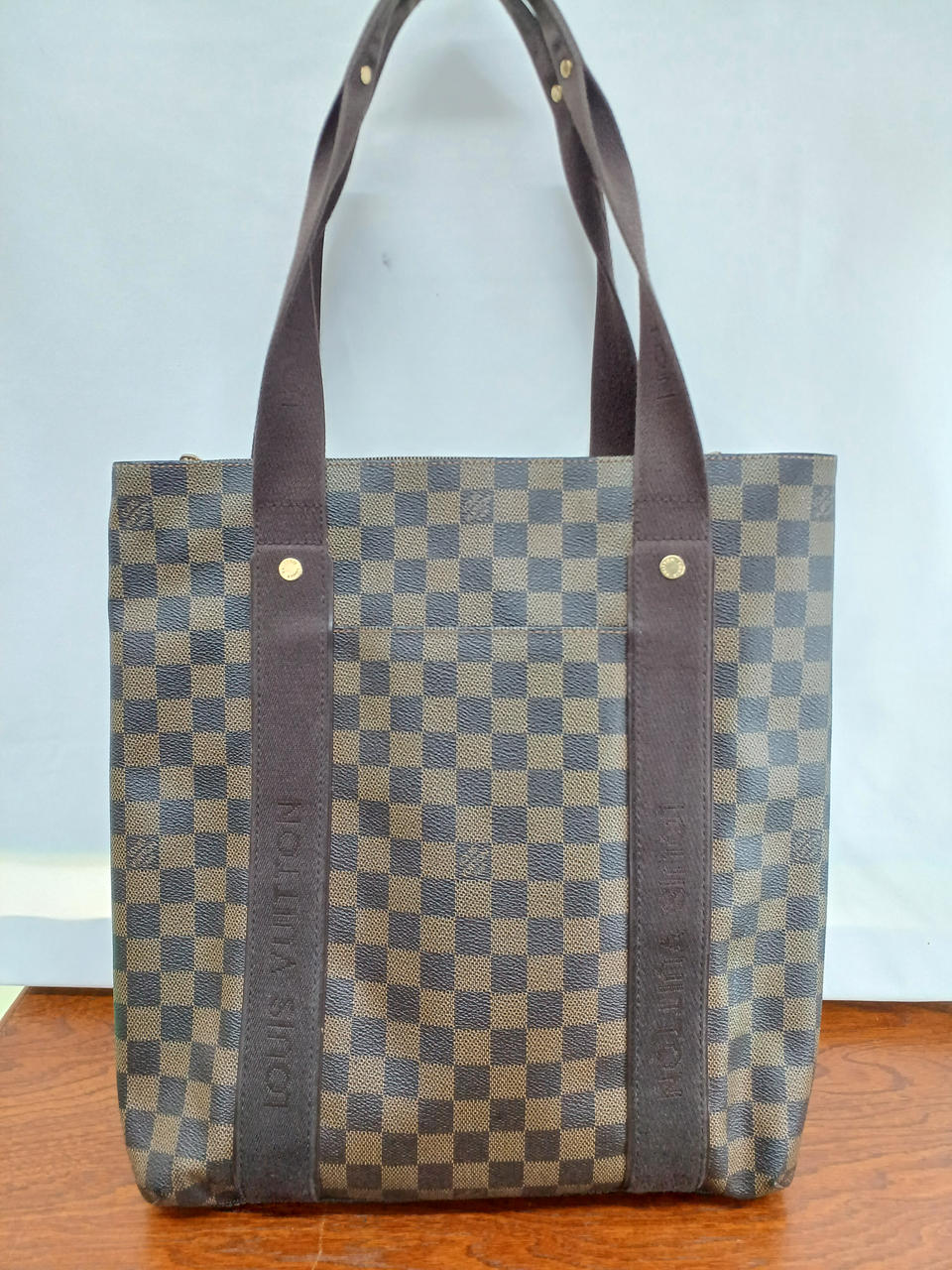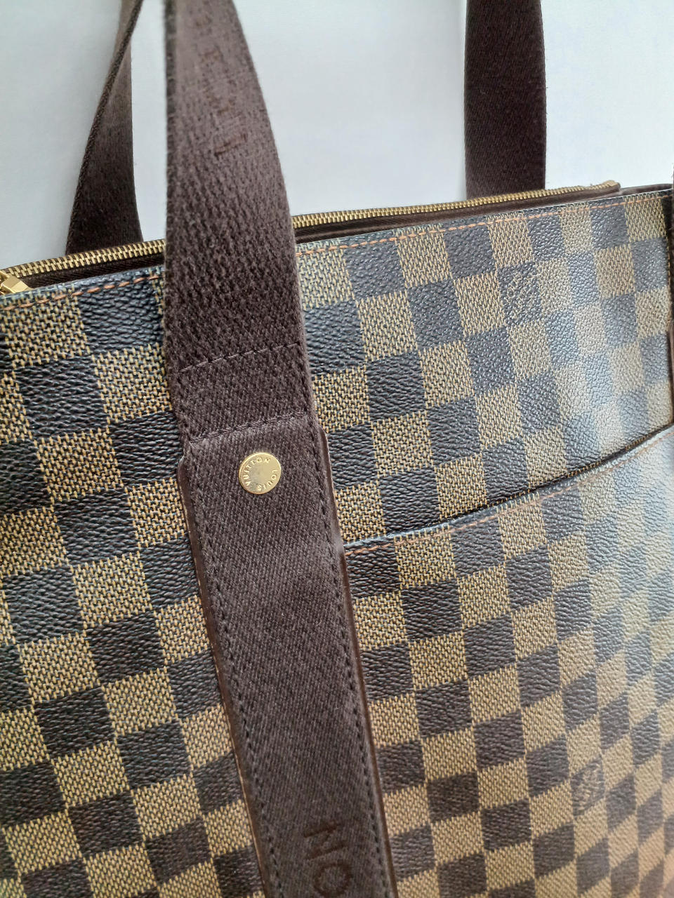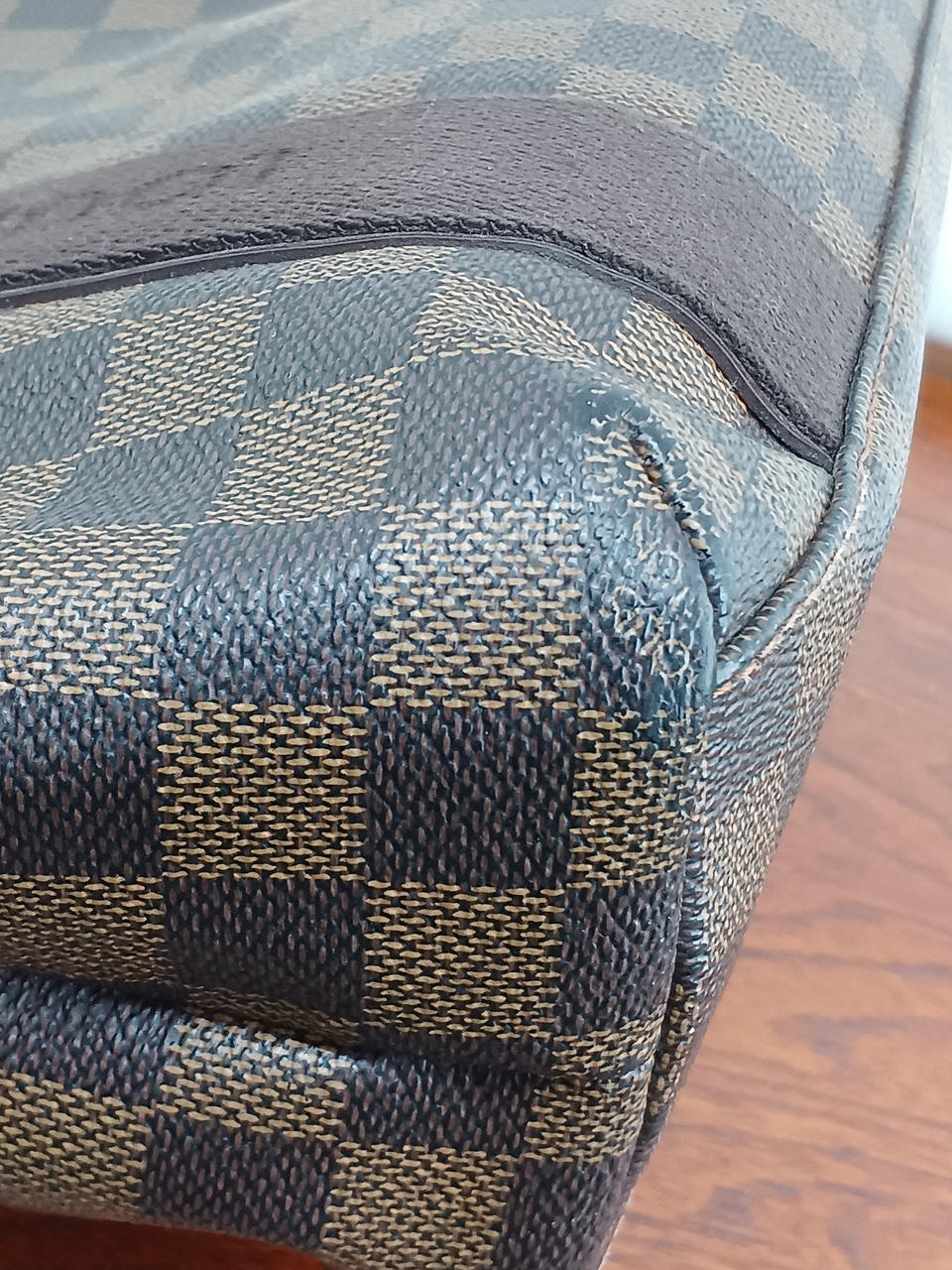 角擦れがあり、コットン生地の部分、特に持ち手には色変があります。 |