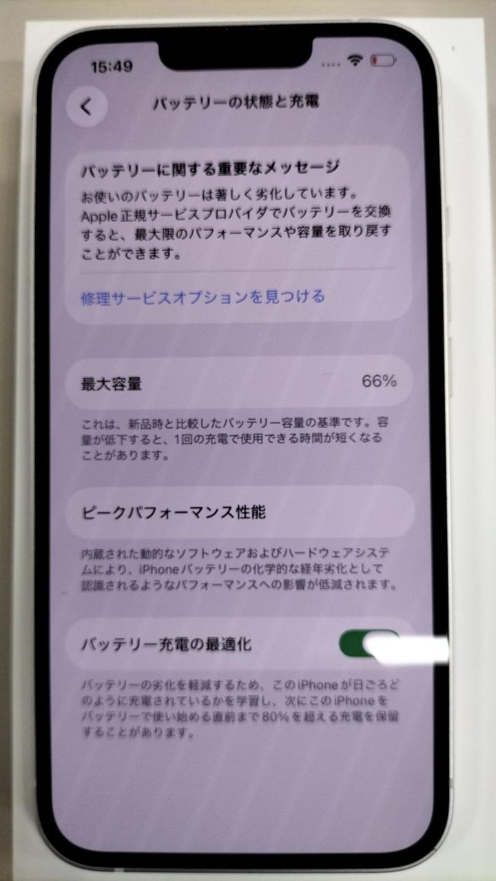 バッテリ最大容量が66%。キャリア:KDDI(SIMロック無し)。 |