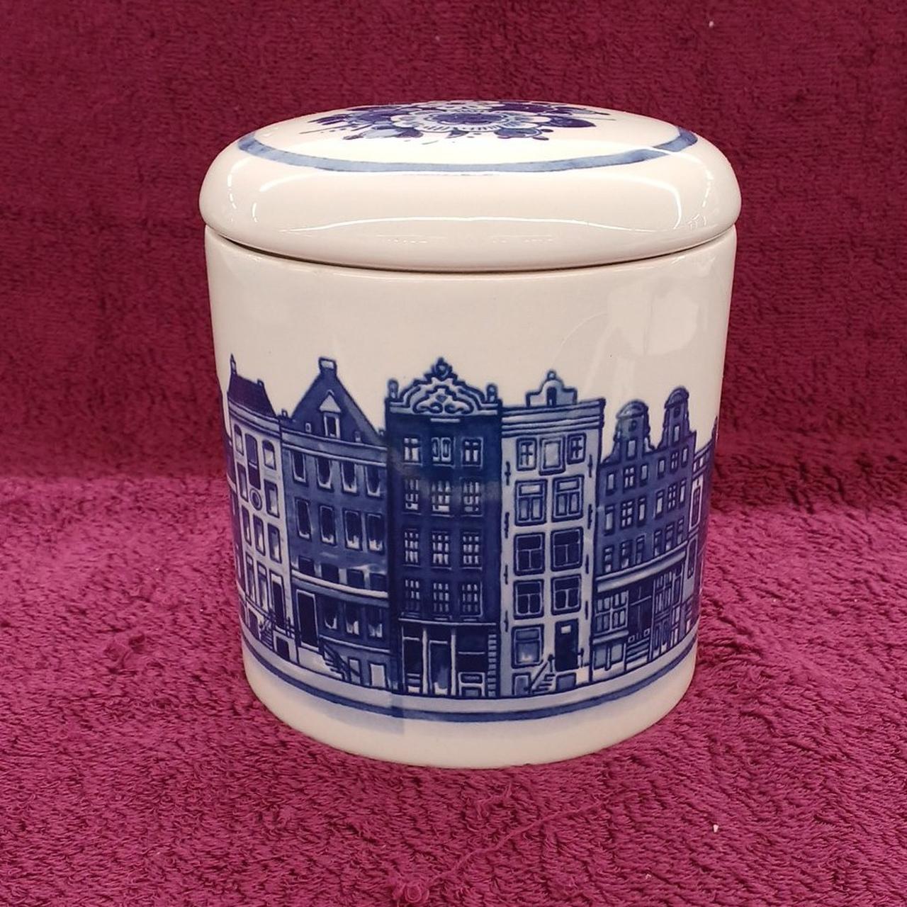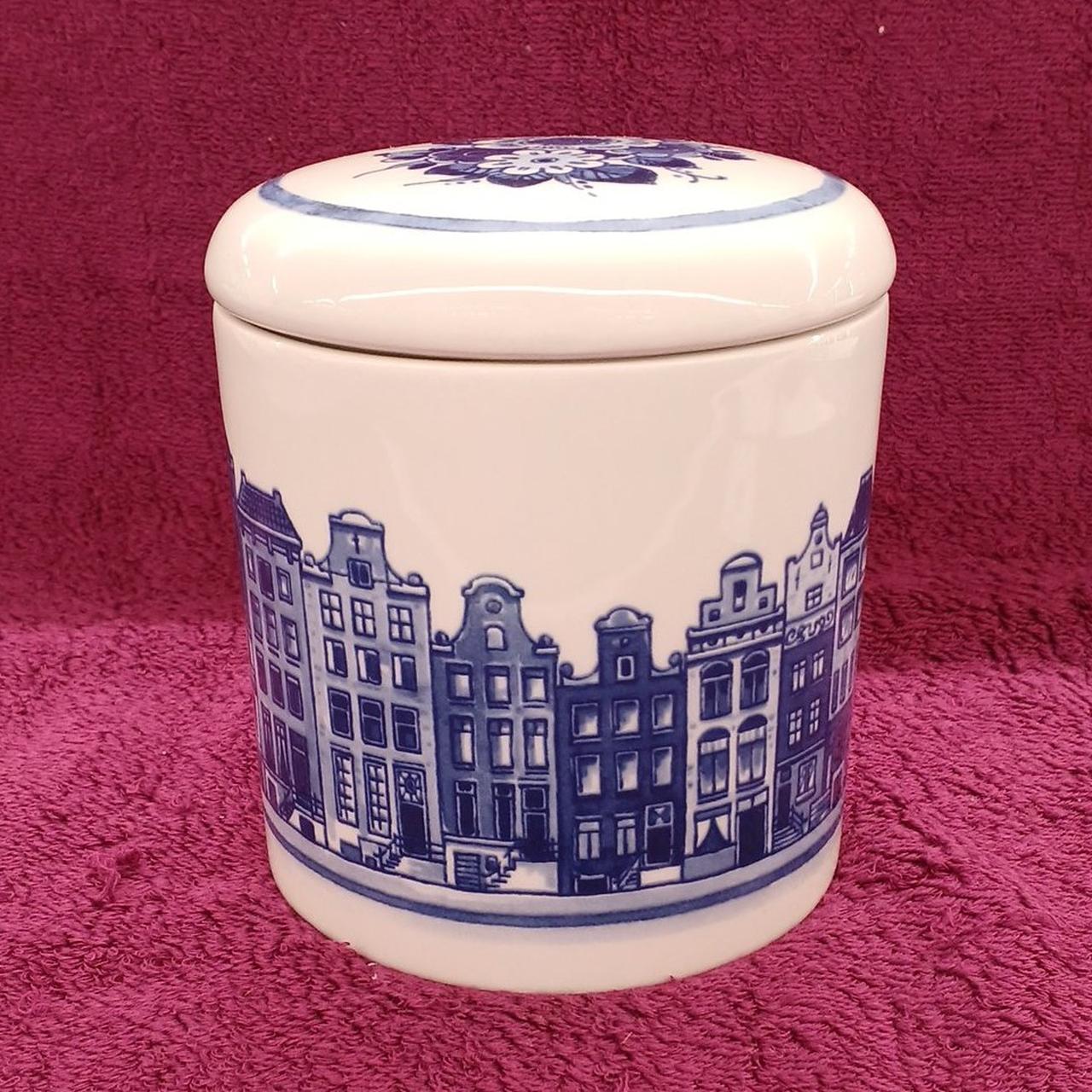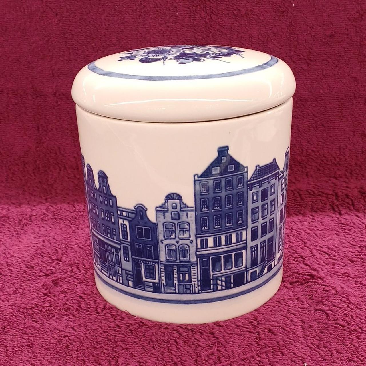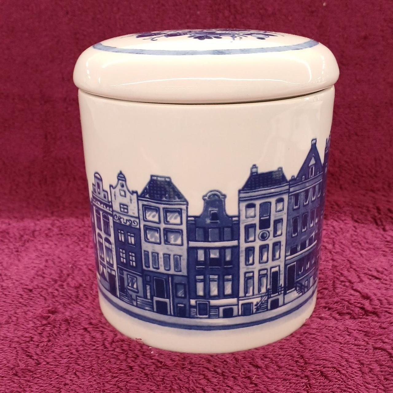 アムステルダムの運河沿いに並ぶ伝統的なカナルハウスが描かれています