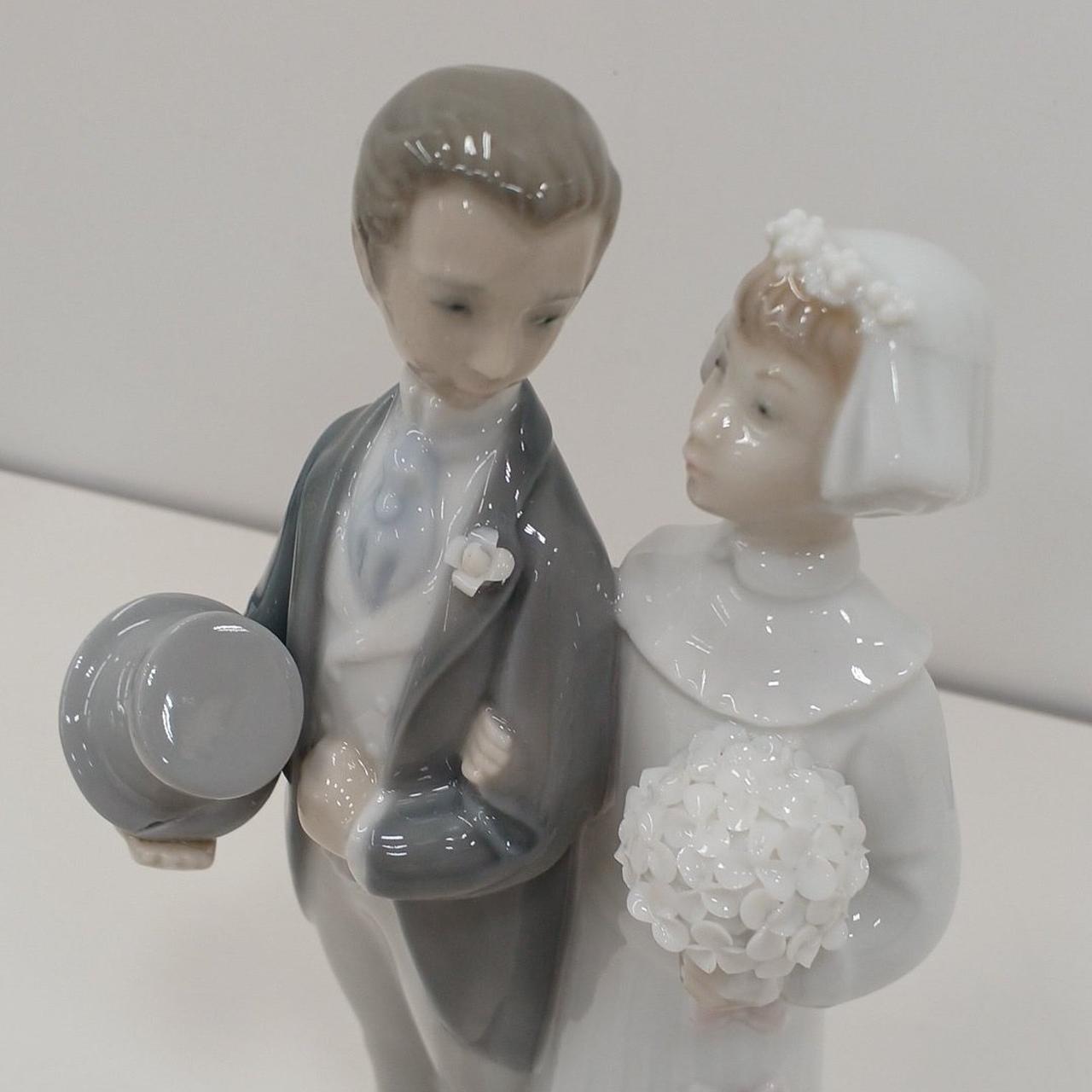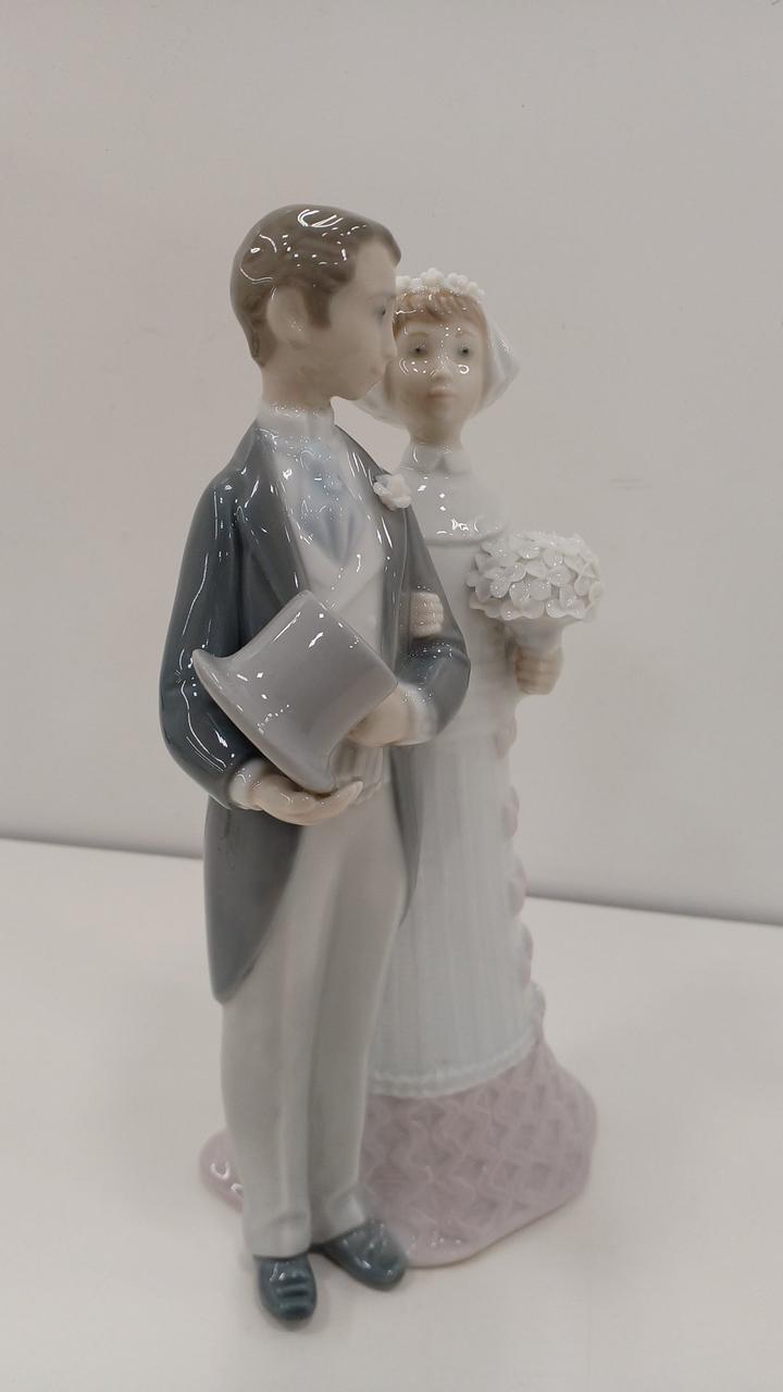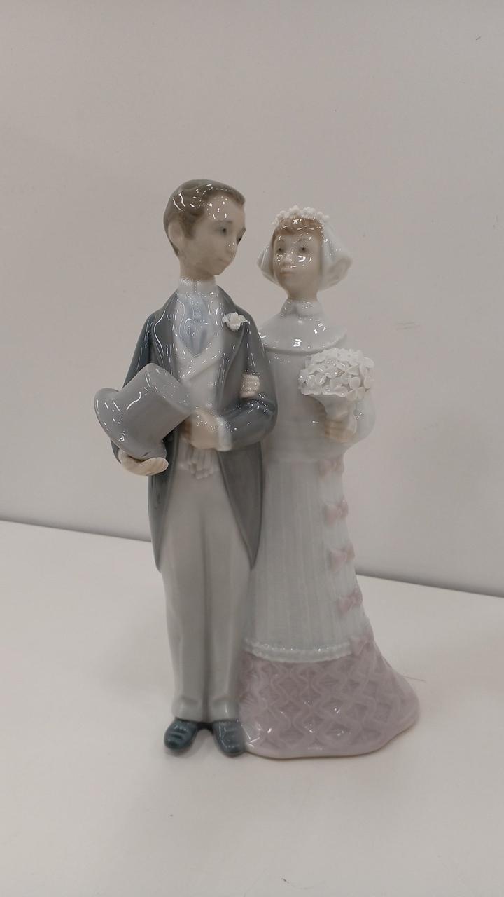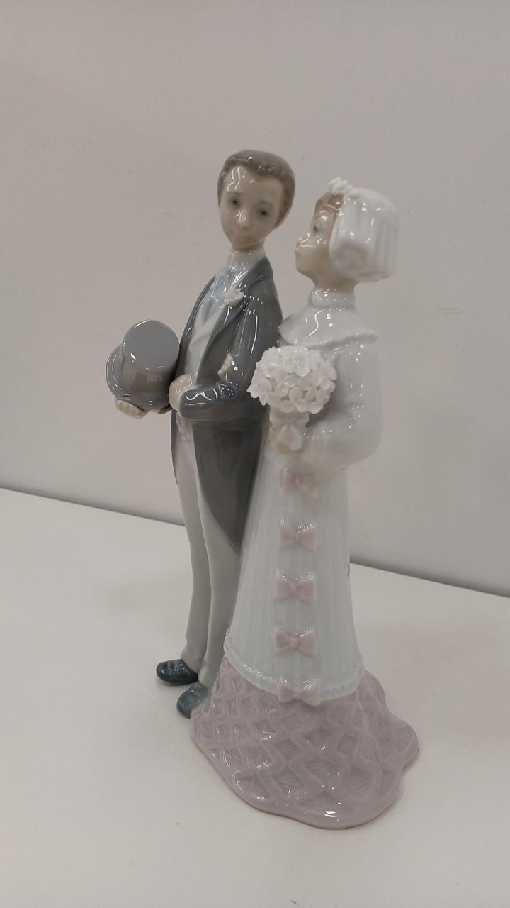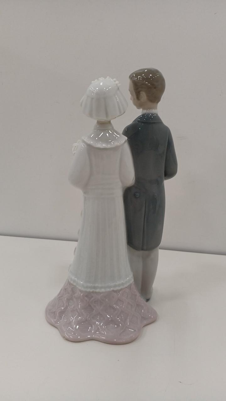 腕を組んで歩む新郎新婦の姿を、リヤドロ特有の淡い色使いと光沢のある仕上げで表現した作品です。