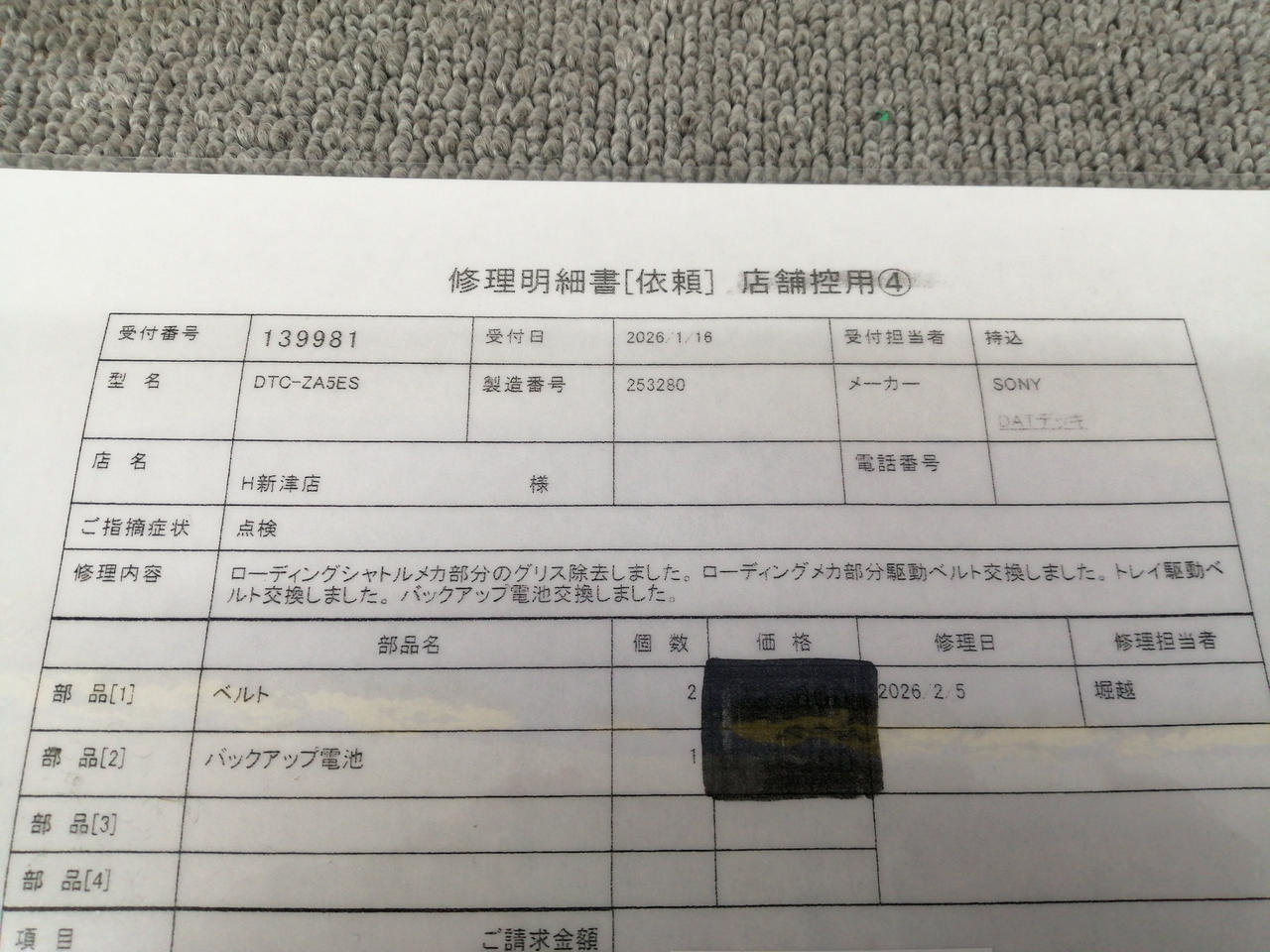 メンテナンス内容:ローディングシャトルメカ部分のグリス除去しました。ローディングメカ部分駆動ベルト交換しました。トレイ駆動ベルト交換しました。バックアップ電池交換しました。 |