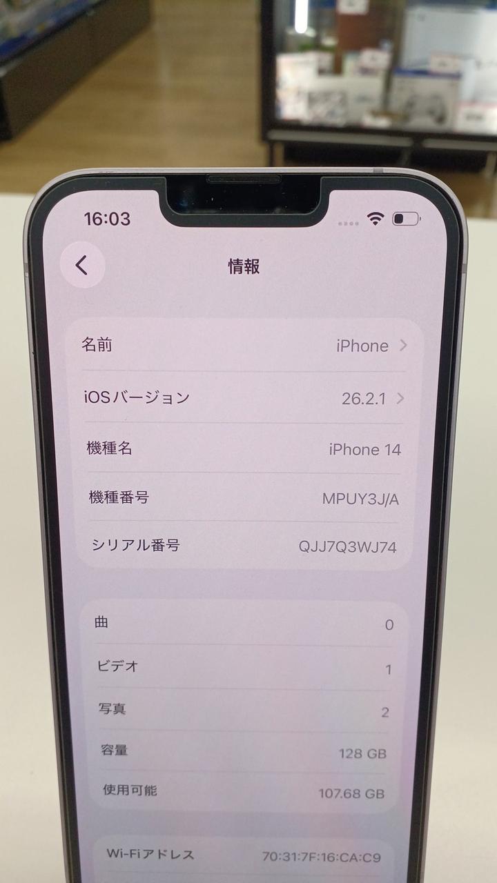 IPHONE14 IOS26.2.1 128GB バッテリー最大容量80% ソフトバンク利用制限:△ |