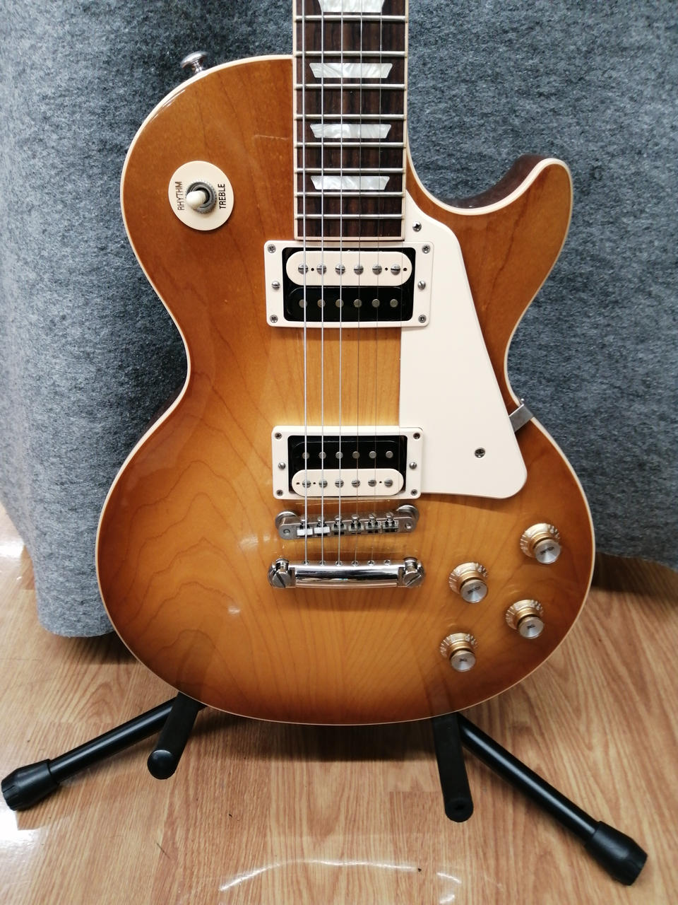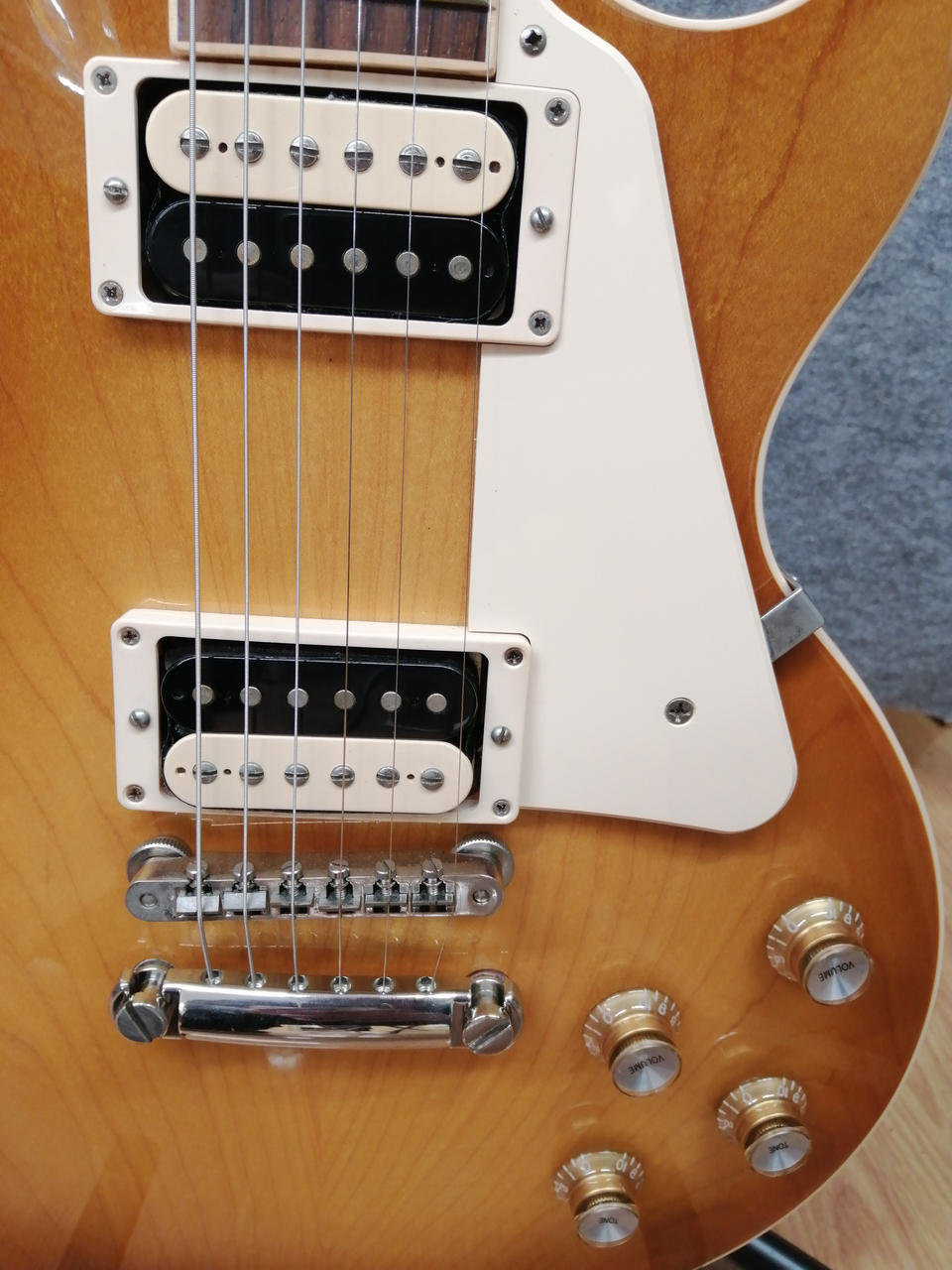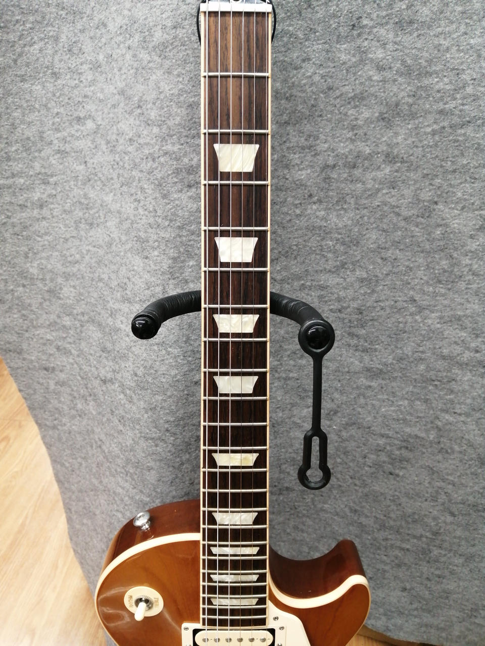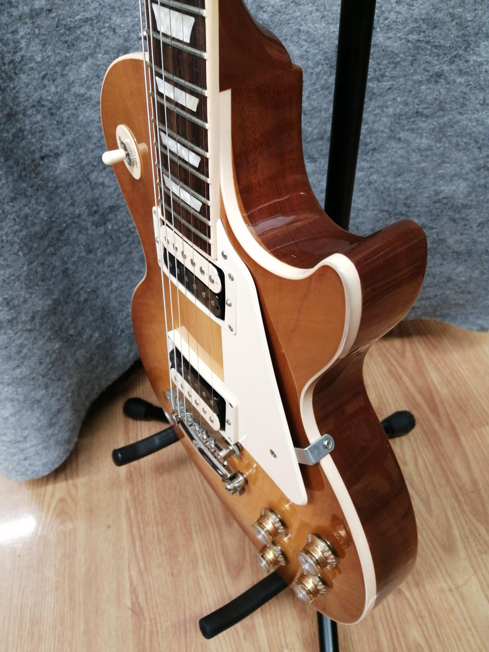 マホガニー材をボディ・バックに、メイプルをボディ・トップに配しマホガニー材によるネックとバインディングの施されたローズウッド指板搭載