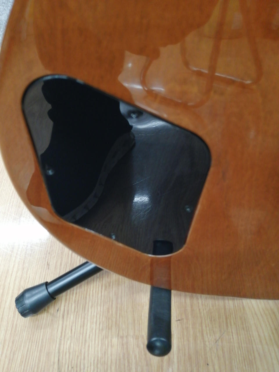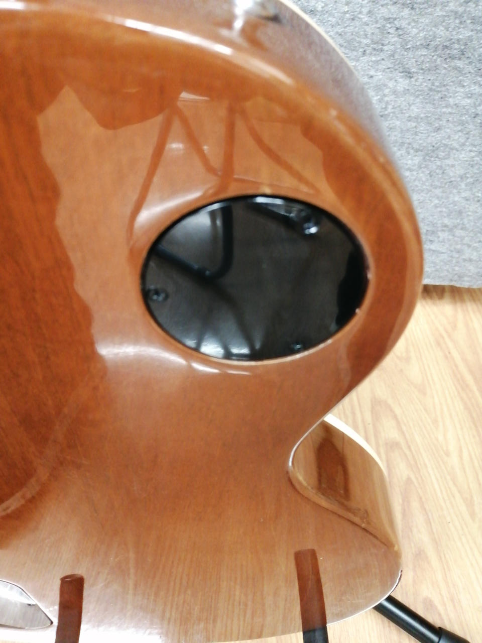 マホガニー材をボディ・バックに、メイプルをボディ・トップに配し、 |