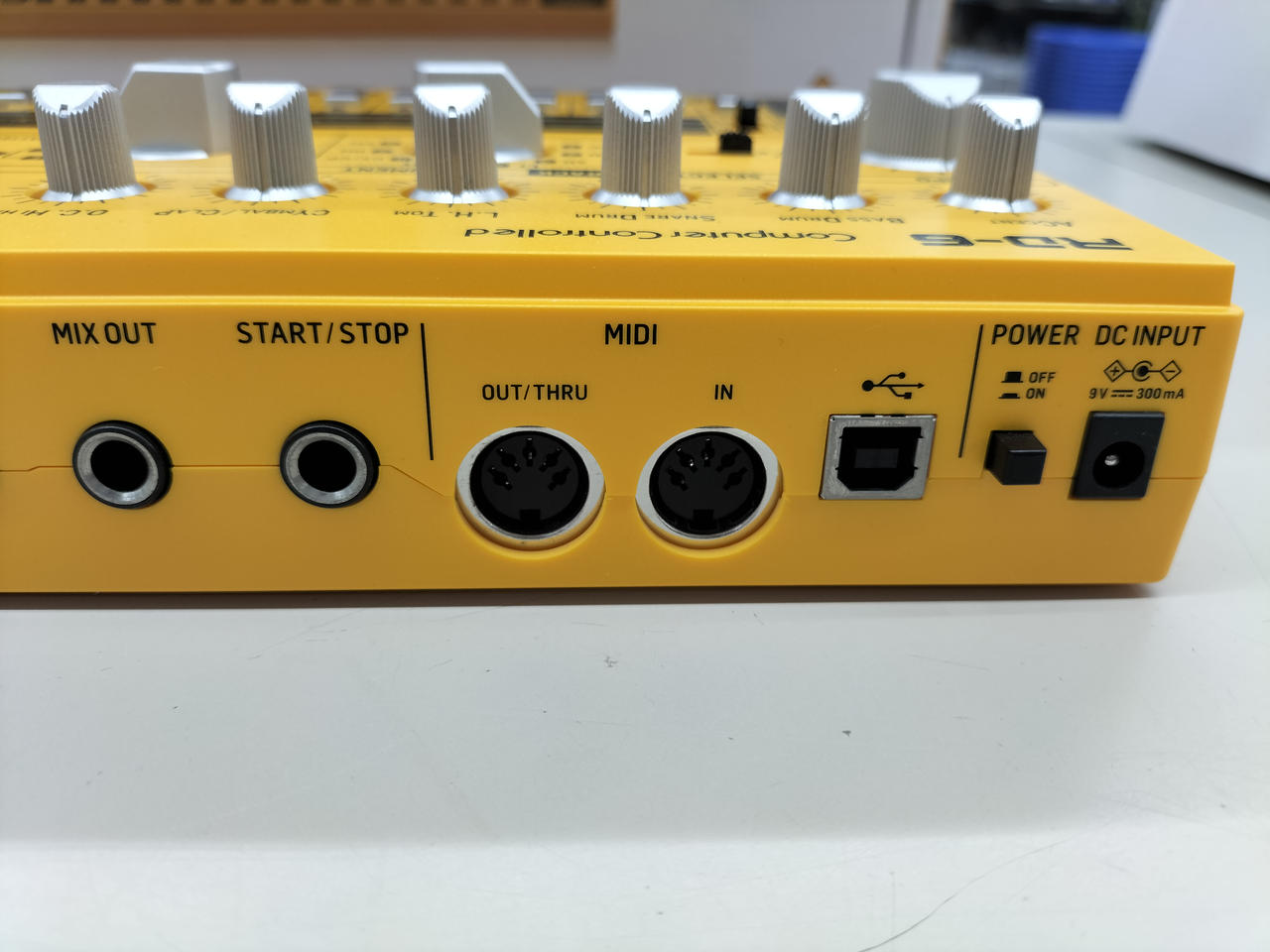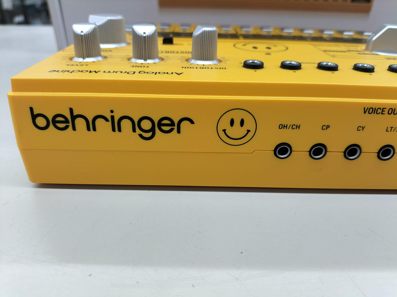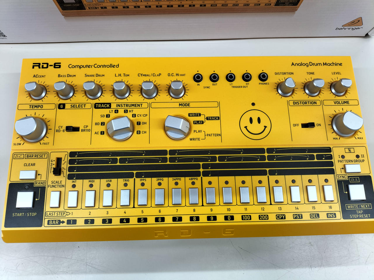 8つのドラムサウンド、16ステップのシーケンサー、ディストーションエフェクトを装備したアナログドラムマシン |