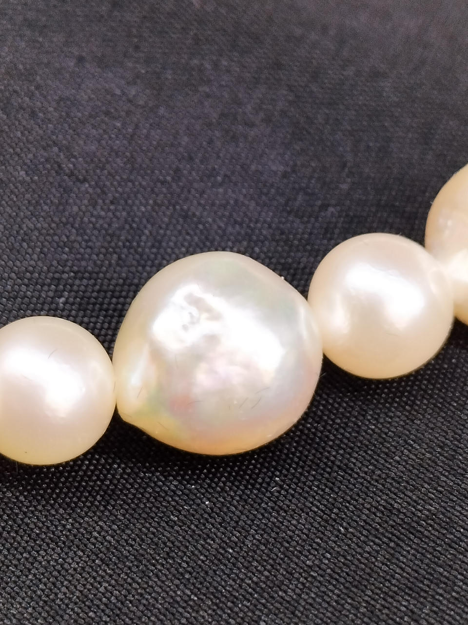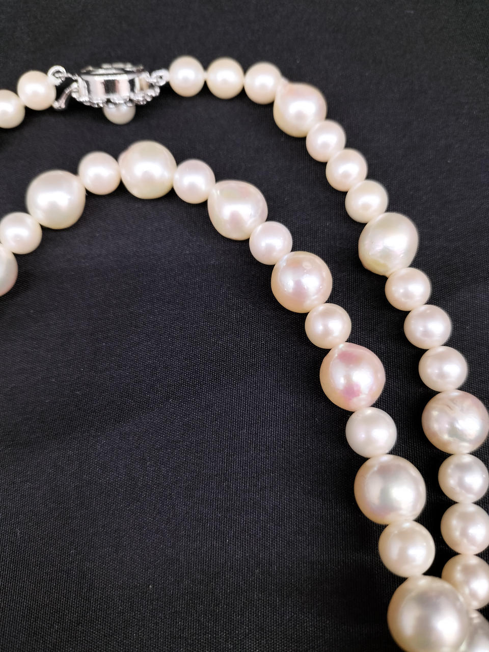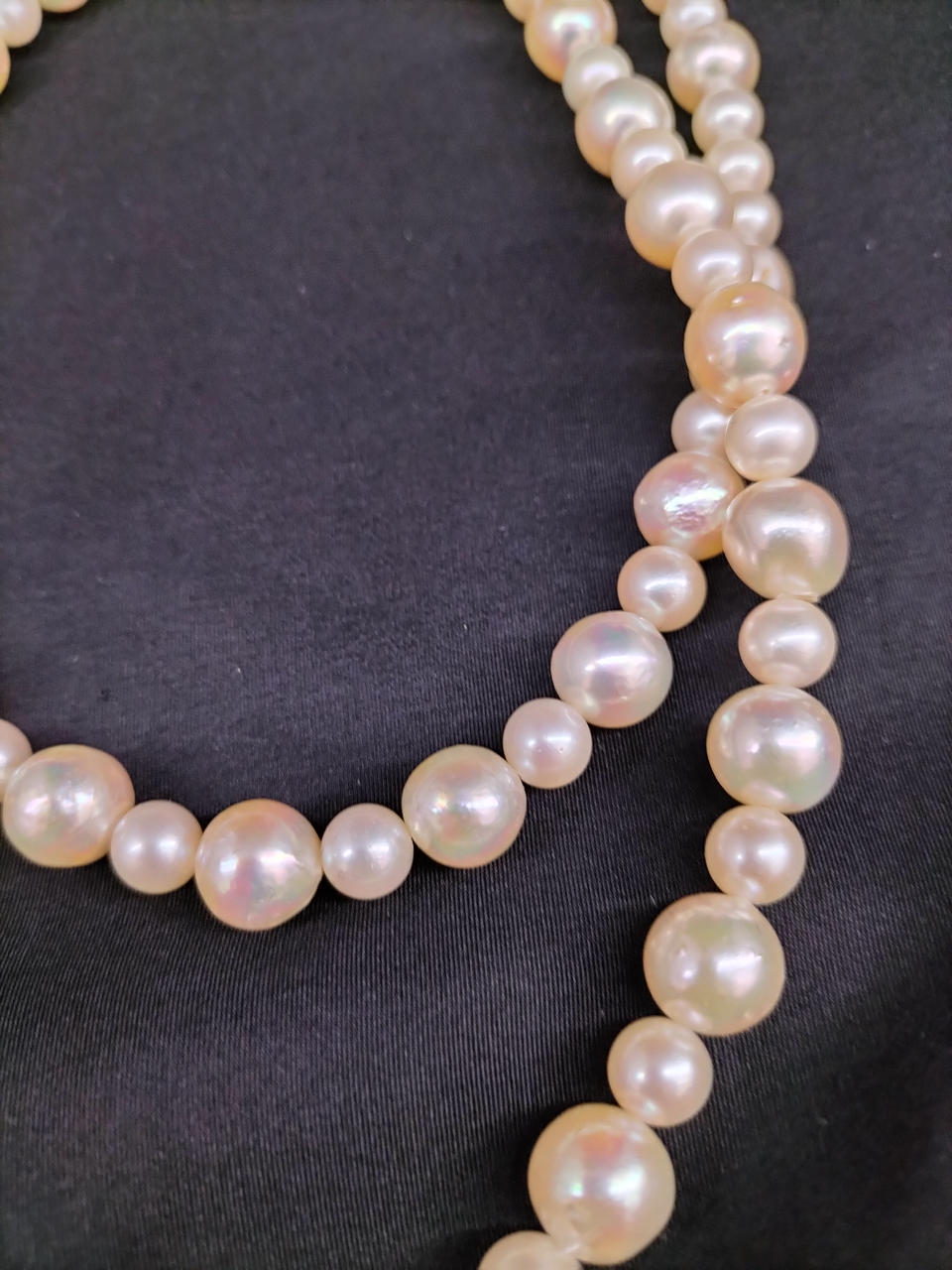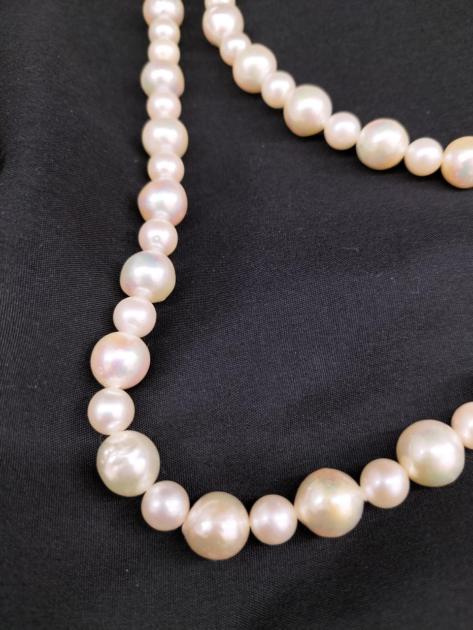ラウンドに近いバロックパールのロングネックレスです。大小大きさの異なる粒でデザインされ、エクボ「凹み」やツノ「突起」がナチュラルな真珠を物語っています。干渉色や艶の美しいお品です。