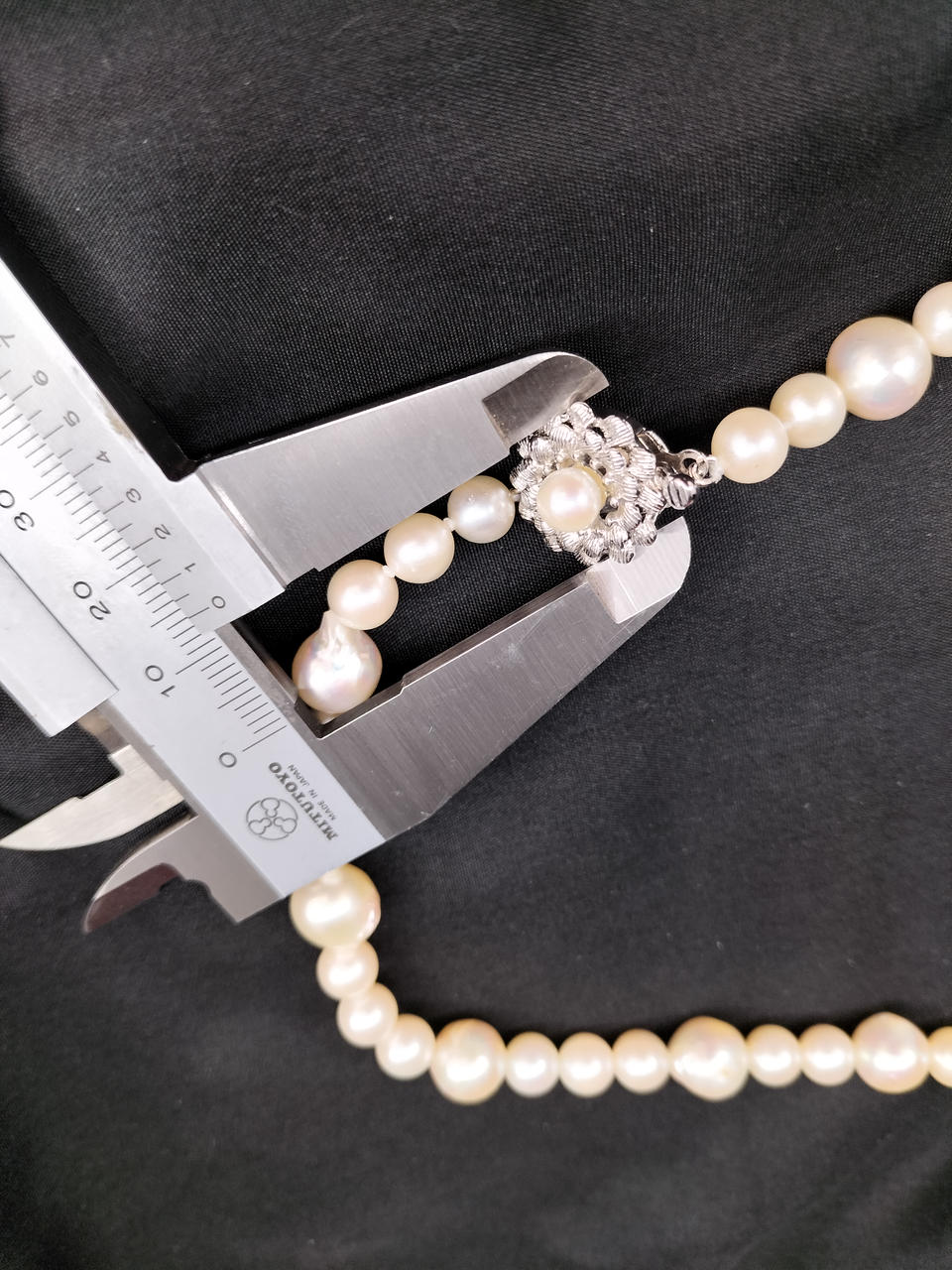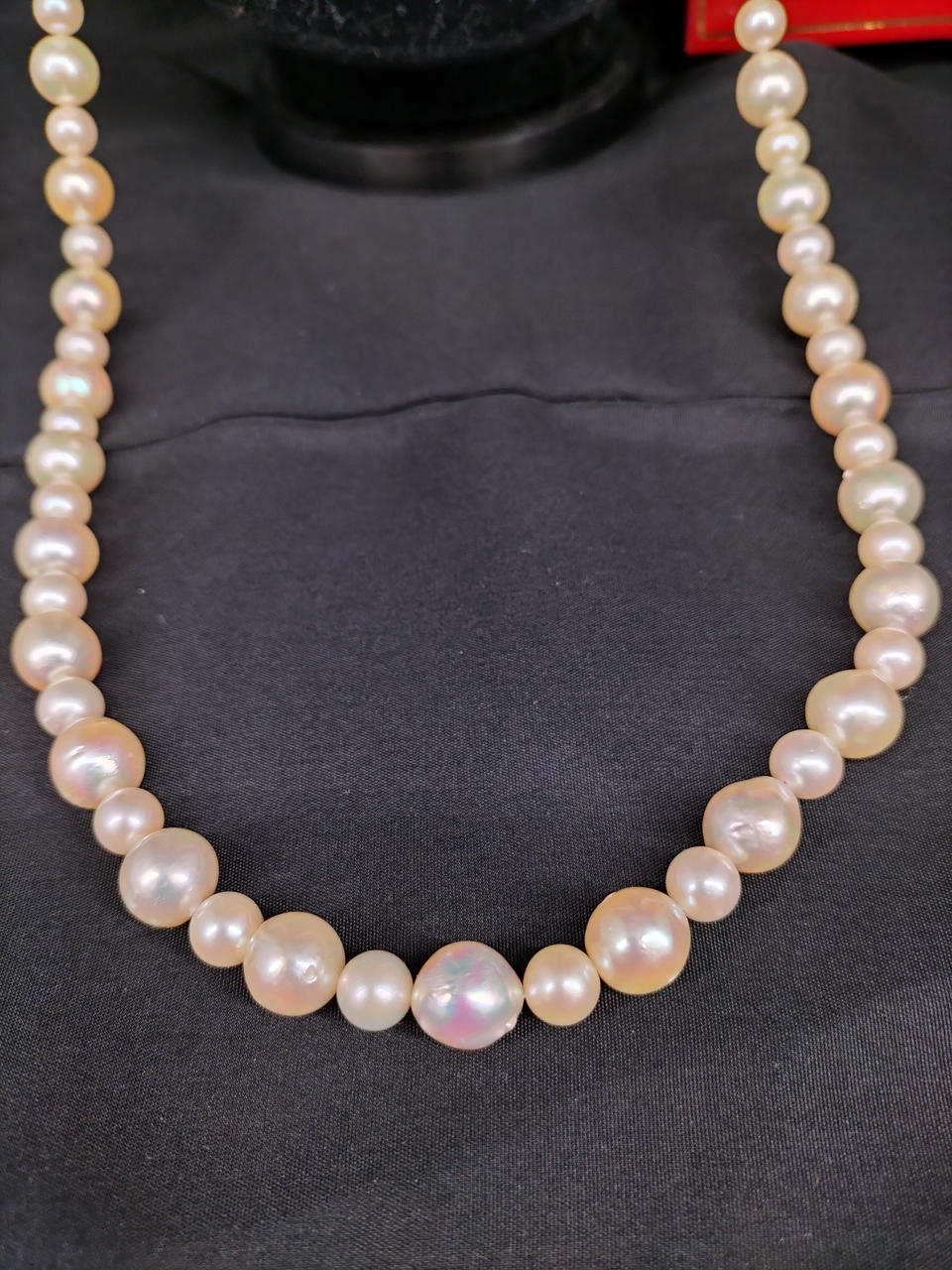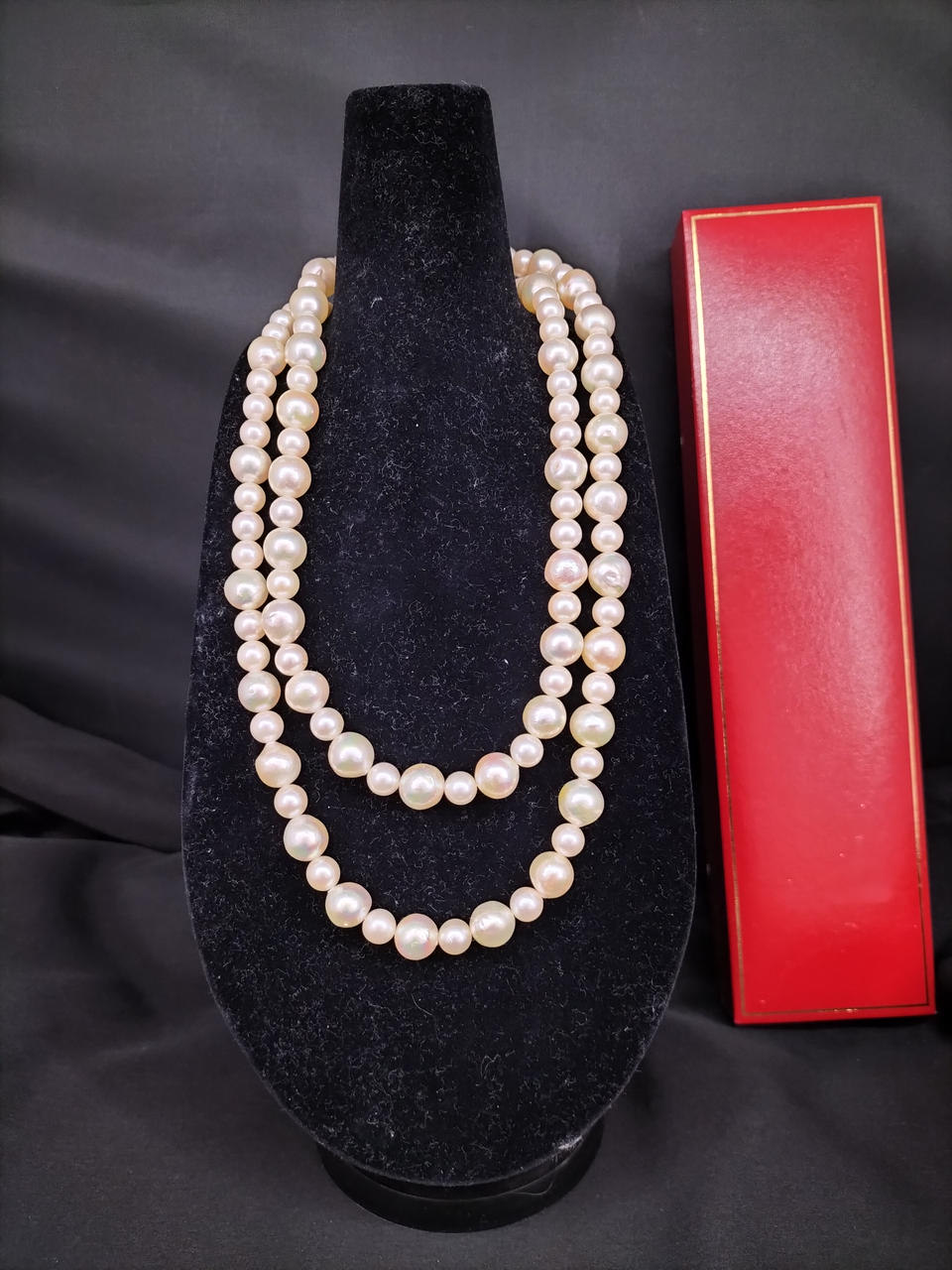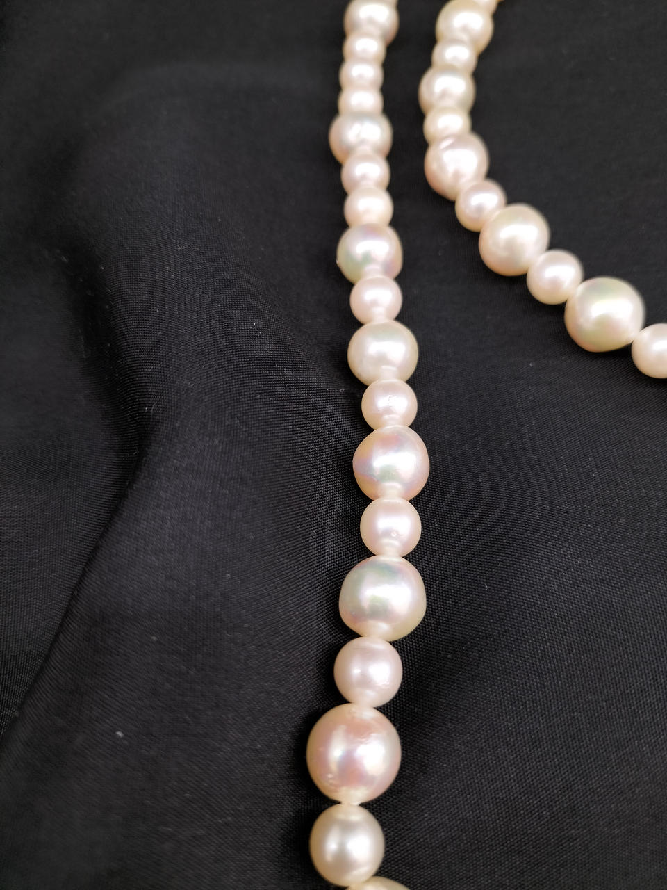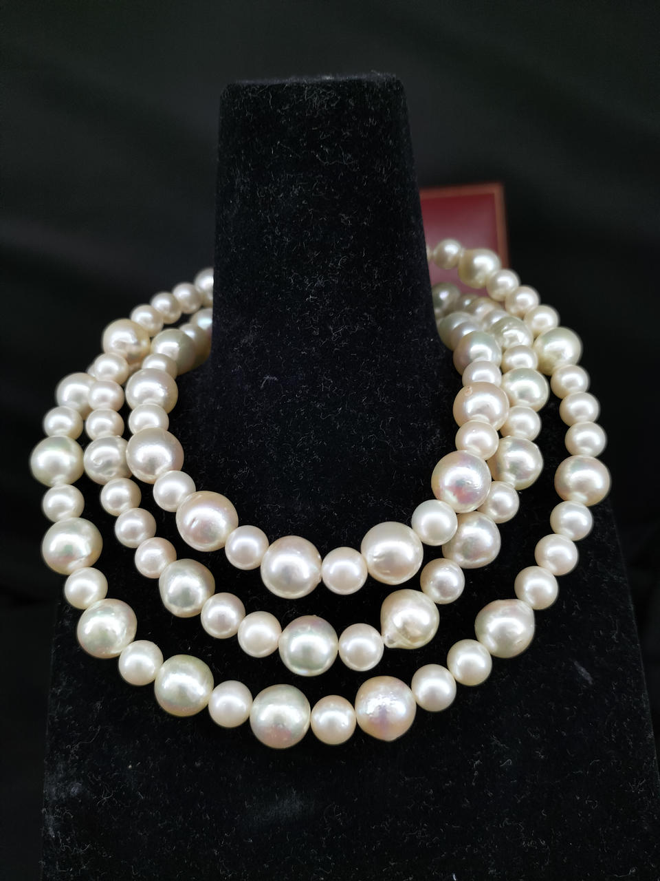 ラウンドに近いバロックパールのロングネックレスです。大小大きさの異なる粒でデザインされ、エクボ「凹み」やツノ「突起」がナチュラルな真珠を物語っています。干渉色や艶の美しいお品です。