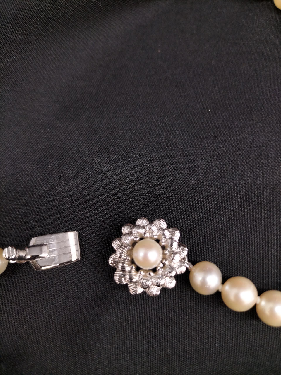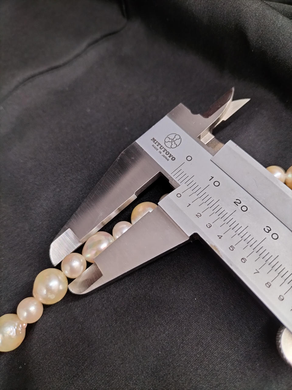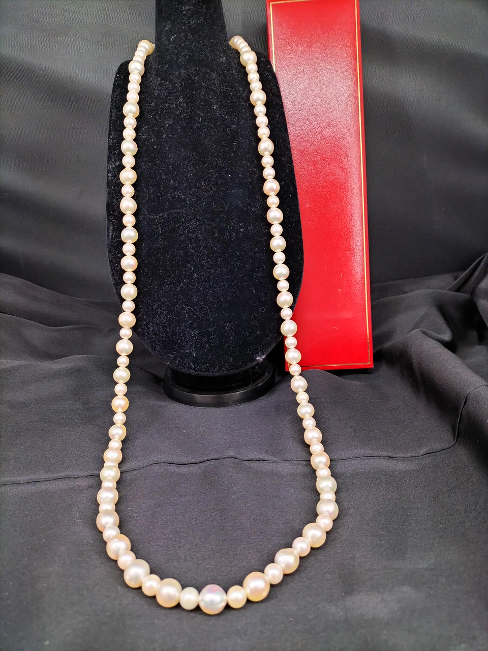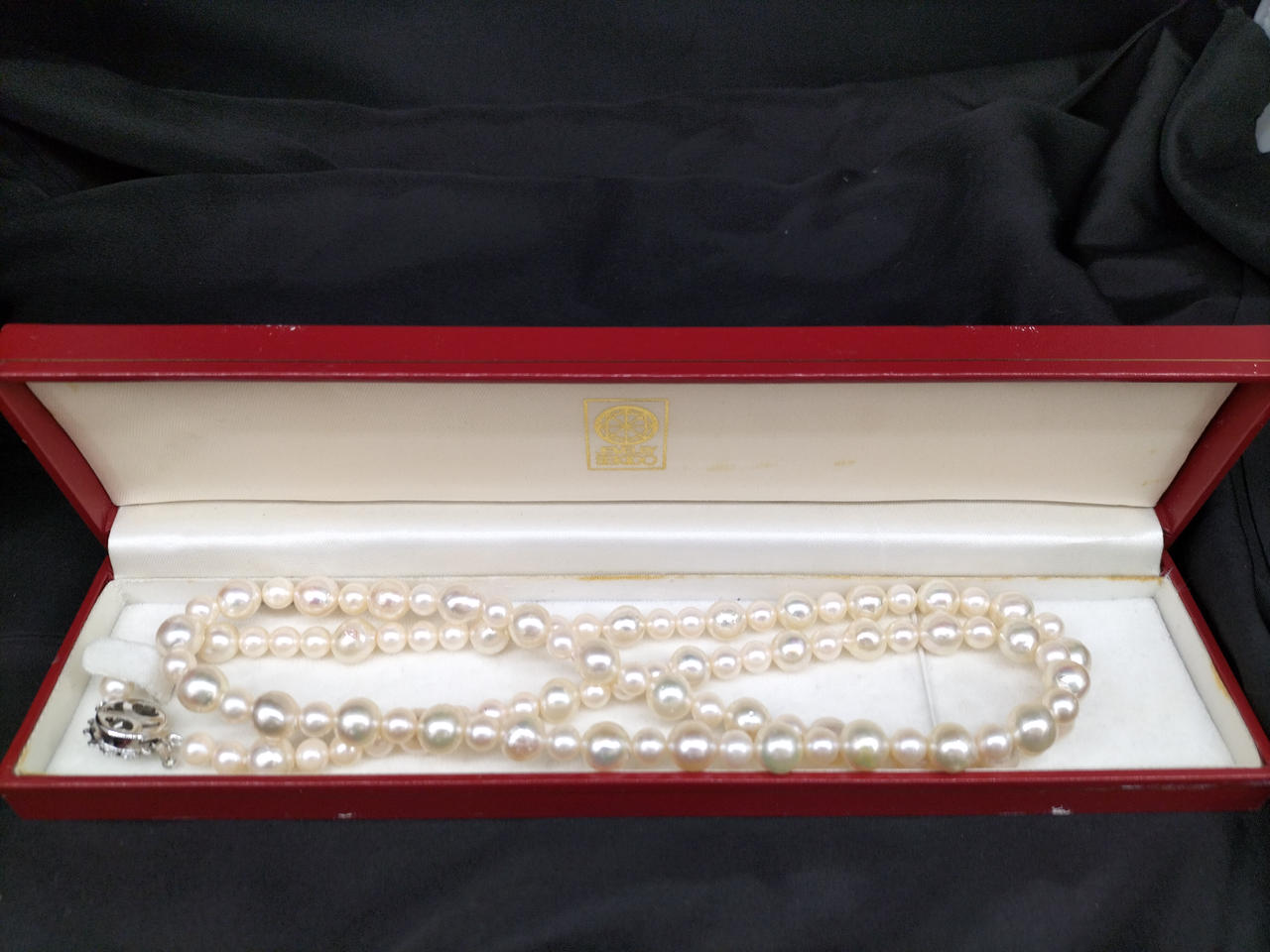 ラウンドに近いバロックパールのロングネックレスです。大小大きさの異なる粒でデザインされ、エクボ「凹み」やツノ「突起」がナチュラルな真珠を物語っています。干渉色や艶の美しいお品です。