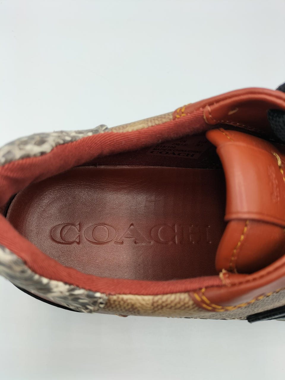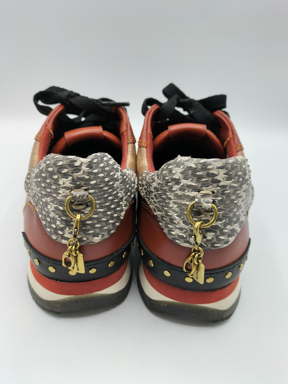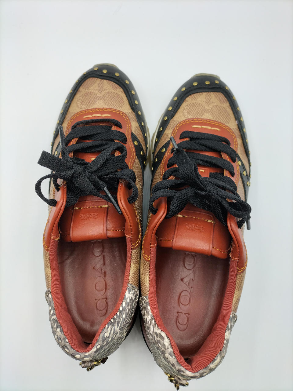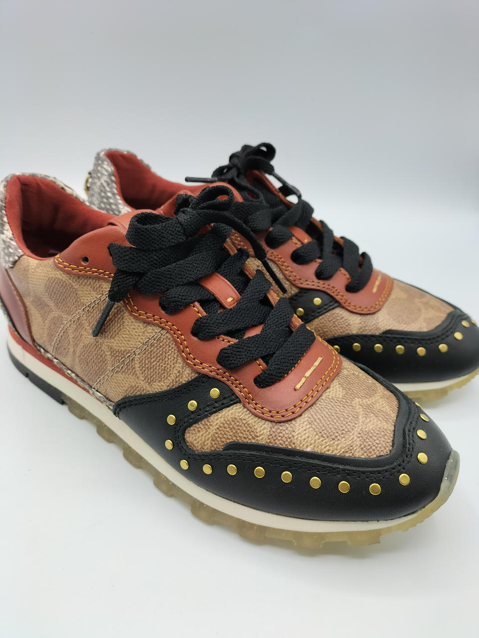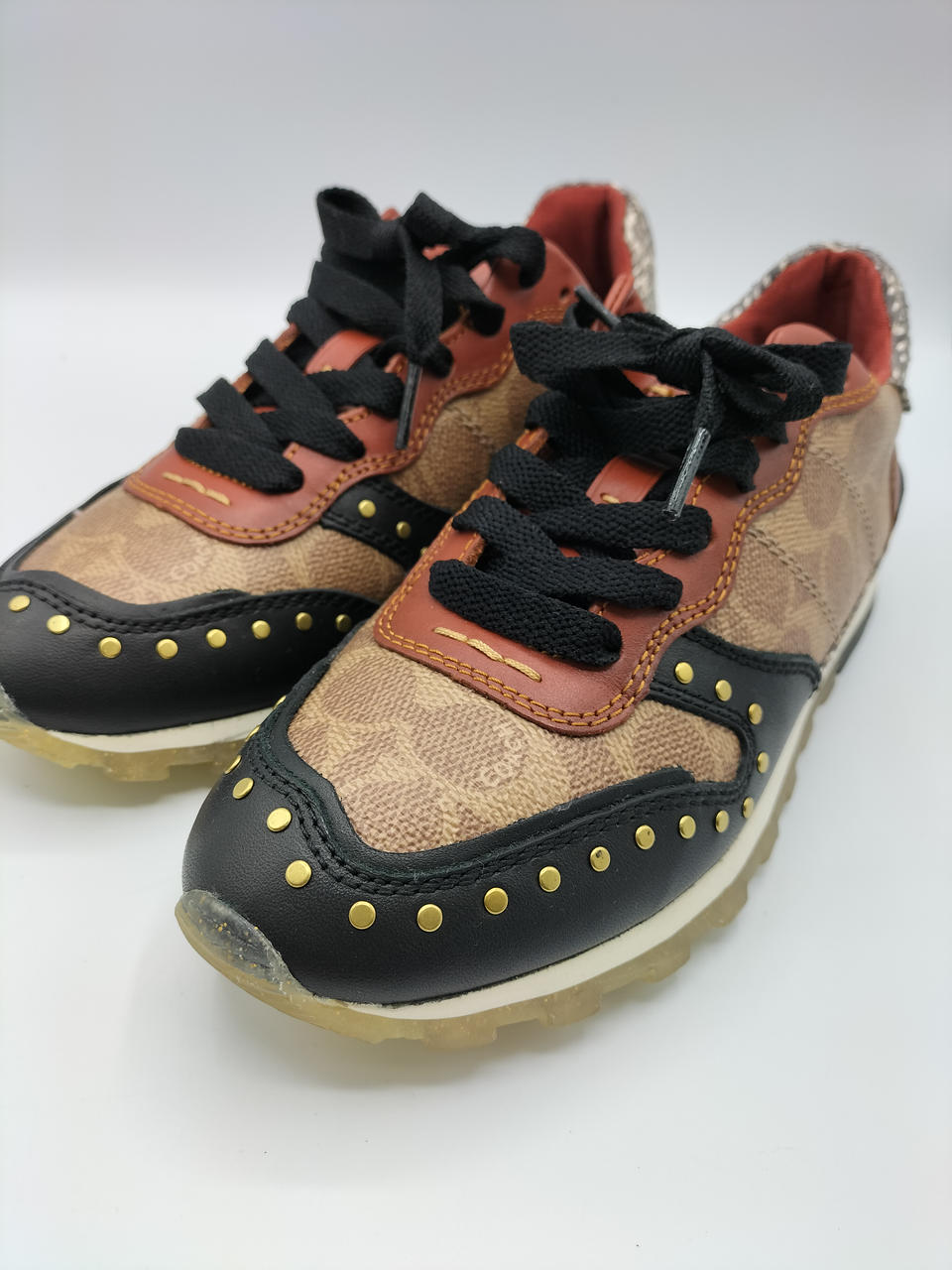 COACHのロゴが全面にデザインされており、高級感のある一足となっております。金色の金具が差し色になってかわいいです✨️
