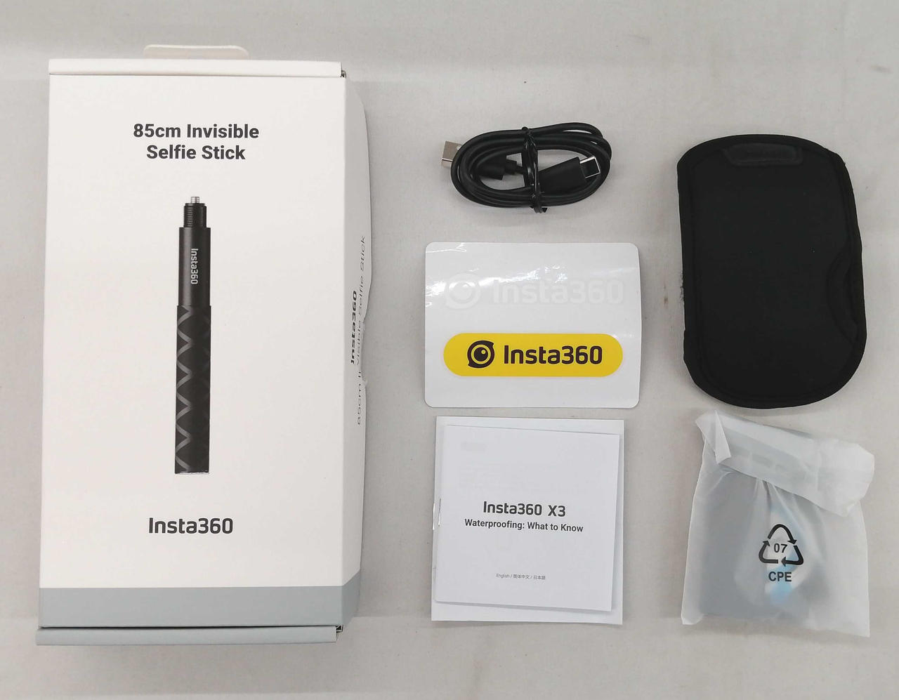 箱・取説・USBケーブル・ソフトケース・別売自撮り棒 |