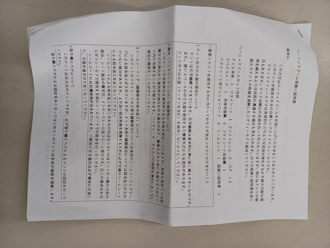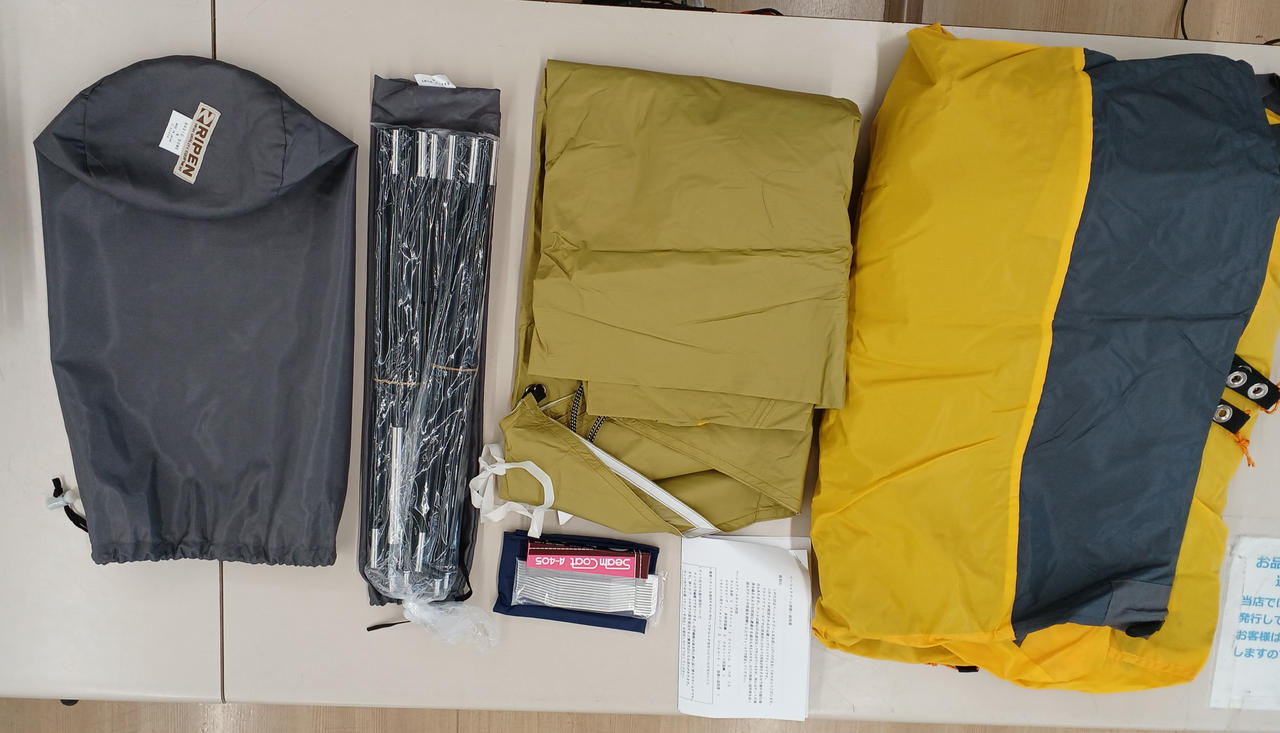 付属品:テント本体フライシートテントフレーム×2ペグ×13リペアスリーブ(フレーム補修用)張縄(シートに装着済)×5テンションコード×3(シートに装着済み)使用感少ない美品