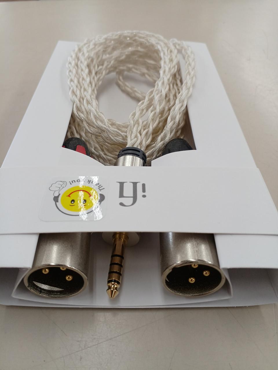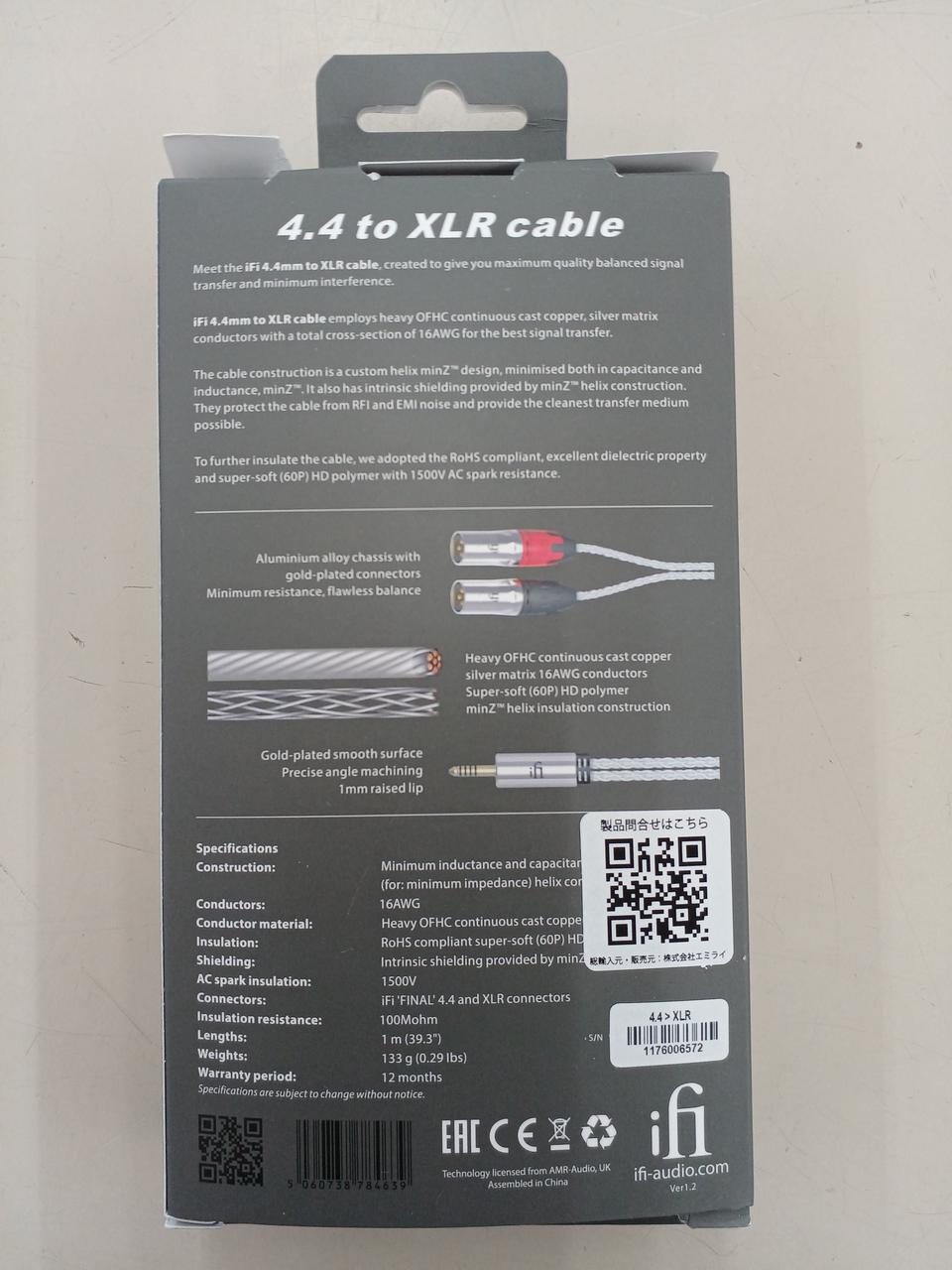 4.4mm- 3pin XLRオス x 2バランスケーブル。 長さ2m(分岐部からXLRコネクターまで1m)最高品質のバランス信号伝送と最小干渉を実現するために作られたiFi 4.4mm to XLR cableは、極太OFHC(無酸素銅)の連続鍛造銅と、銀メッキを用いたトータル・クロス・セクション(断面積)が16AWGの導線を使用して、最高の信号伝送を実現しています。ケーブルの構造は、特製のヘリックス(螺旋)デザインです。線間容量/インダクタンス/インピーダンスの関係においてインピーダンスが最小になるように設計してあります。ヘリックス構造によって、独自のシールド効果が実現しています。RFI/EMIノイズからケーブルを保護し、可能な限り最高にクリーンな伝送媒体を生み出しているのです。ケーブルをさらに絶縁するために、RoHS(ローズ。電子・電気機器における特定有害物質の使用制限についてのEUによる指令)準拠の優れた誘電特製と極度に柔軟な1500V ACスパーク抵抗を持ったHDポリマーを採用しています。 |
