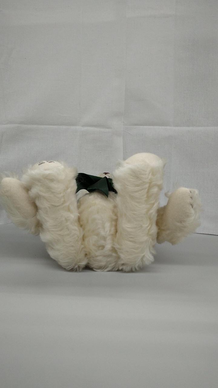 柔らかな白い毛並みと緑色のリボンが特徴的です。