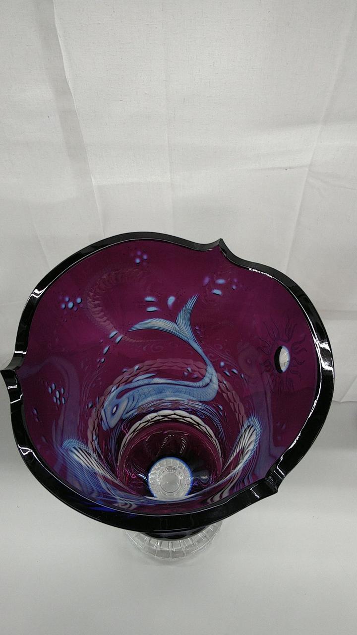 鮮やかな紫色のクリスタルガラスに、精巧なドラゴンのモチーフと魚が彫刻されています。