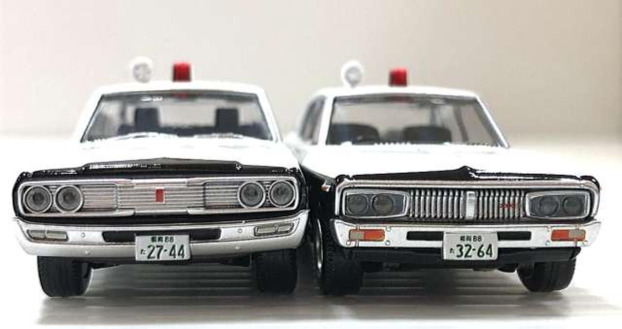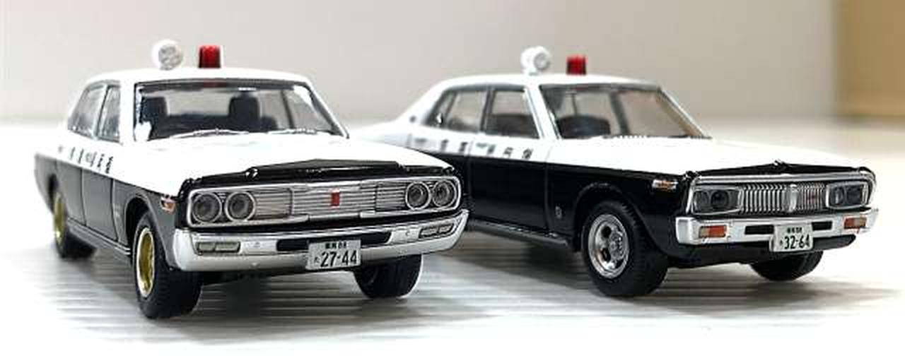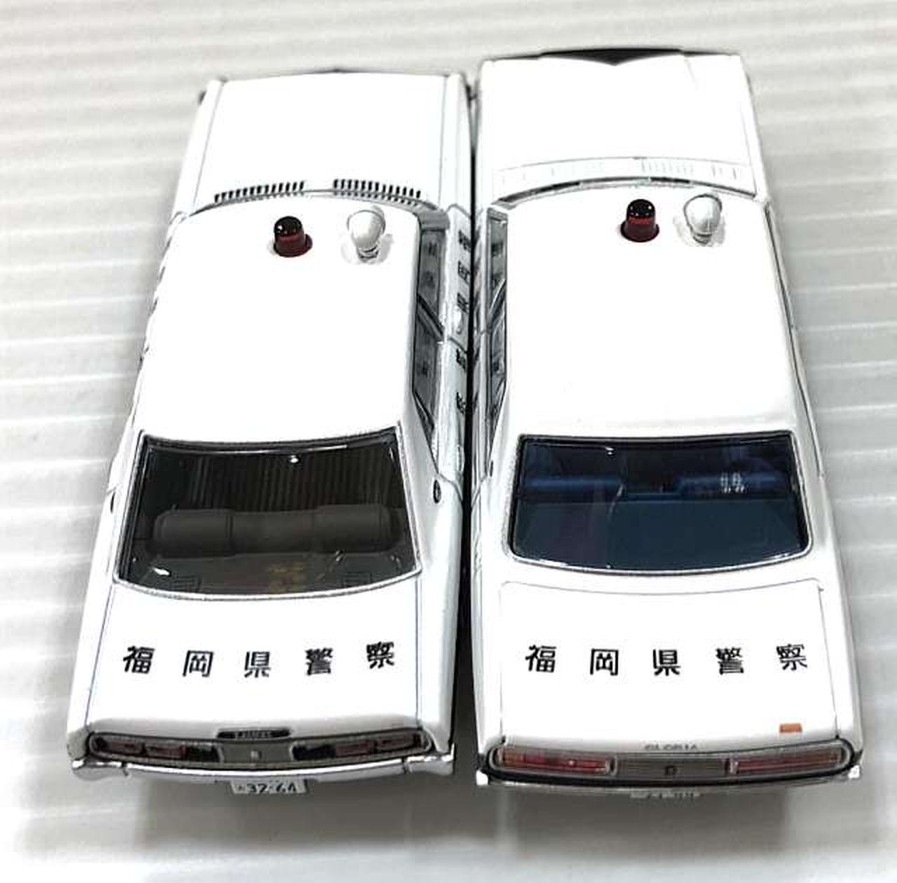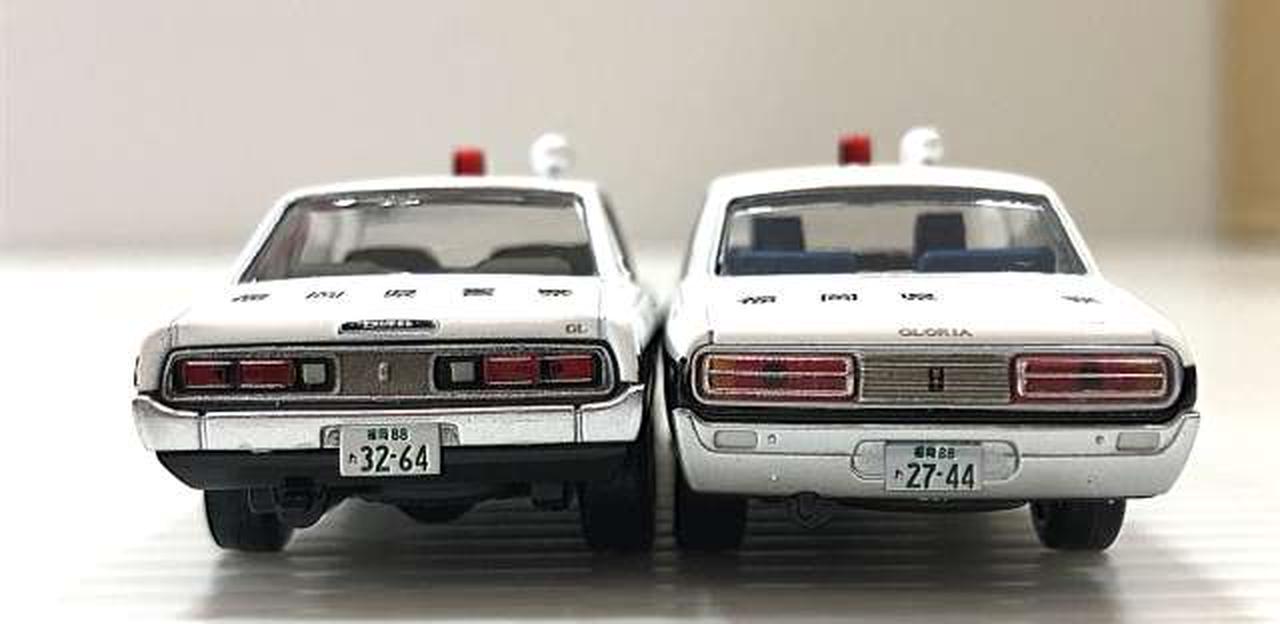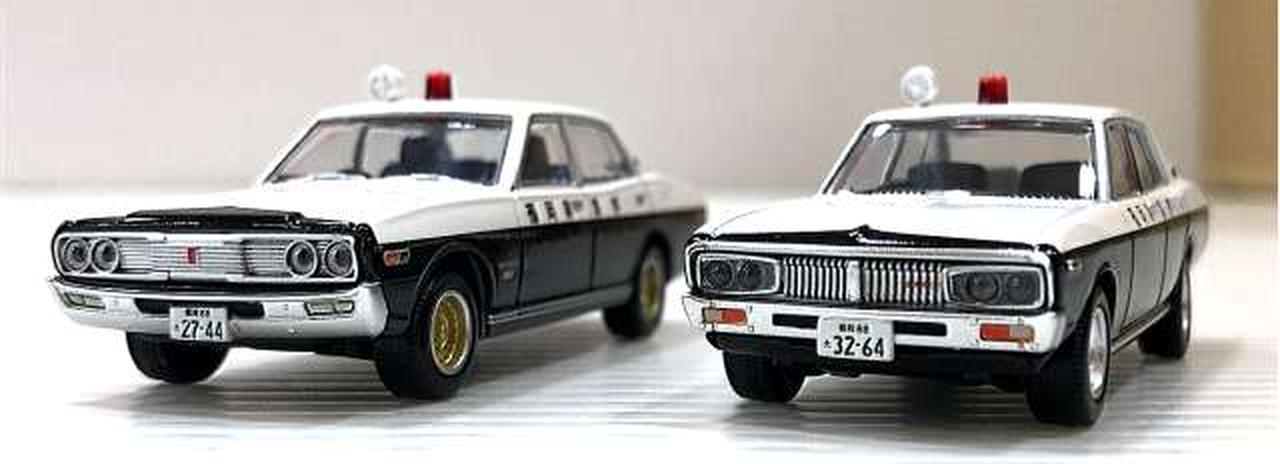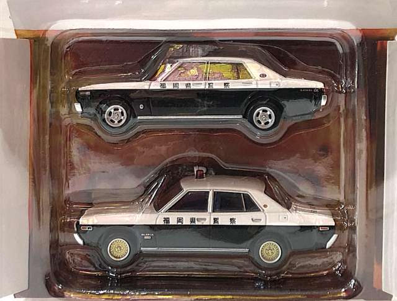 今回は、2代目ローレルセダンをベースにしたパトカー(おそらく「博多北23号」と思われる車両)と、それを飛び越える大アクションを演じた 230型グロリアのパトカーです。 |