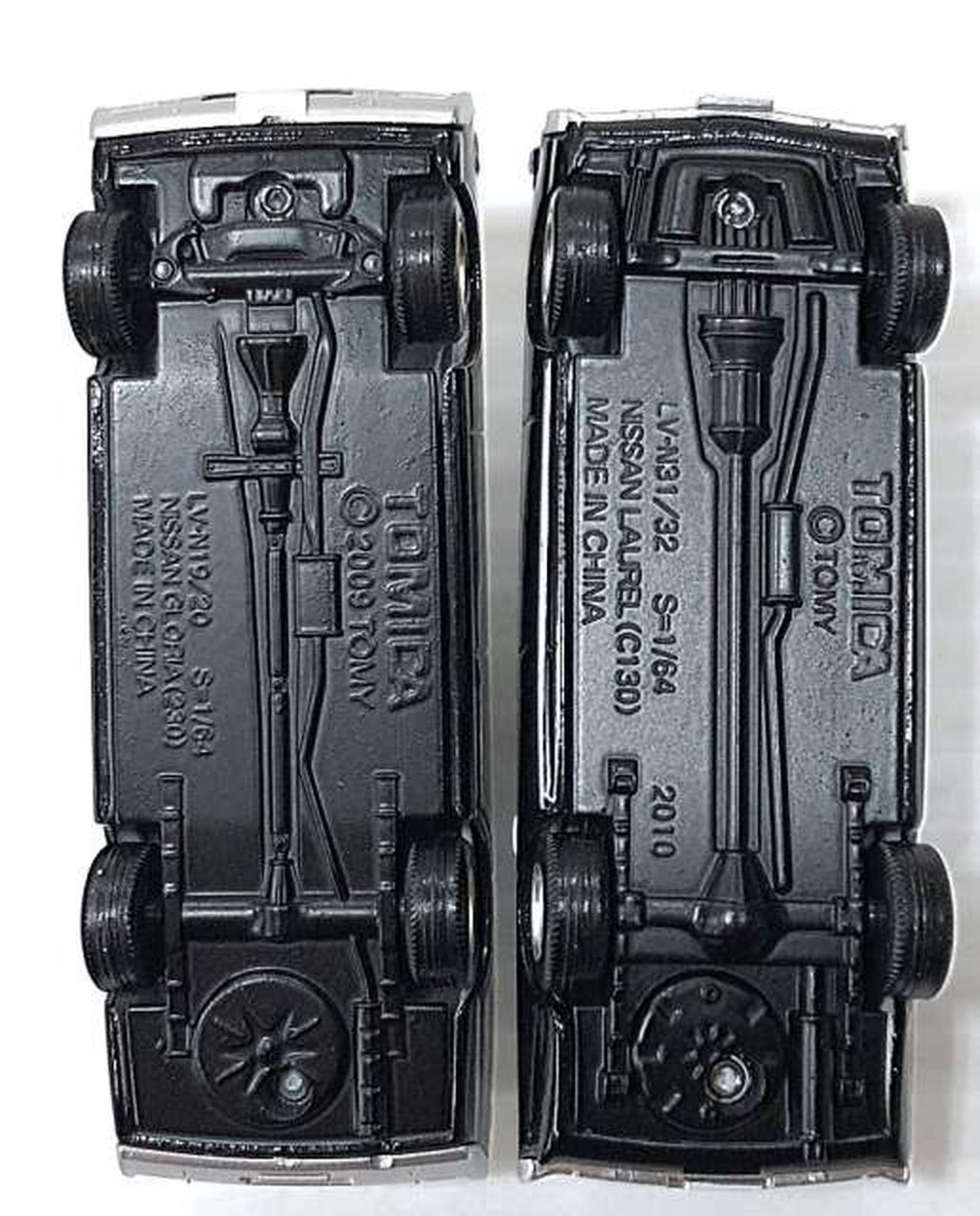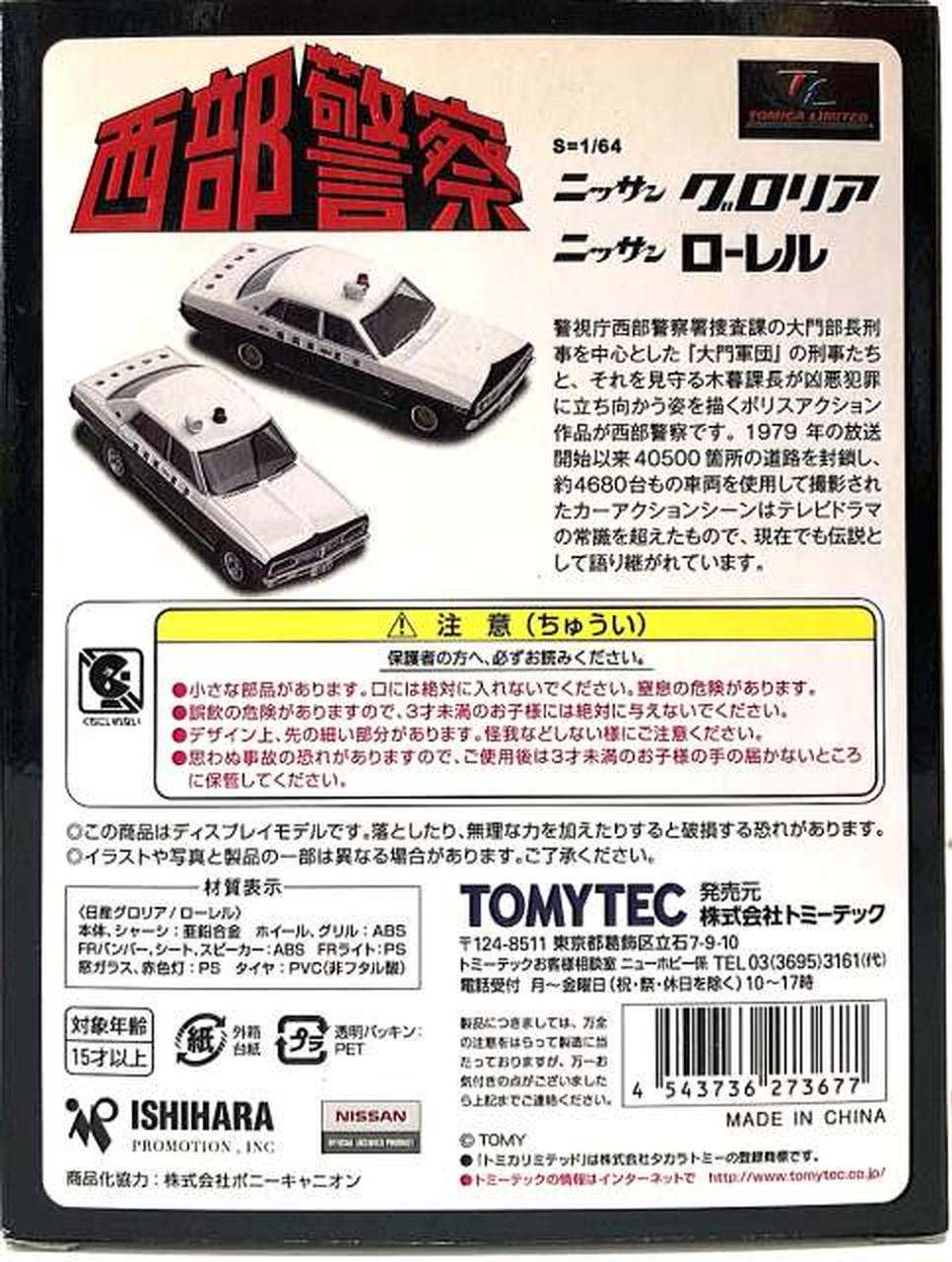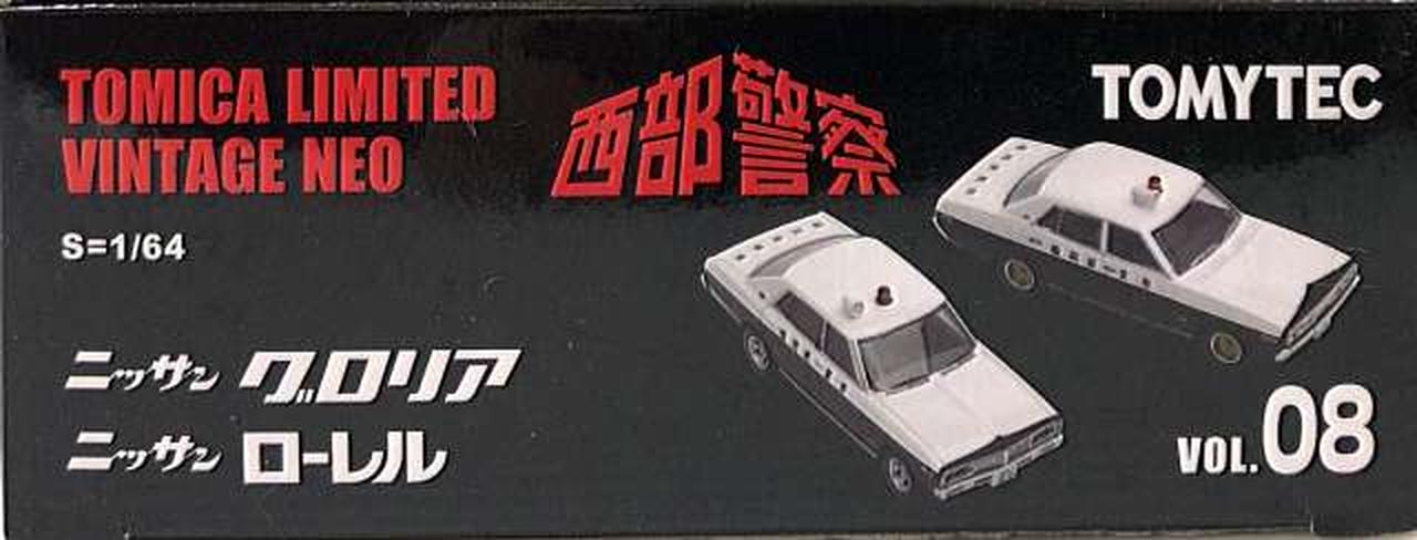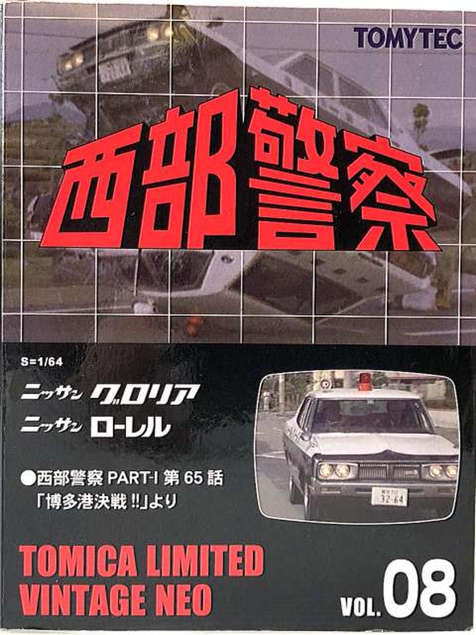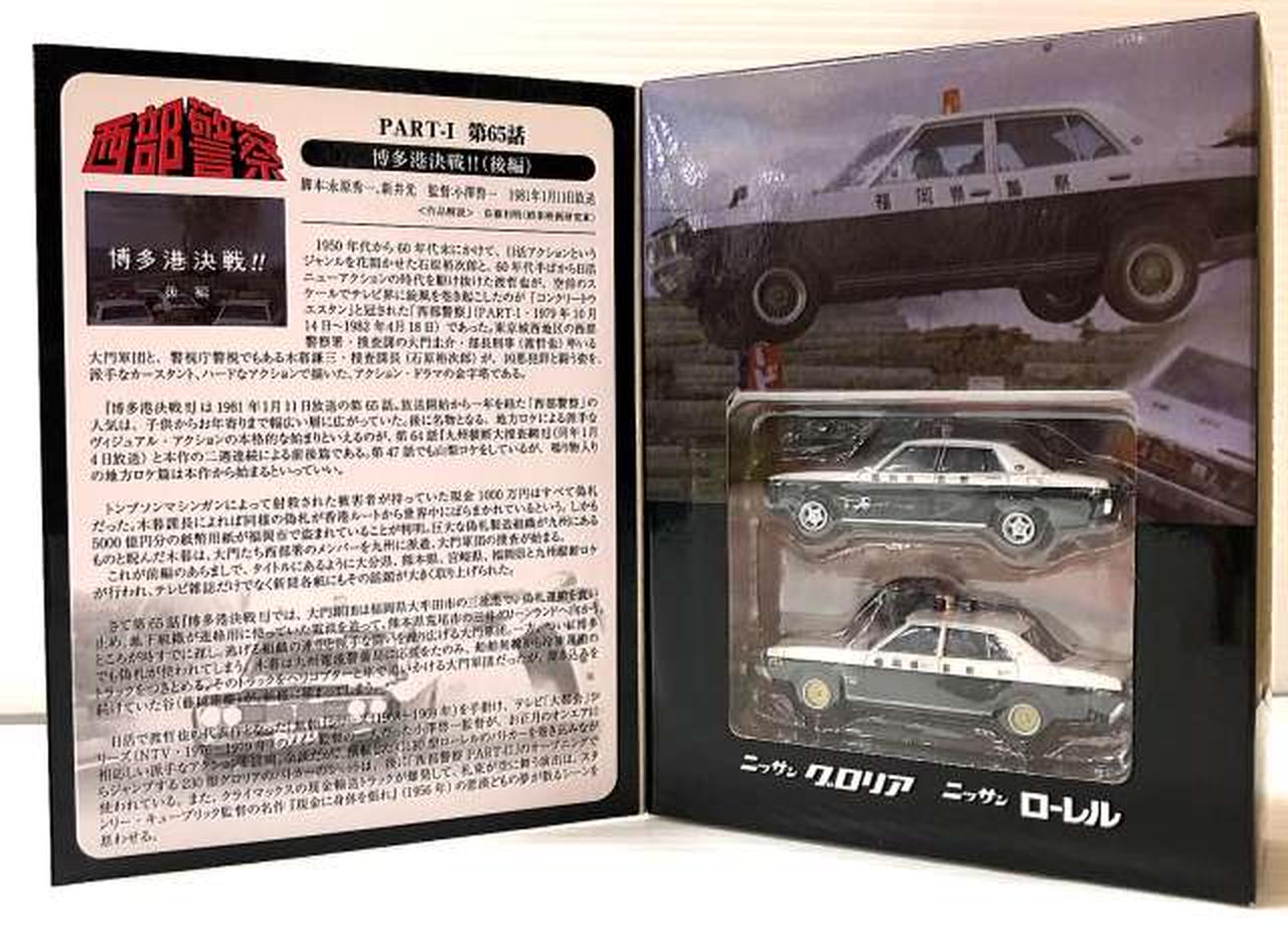 今回は、2代目ローレルセダンをベースにしたパトカー(おそらく「博多北23号」と思われる車両)と、それを飛び越える大アクションを演じた 230型グロリアのパトカーです。 |