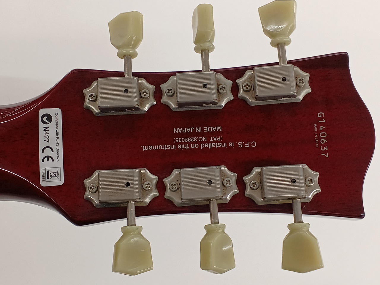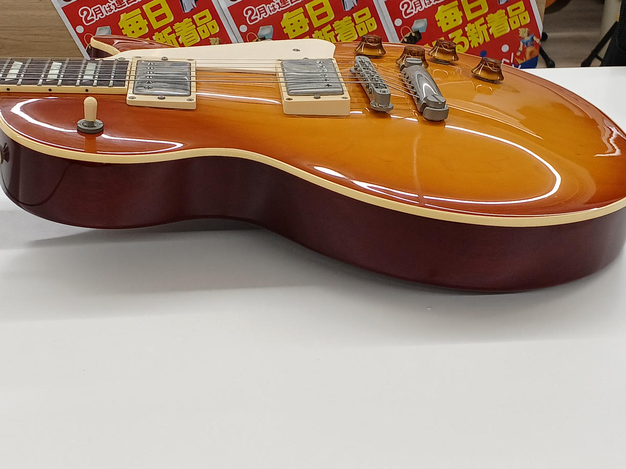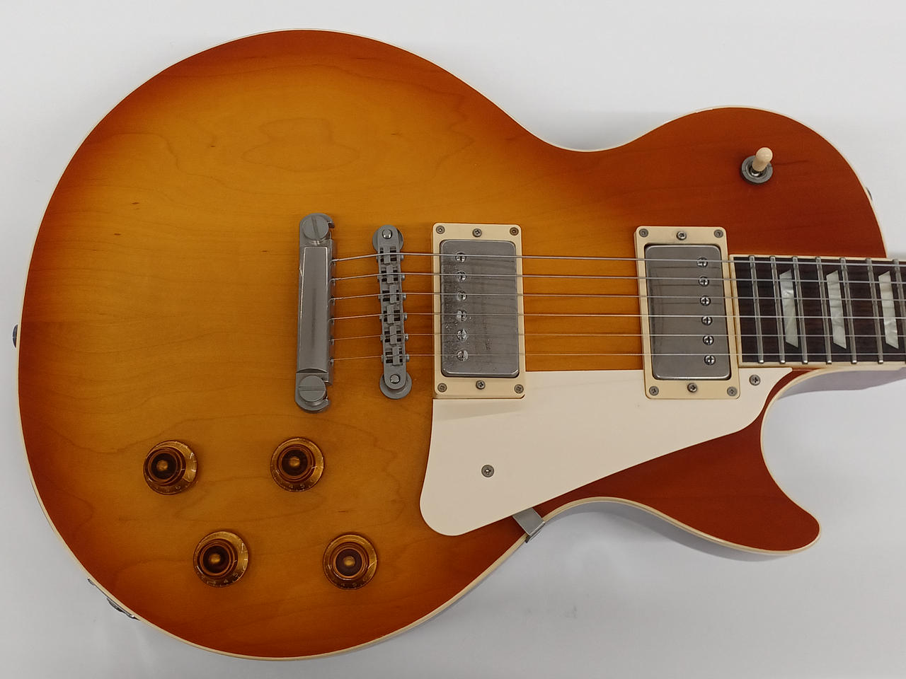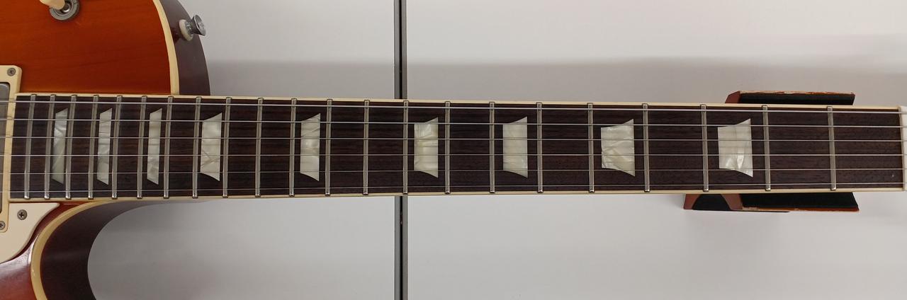 フレイムメイプルの化粧板+メイプルボディトップ、ローズウッド指板、フェイデッドチェリーバーストカラーという組み合わせ。