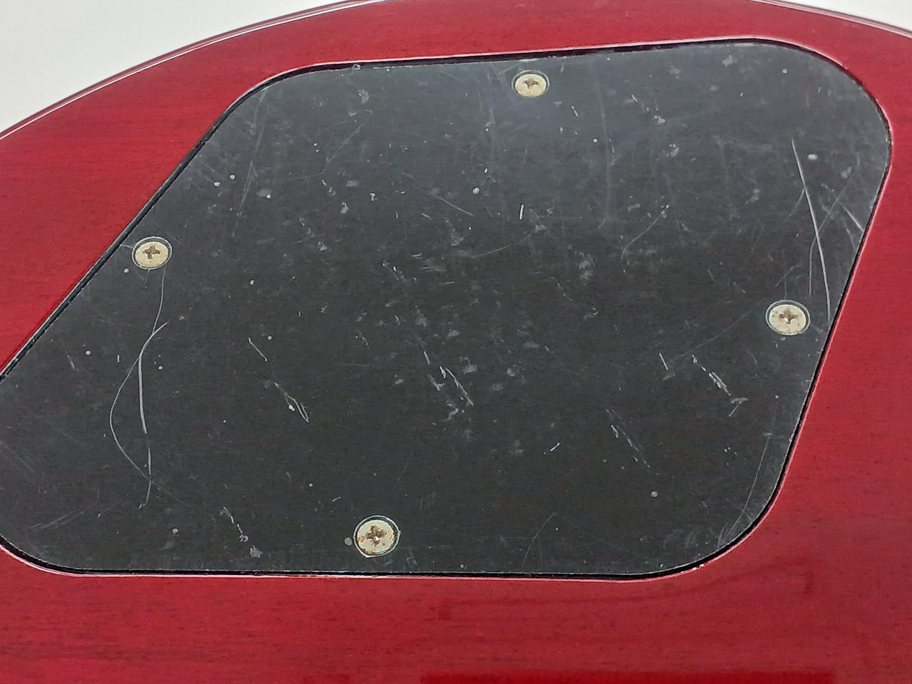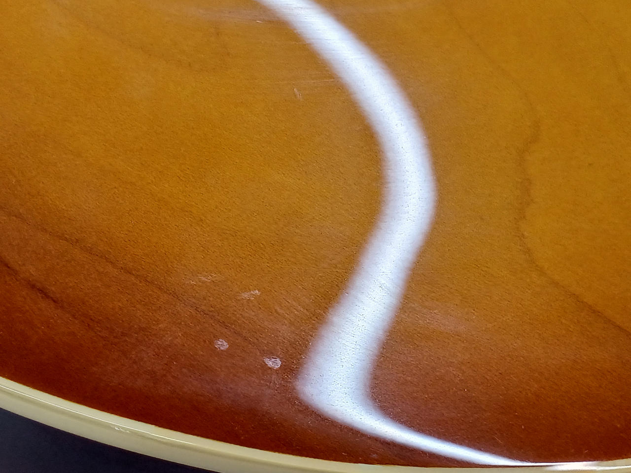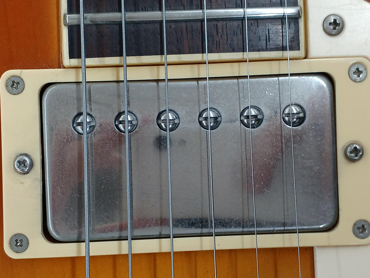 フレイムメイプルの化粧板+メイプルボディトップ、ローズウッド指板、フェイデッドチェリーバーストカラーという組み合わせ。