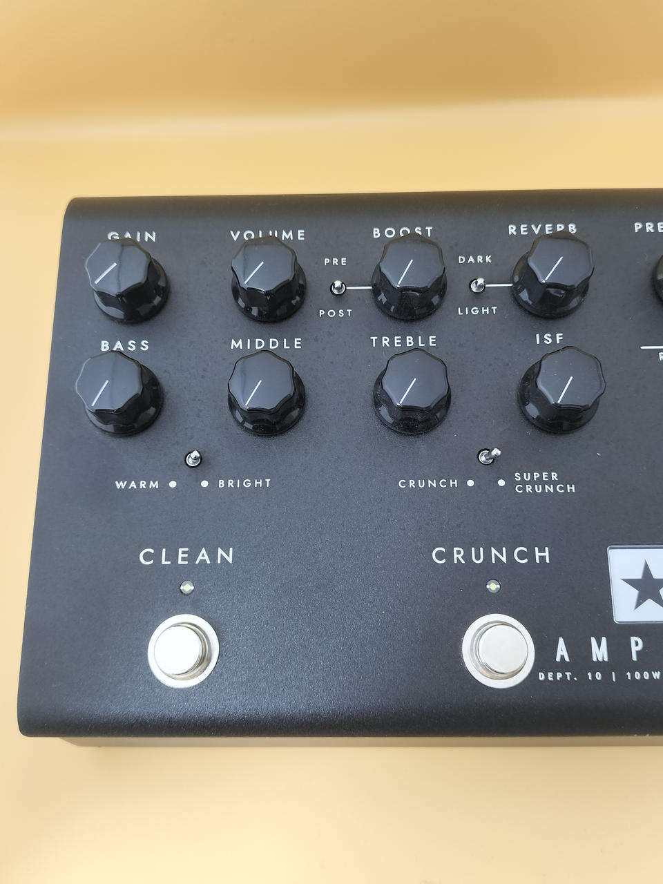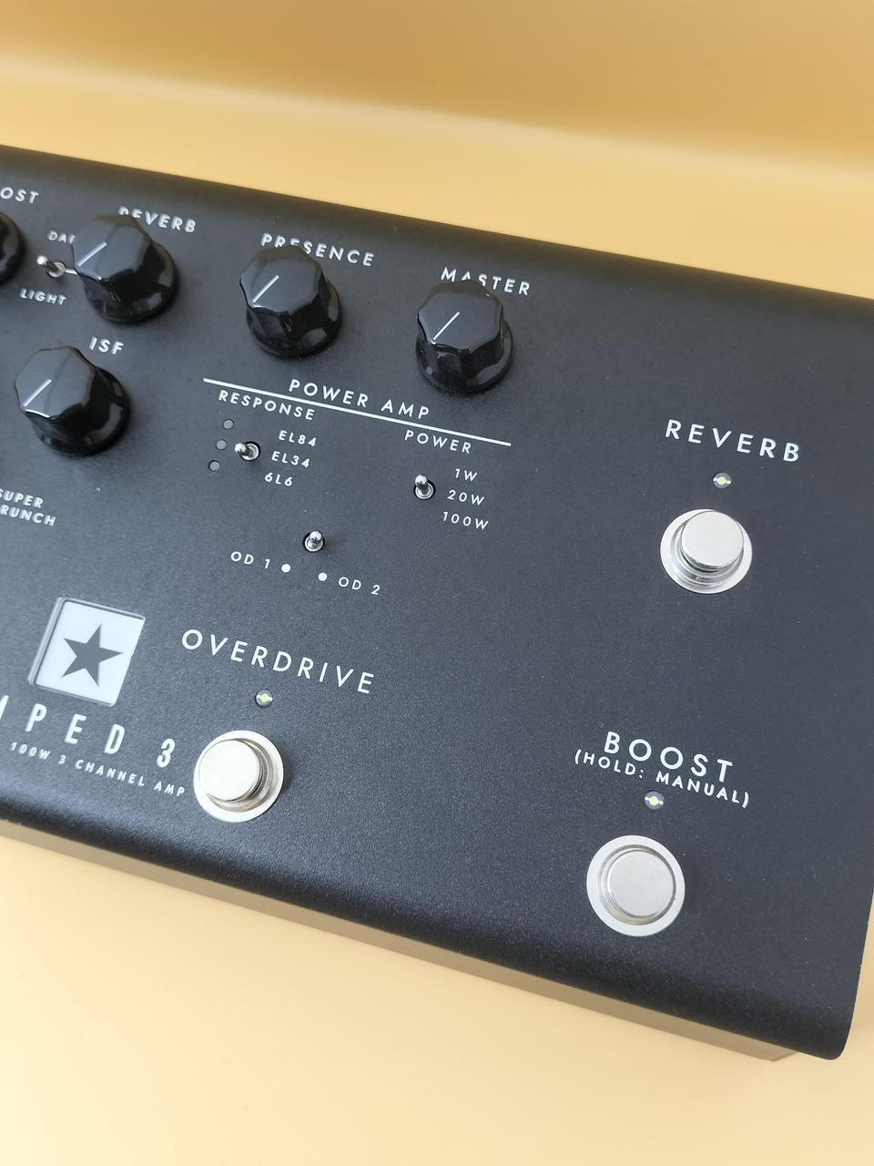 6 つのボイシングと3 つのプログラマブル・チャンネル、そしてリバーブを備えたペダル型アンプ。最大100W のキャビネットへの出力、ダイレクト出力、従来のフロントエンドとして使用可能。 |
