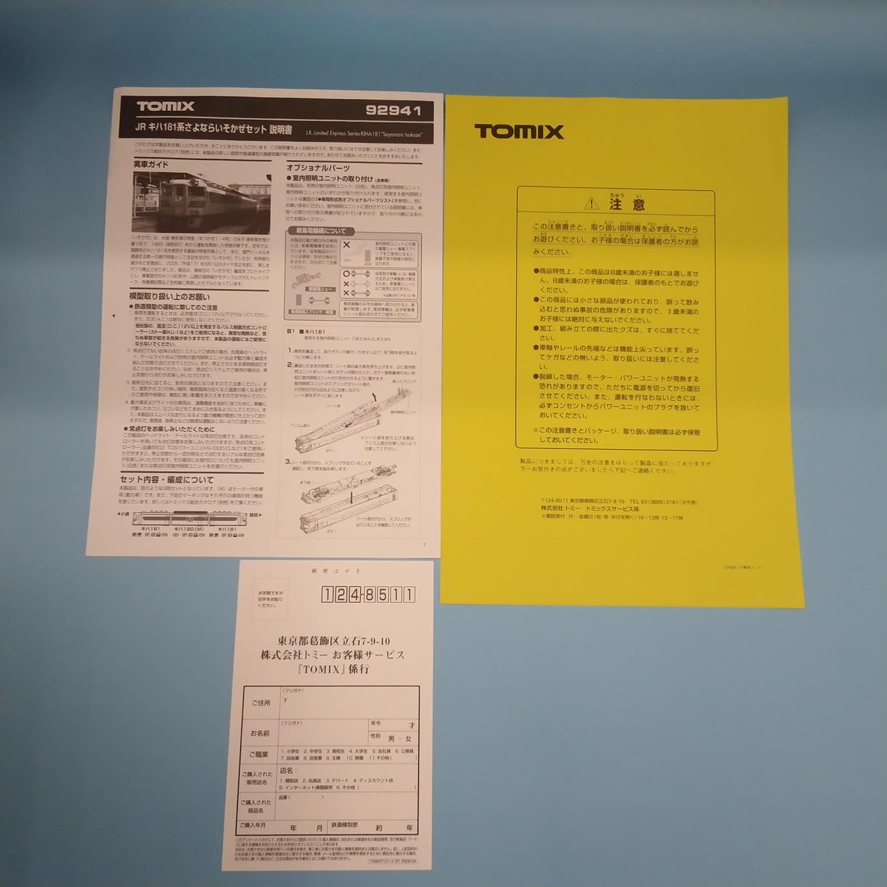取扱説明書、注意書、ハガキ |