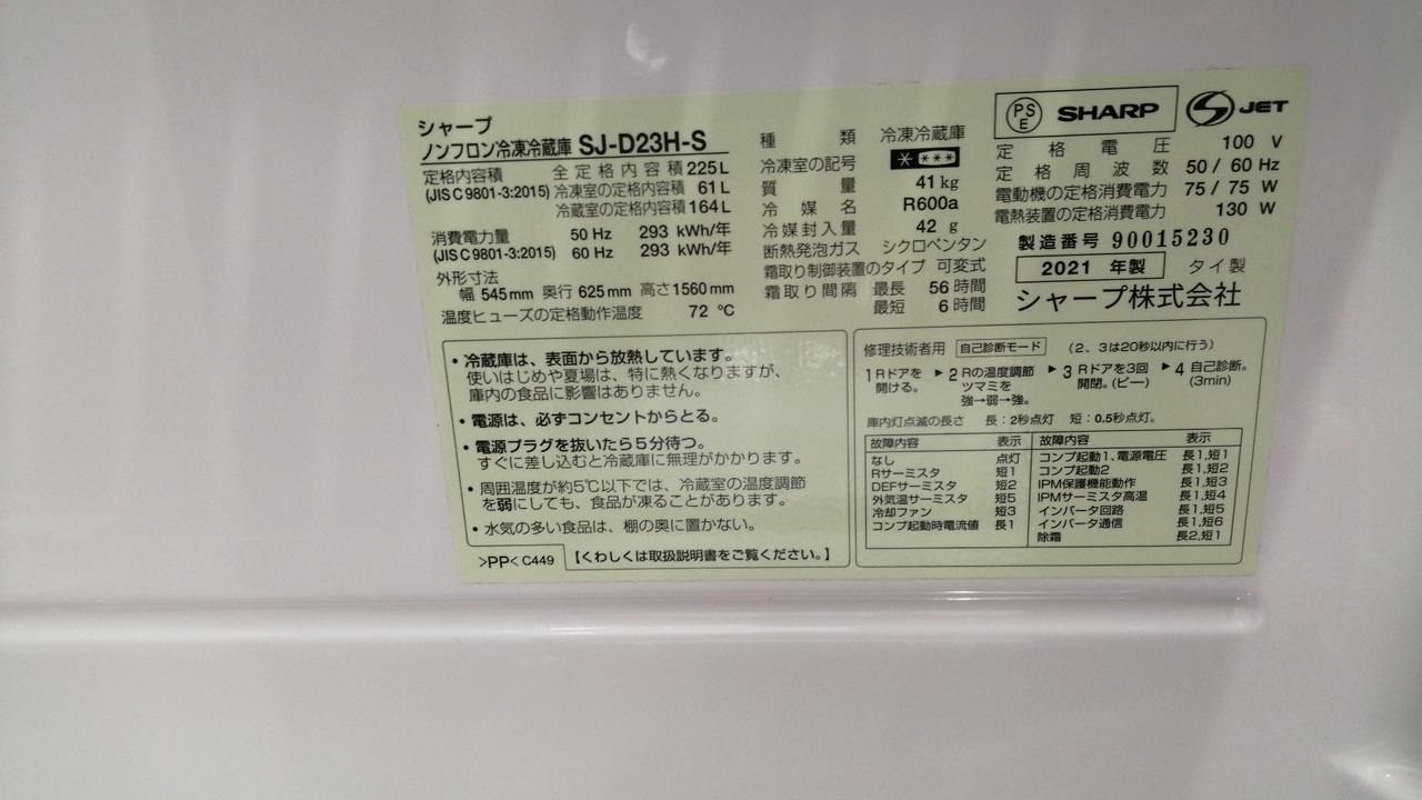 2021年 SHARP製 冷蔵庫 |