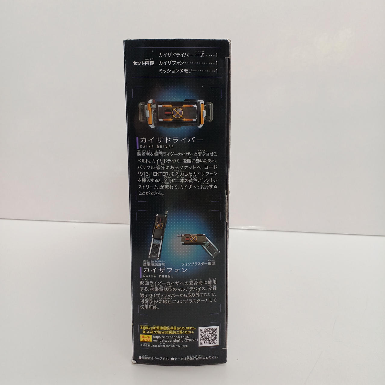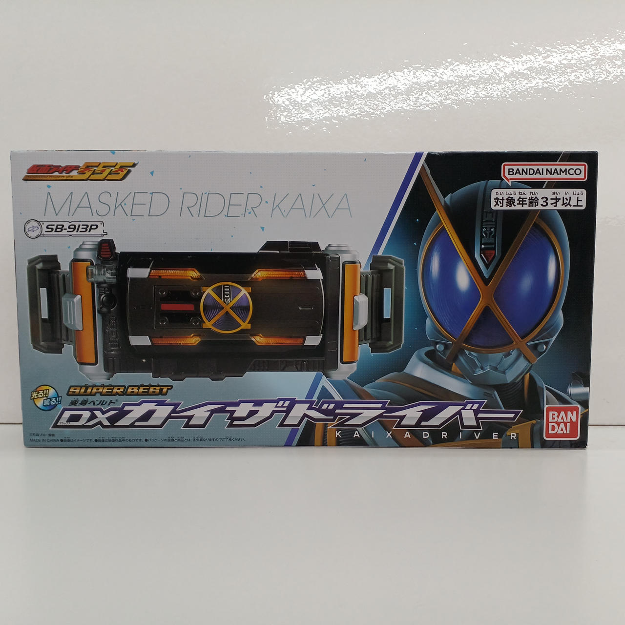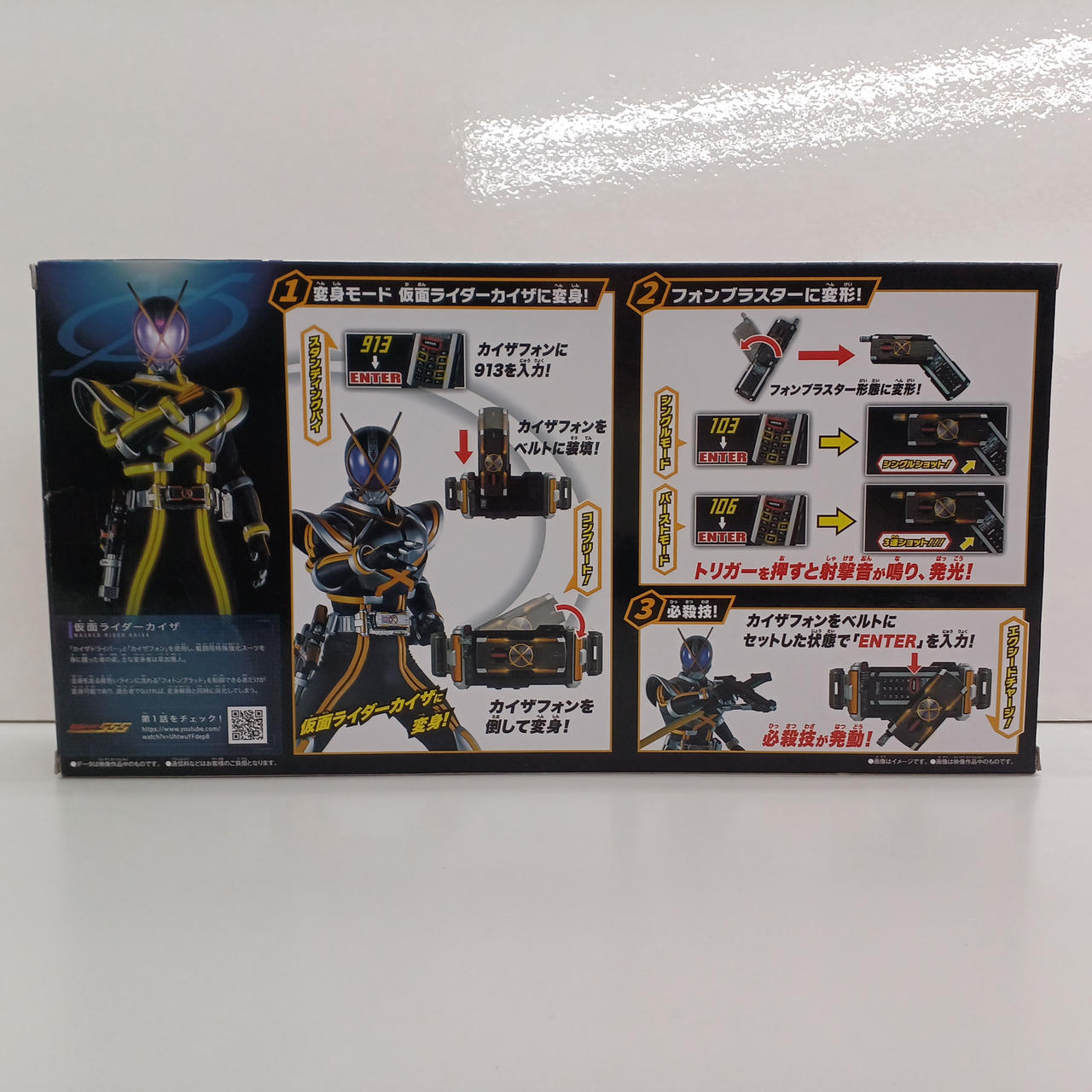 913」「ENTER」を入力したカイザフォンをベルトにセットすると、変身音が鳴りLEDが発光! |