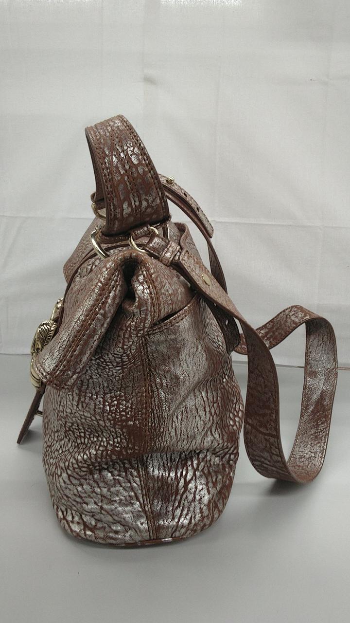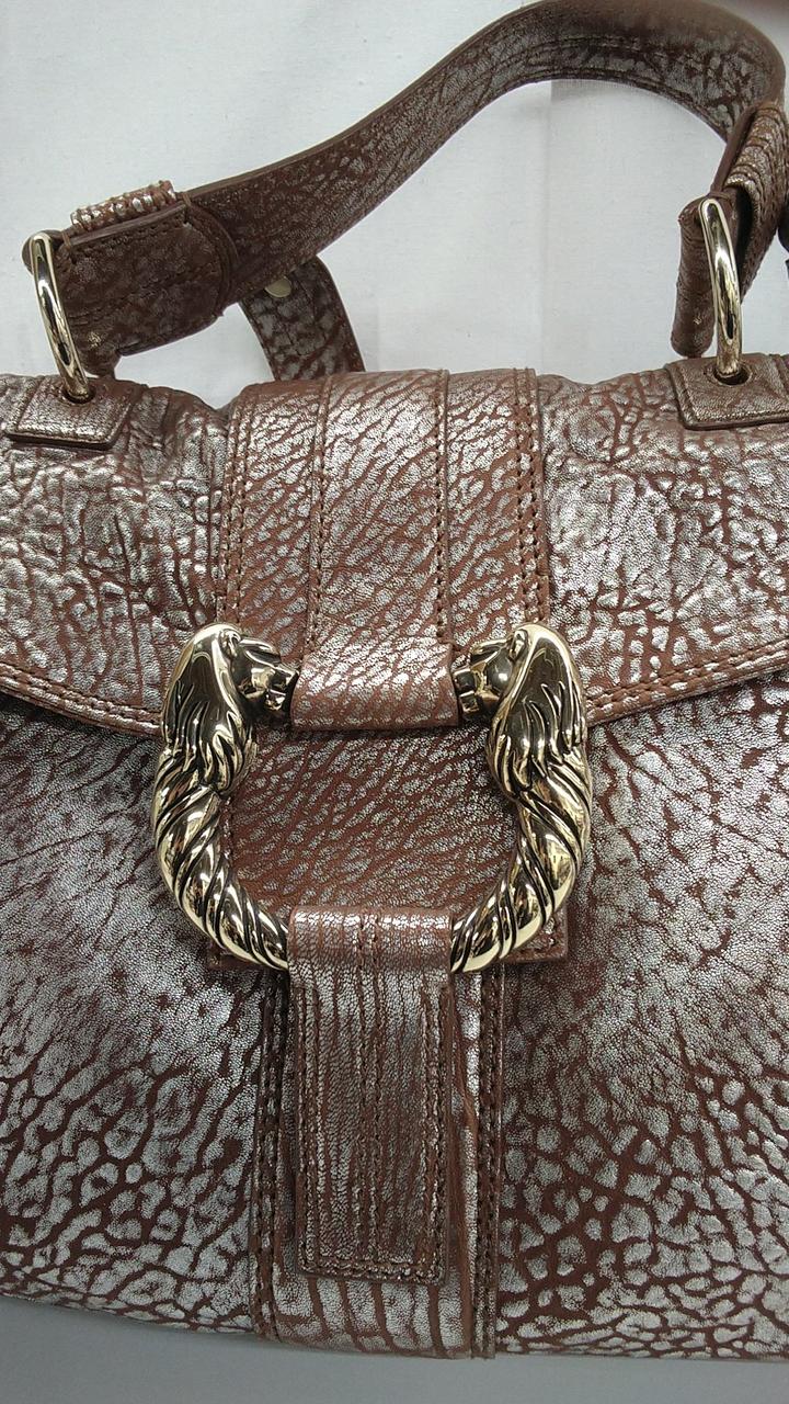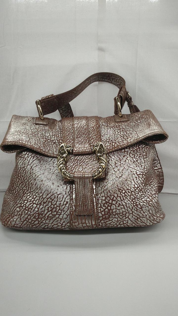 ショルダーとしても使える2WAY仕様で、ライオンモチーフの金具が特徴的なメタリックレザーモデルとなっております。